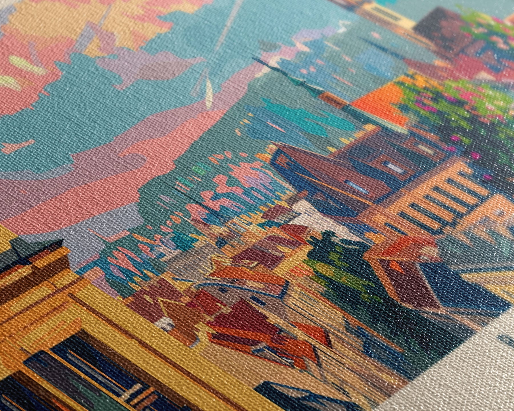 Most of our canvases are made in the USA, with the exception of canvases ordered with the light oak unstained frames, and any large canvases (24x48, 30x60, 16x48 and 20x60) ordered WITH a frame. These are temporarily made in and shipped from Europe, while we try to find a more consistent supplier in the USA.