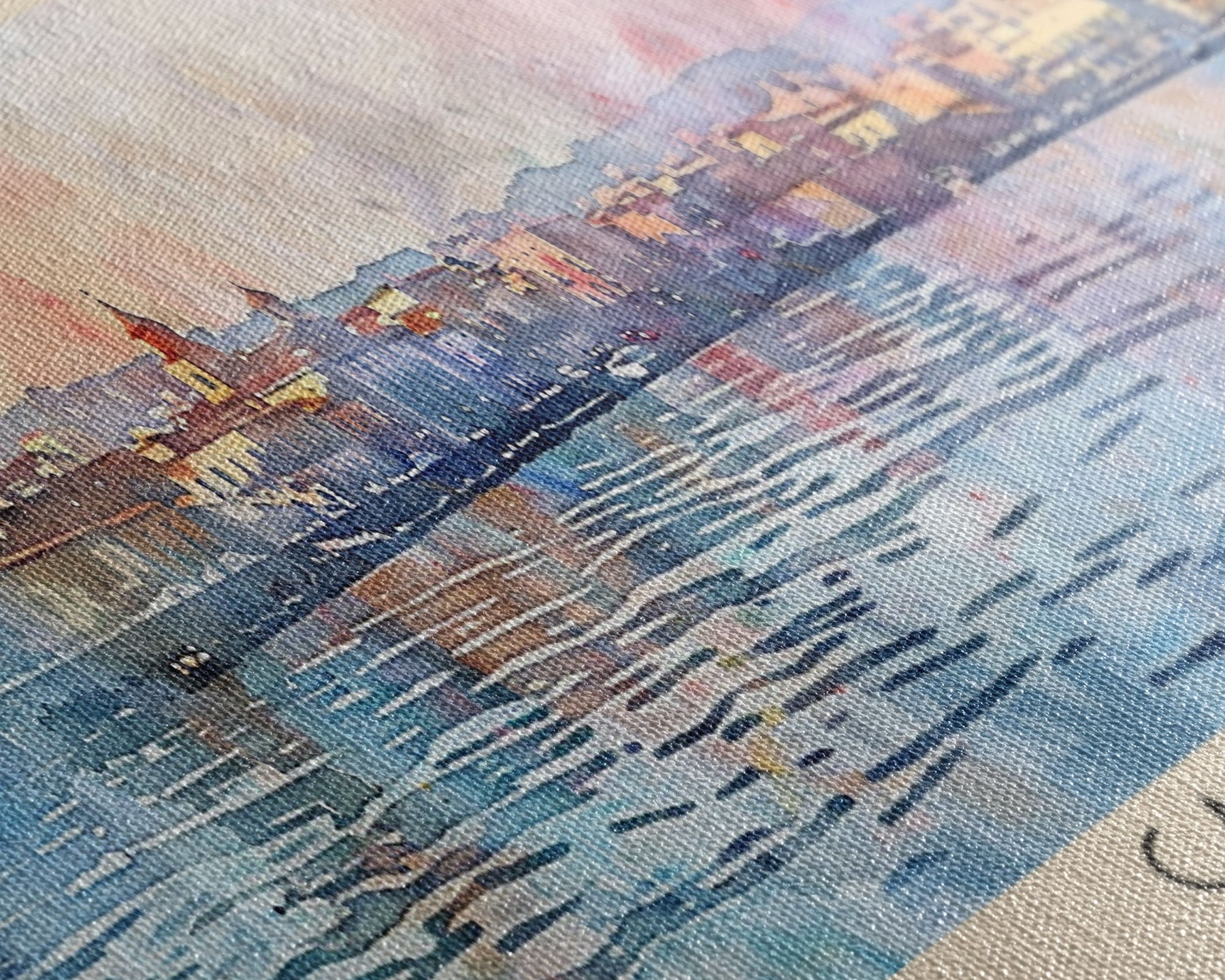 Most of our canvases are made in the USA, with the exception of canvases ordered with the light oak unstained frames, and any large canvases (24x48, 30x60, 16x48 and 20x60) ordered WITH a frame. These are temporarily made in and shipped from Europe, while we try to find a more consistent supplier in the USA.