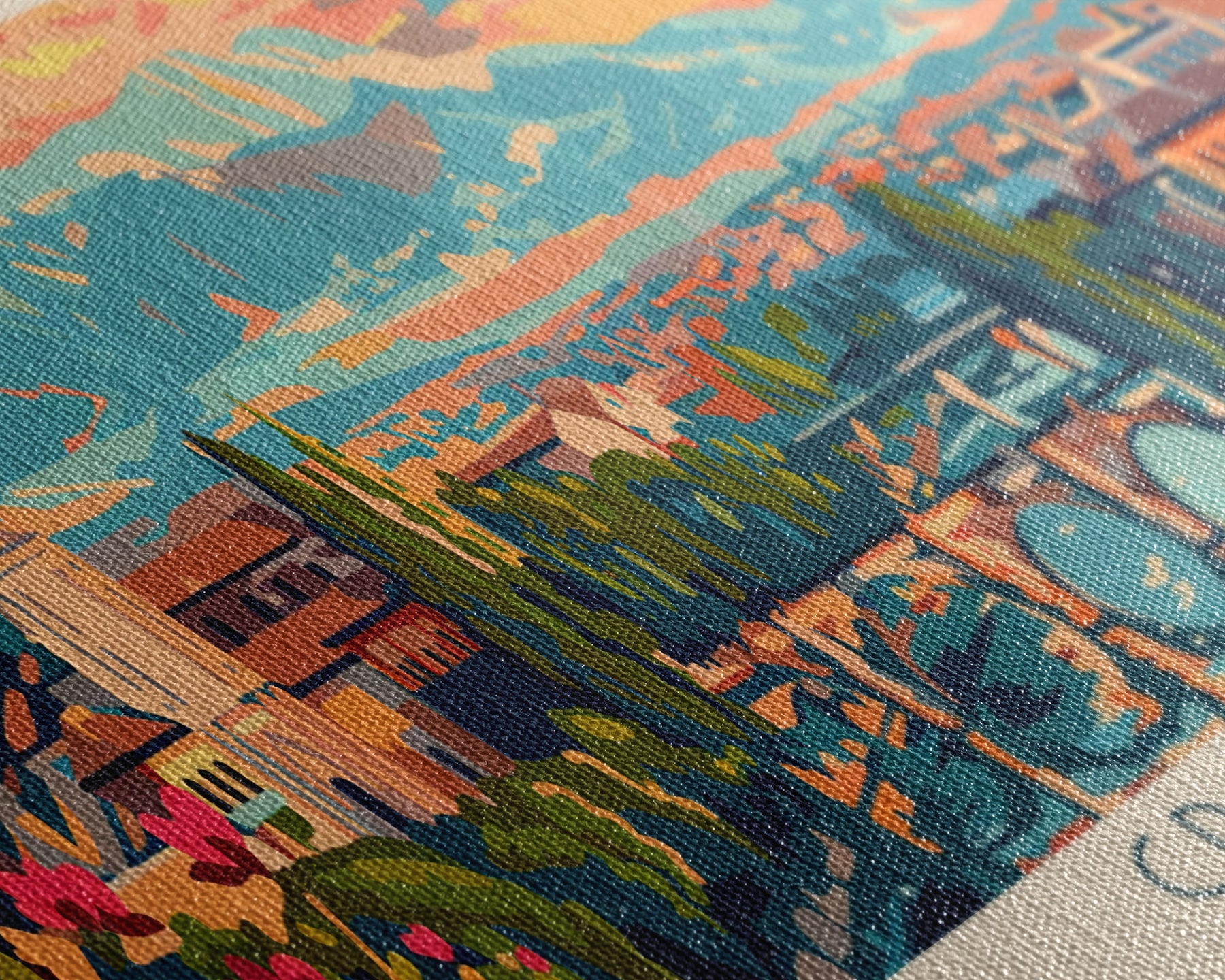 Most of our canvases are made in the USA, with the exception of canvases ordered with the light oak unstained frames, and any large canvases (24x48, 30x60, 16x48 and 20x60) ordered WITH a frame. These are temporarily made in and shipped from Europe, while we try to find a more consistent supplier in the USA.