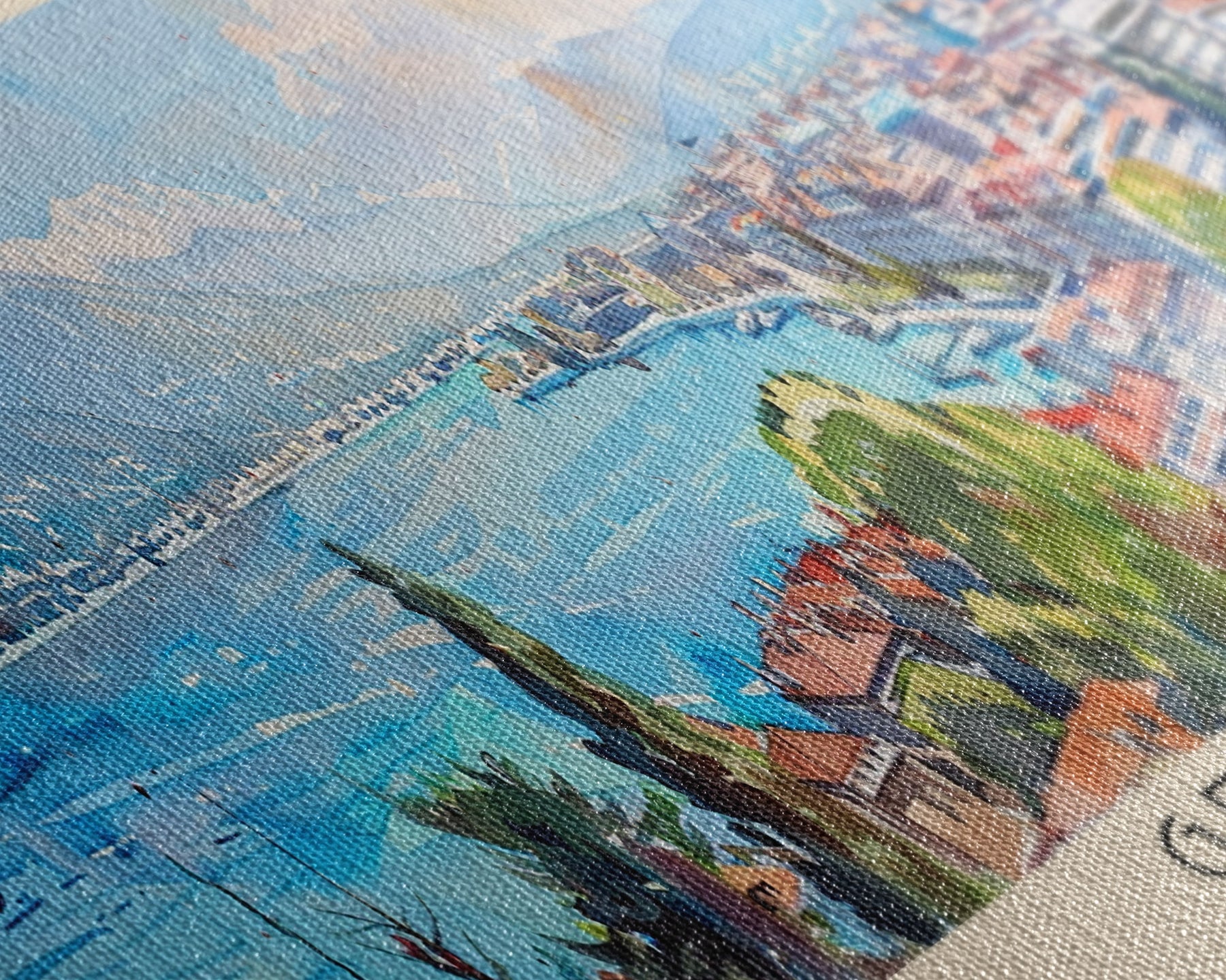 Most of our canvases are made in the USA, with the exception of canvases ordered with the light oak unstained frames, and any large canvases (24x48, 30x60, 16x48 and 20x60) ordered WITH a frame. These are temporarily made in and shipped from Europe, while we try to find a more consistent supplier in the USA.