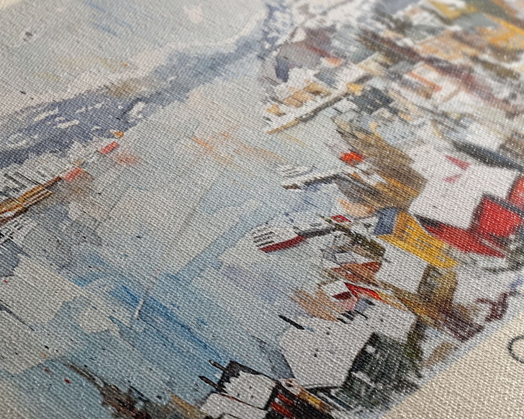 Most of our canvases are made in the USA, with the exception of canvases ordered with the light oak unstained frames, and any large canvases (24x48, 30x60, 16x48 and 20x60) ordered WITH a frame. These are temporarily made in and shipped from Europe, while we try to find a more consistent supplier in the USA.