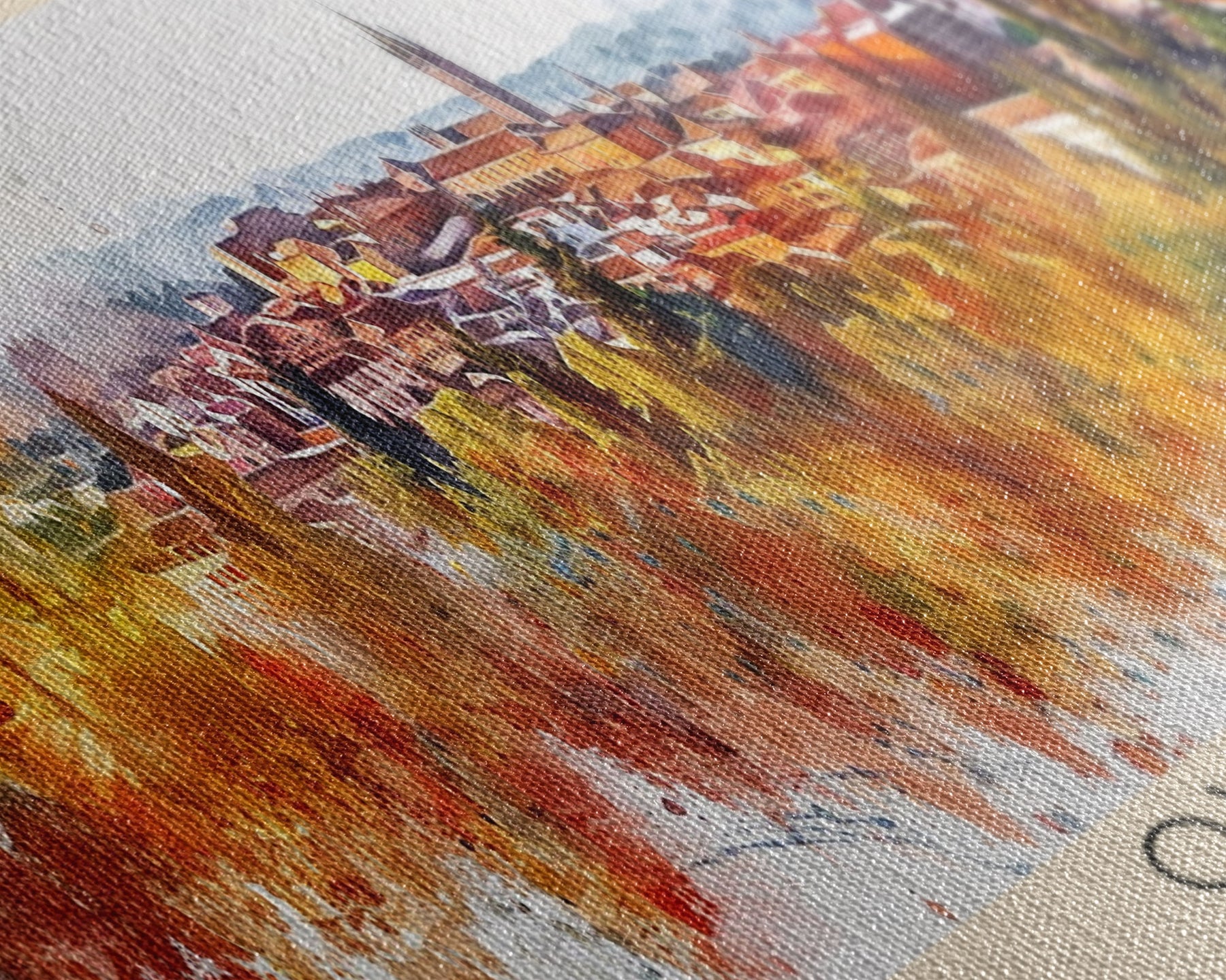 Most of our canvases are made in the USA, with the exception of canvases ordered with the light oak unstained frames, and any large canvases (24x48, 30x60, 16x48 and 20x60) ordered WITH a frame. These are temporarily made in and shipped from Europe, while we try to find a more consistent supplier in the USA.