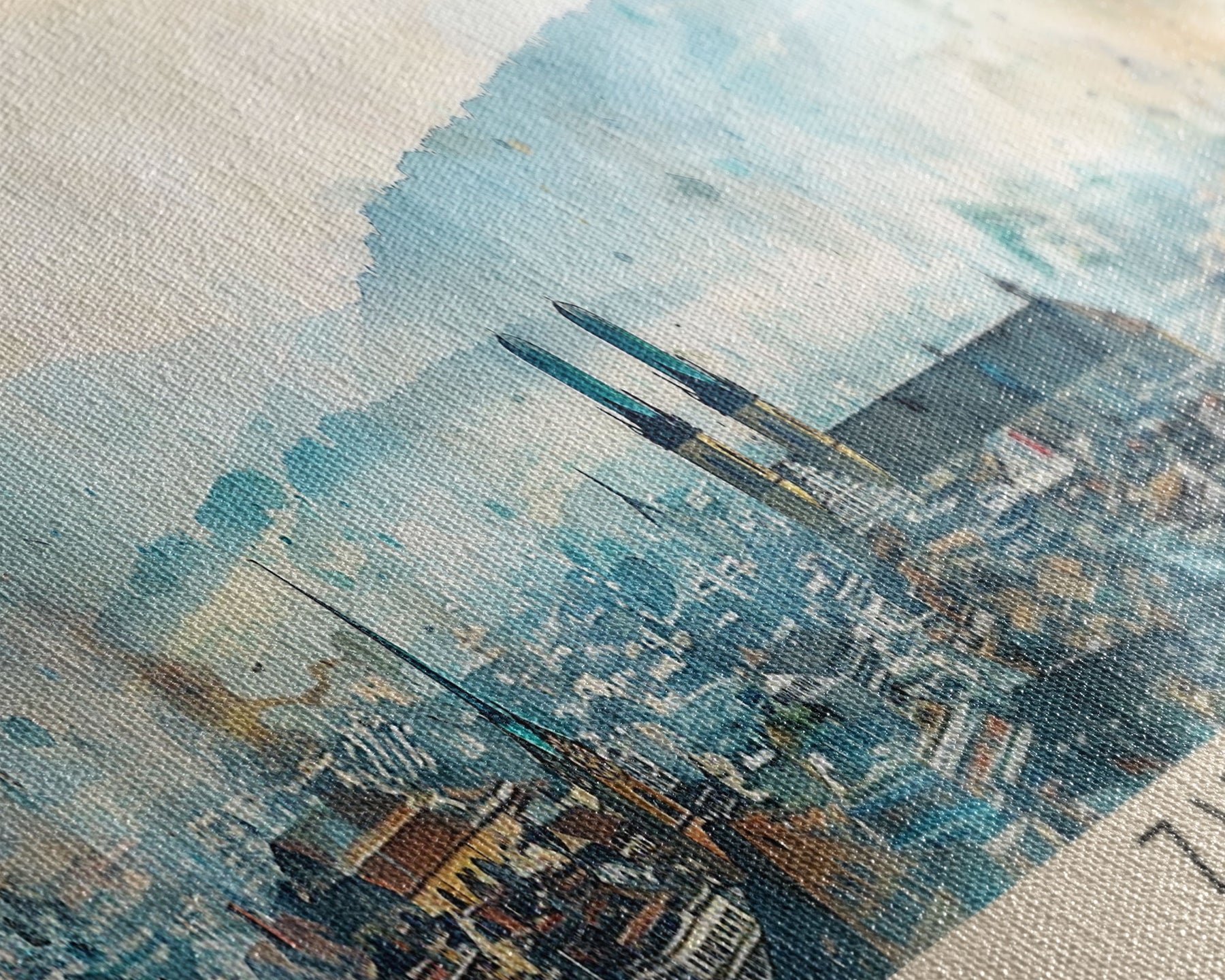Most of our canvases are made in the USA, with the exception of canvases ordered with the light oak unstained frames, and any large canvases (24x48, 30x60, 16x48 and 20x60) ordered WITH a frame. These are temporarily made in and shipped from Europe, while we try to find a more consistent supplier in the USA.