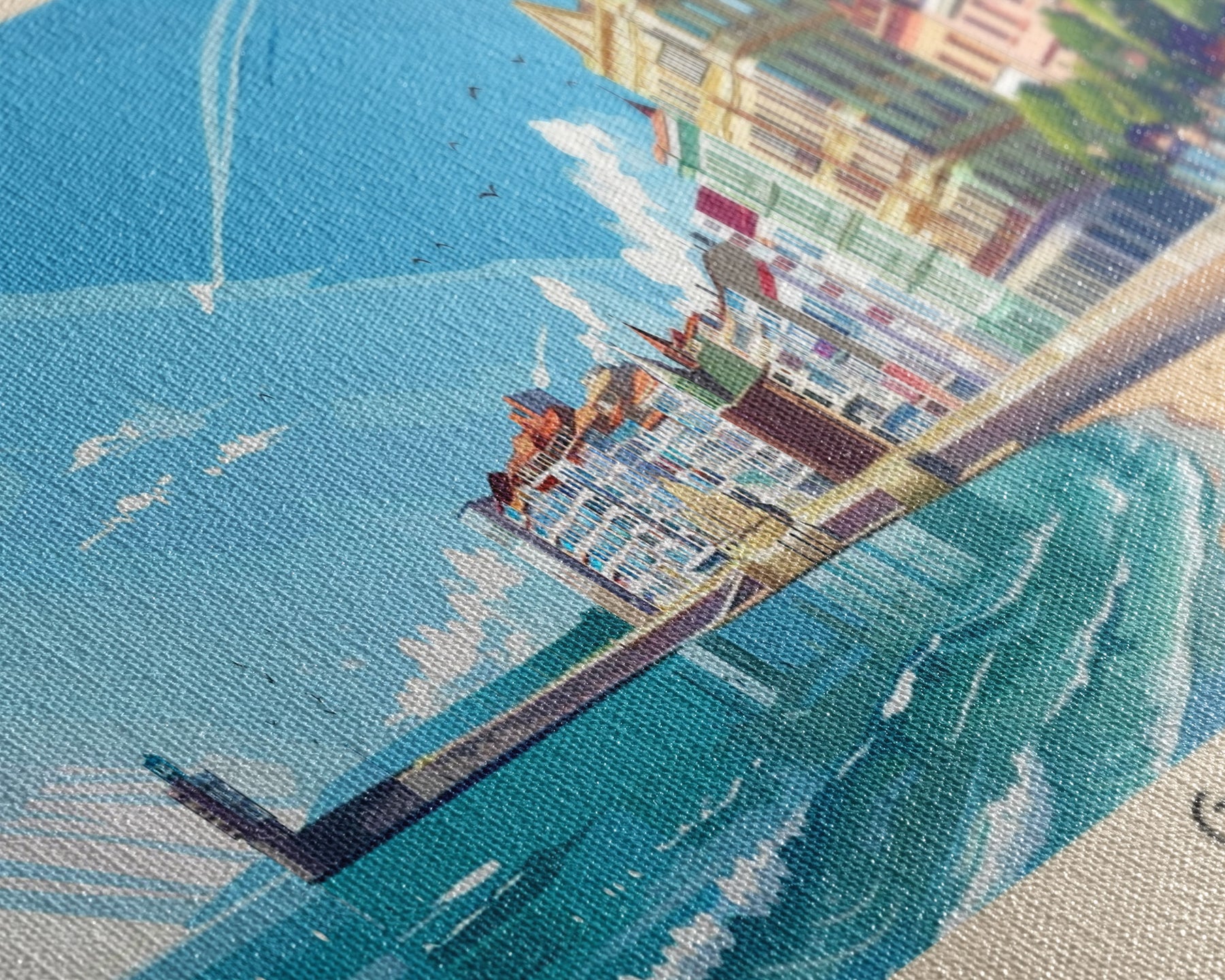 Most of our canvases are made in the USA, with the exception of canvases ordered with the light oak unstained frames, and any large canvases (24x48, 30x60, 16x48 and 20x60) ordered WITH a frame. These are temporarily made in and shipped from Europe, while we try to find a more consistent supplier in the USA.