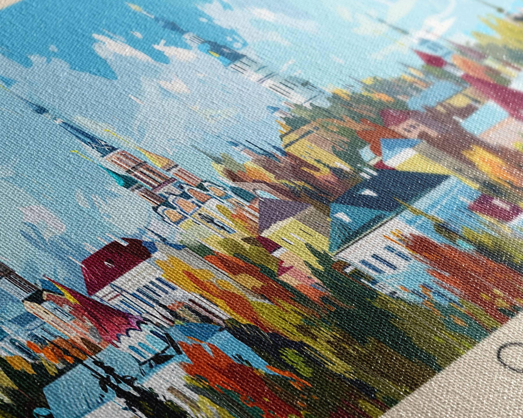 Most of our canvases are made in the USA, with the exception of canvases ordered with the light oak unstained frames, and any large canvases (24x48, 30x60, 16x48 and 20x60) ordered WITH a frame. These are temporarily made in and shipped from Europe, while we try to find a more consistent supplier in the USA.