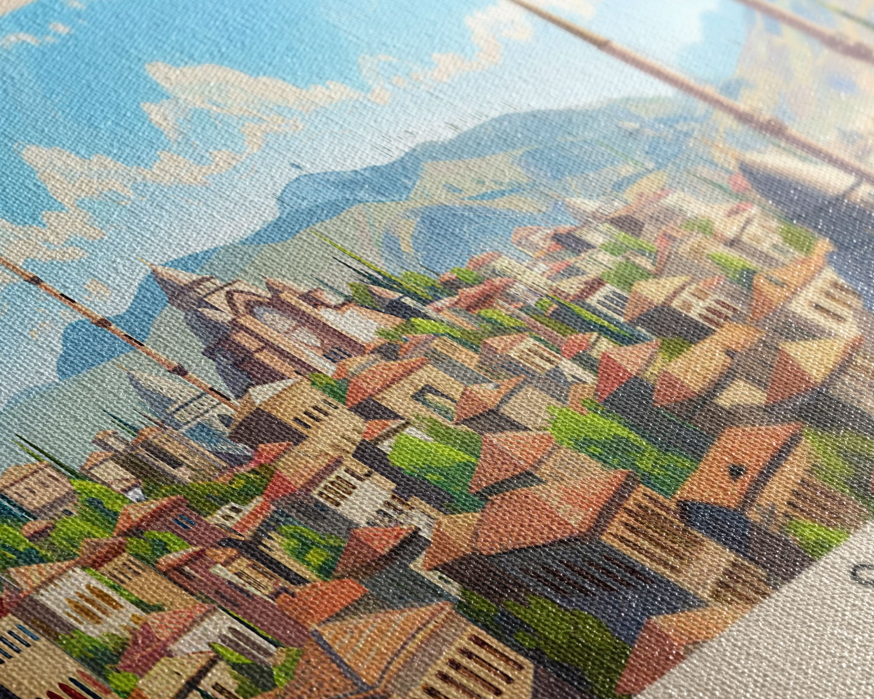 Most of our canvases are made in the USA, with the exception of canvases ordered with the light oak unstained frames, and any large canvases (24x48, 30x60, 16x48 and 20x60) ordered WITH a frame. These are temporarily made in and shipped from Europe, while we try to find a more consistent supplier in the USA.