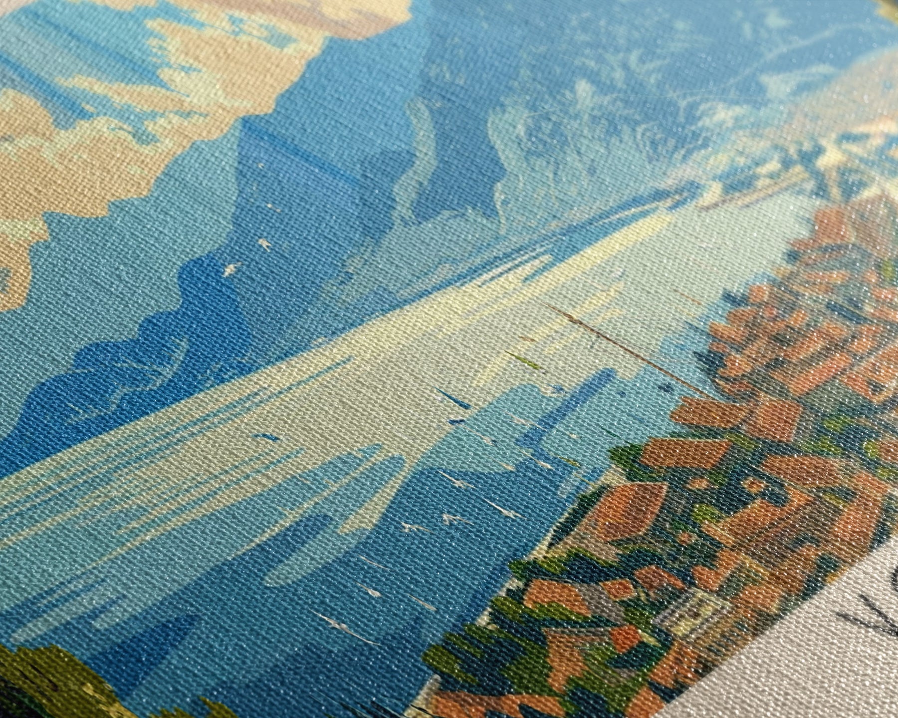 Most of our canvases are made in the USA, with the exception of canvases ordered with the light oak unstained frames, and any large canvases (24x48, 30x60, 16x48 and 20x60) ordered WITH a frame. These are temporarily made in and shipped from Europe, while we try to find a more consistent supplier in the USA.