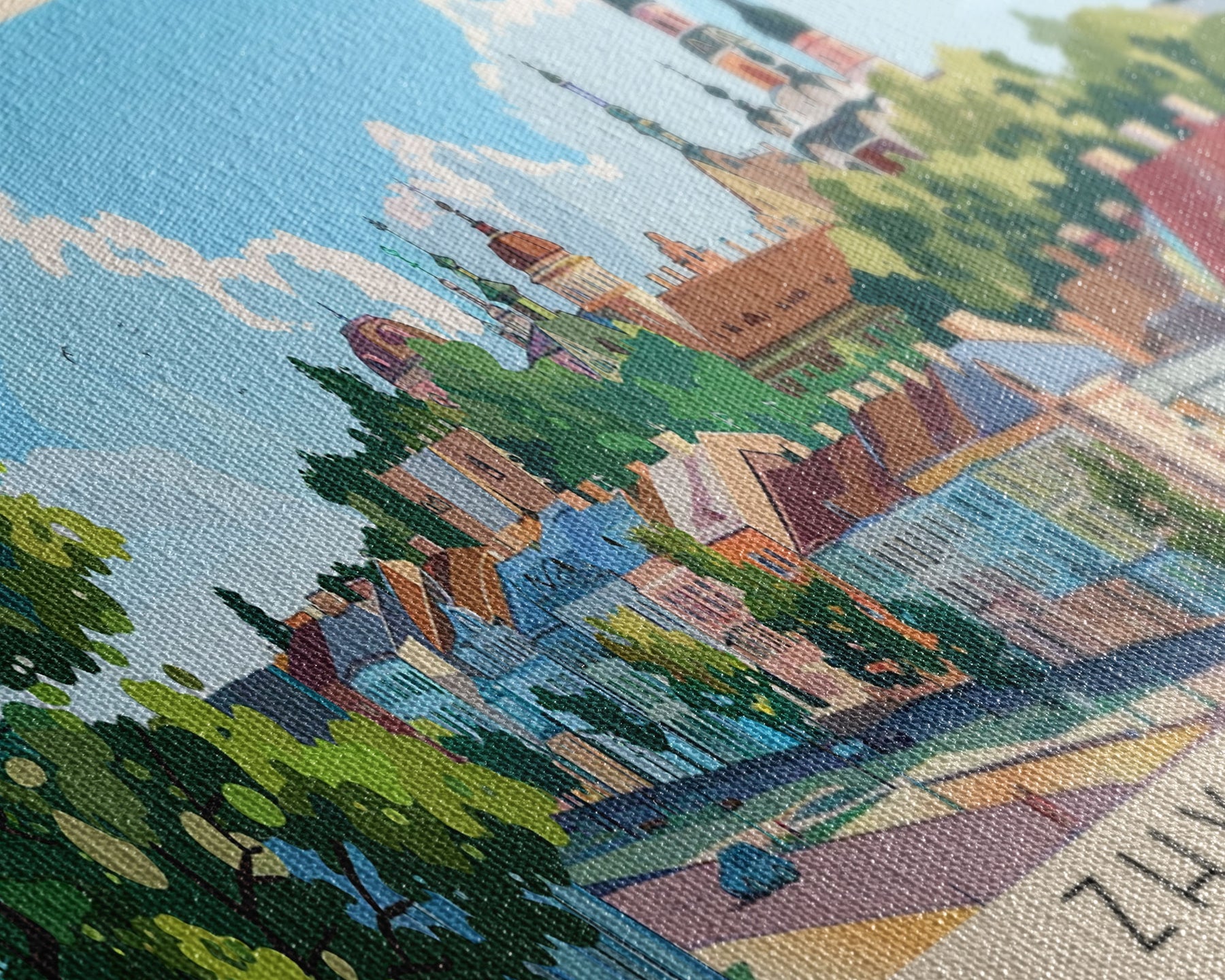 Most of our canvases are made in the USA, with the exception of canvases ordered with the light oak unstained frames, and any large canvases (24x48, 30x60, 16x48 and 20x60) ordered WITH a frame. These are temporarily made in and shipped from Europe, while we try to find a more consistent supplier in the USA.