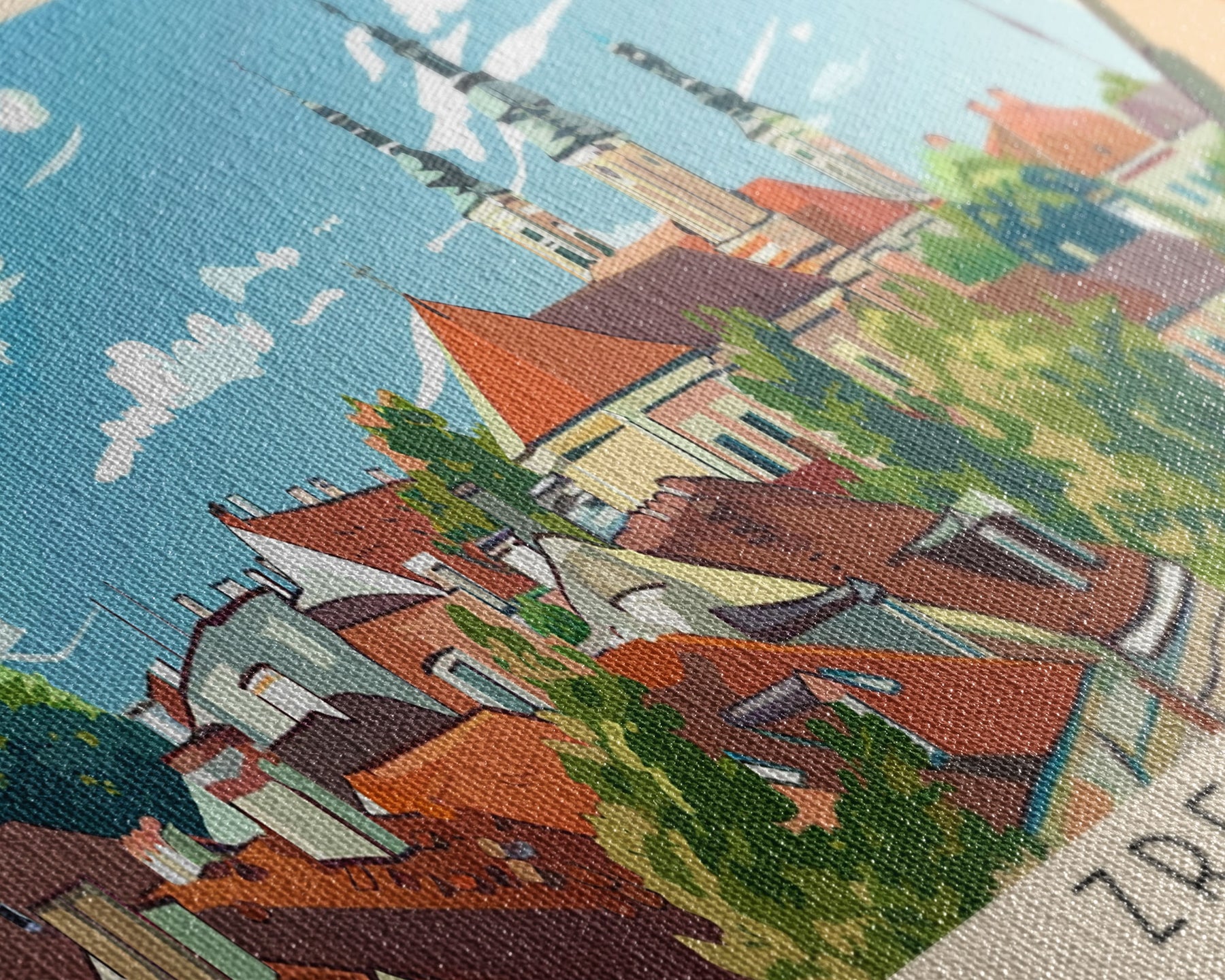 Most of our canvases are made in the USA, with the exception of canvases ordered with the light oak unstained frames, and any large canvases (24x48, 30x60, 16x48 and 20x60) ordered WITH a frame. These are temporarily made in and shipped from Europe, while we try to find a more consistent supplier in the USA.