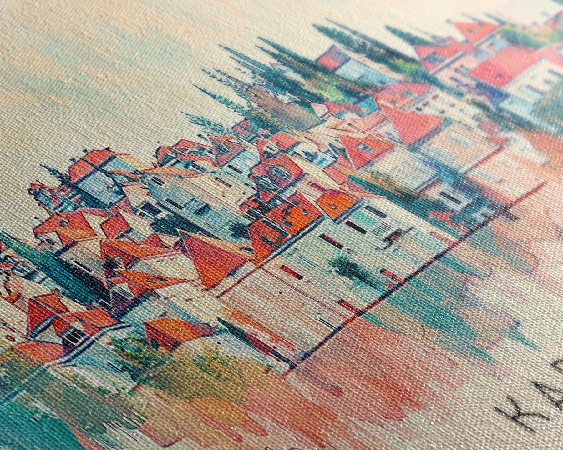 Most of our canvases are made in the USA, with the exception of canvases ordered with the light oak unstained frames, and any large canvases (24x48, 30x60, 16x48 and 20x60) ordered WITH a frame. These are temporarily made in and shipped from Europe, while we try to find a more consistent supplier in the USA.