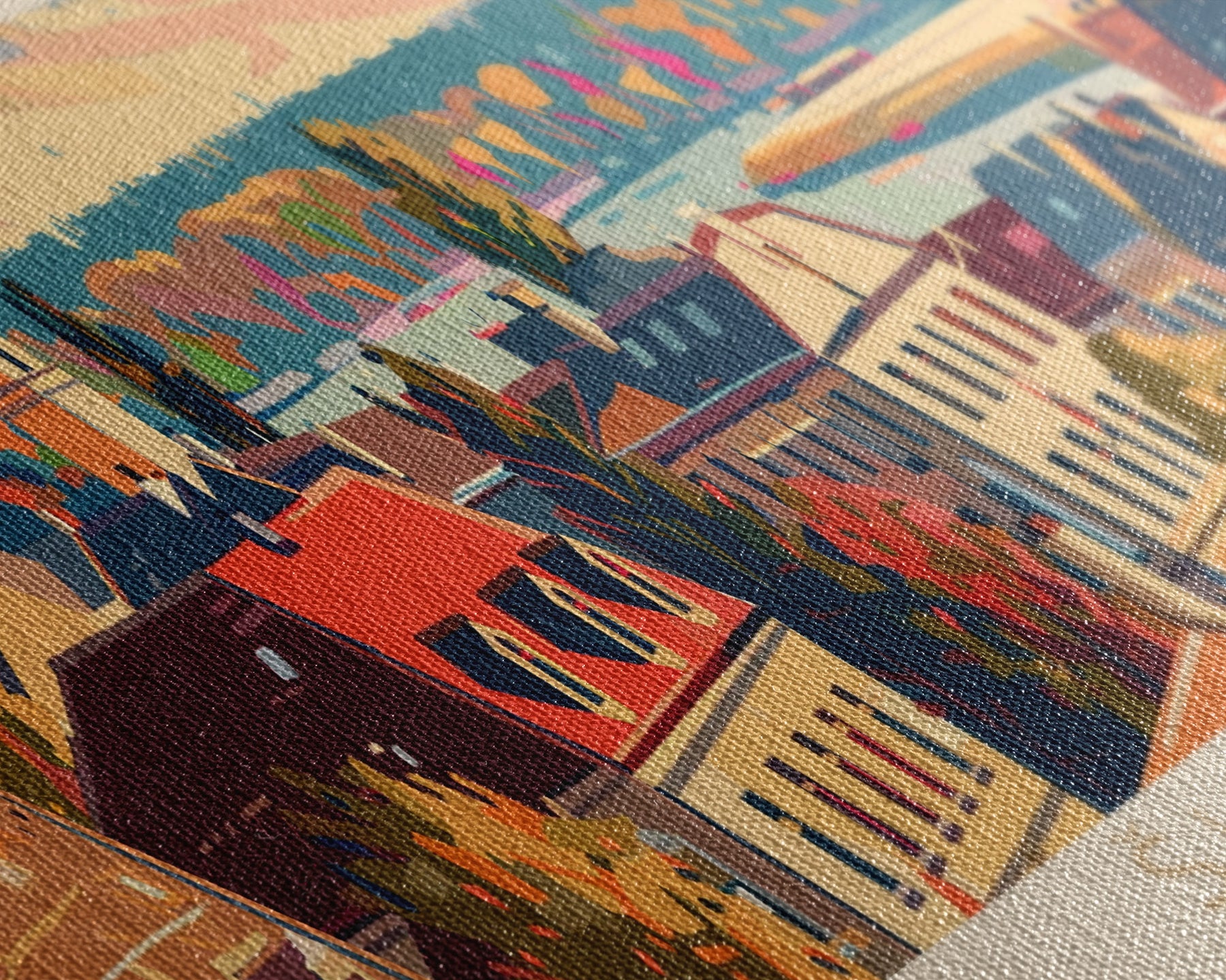 Most of our canvases are made in the USA, with the exception of canvases ordered with the light oak unstained frames, and any large canvases (24x48, 30x60, 16x48 and 20x60) ordered WITH a frame. These are temporarily made in and shipped from Europe, while we try to find a more consistent supplier in the USA.
