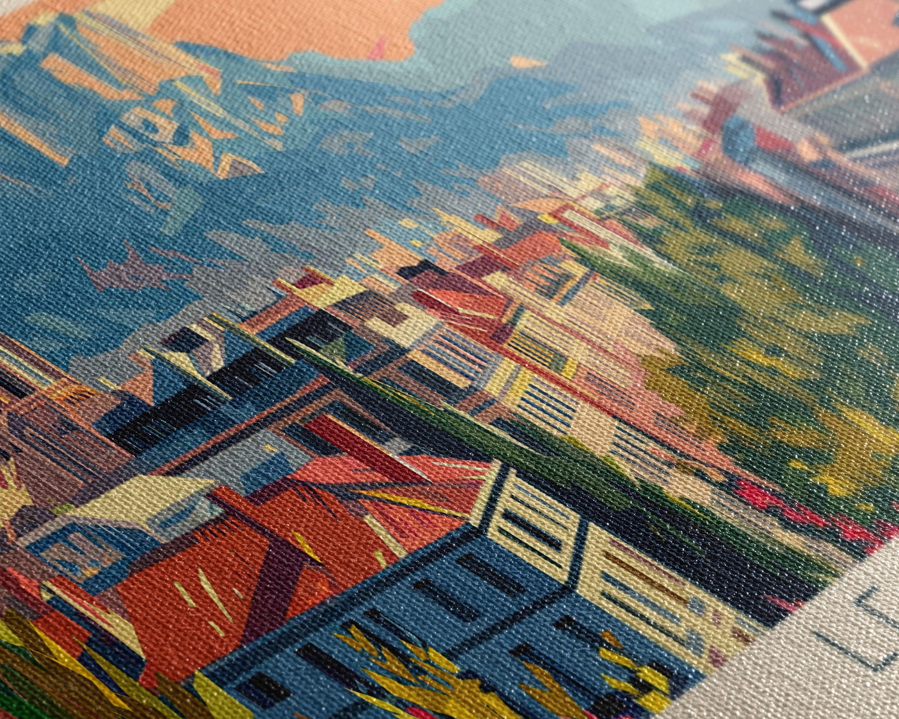 Most of our canvases are made in the USA, with the exception of canvases ordered with the light oak unstained frames, and any large canvases (24x48, 30x60, 16x48 and 20x60) ordered WITH a frame. These are temporarily made in and shipped from Europe, while we try to find a more consistent supplier in the USA.