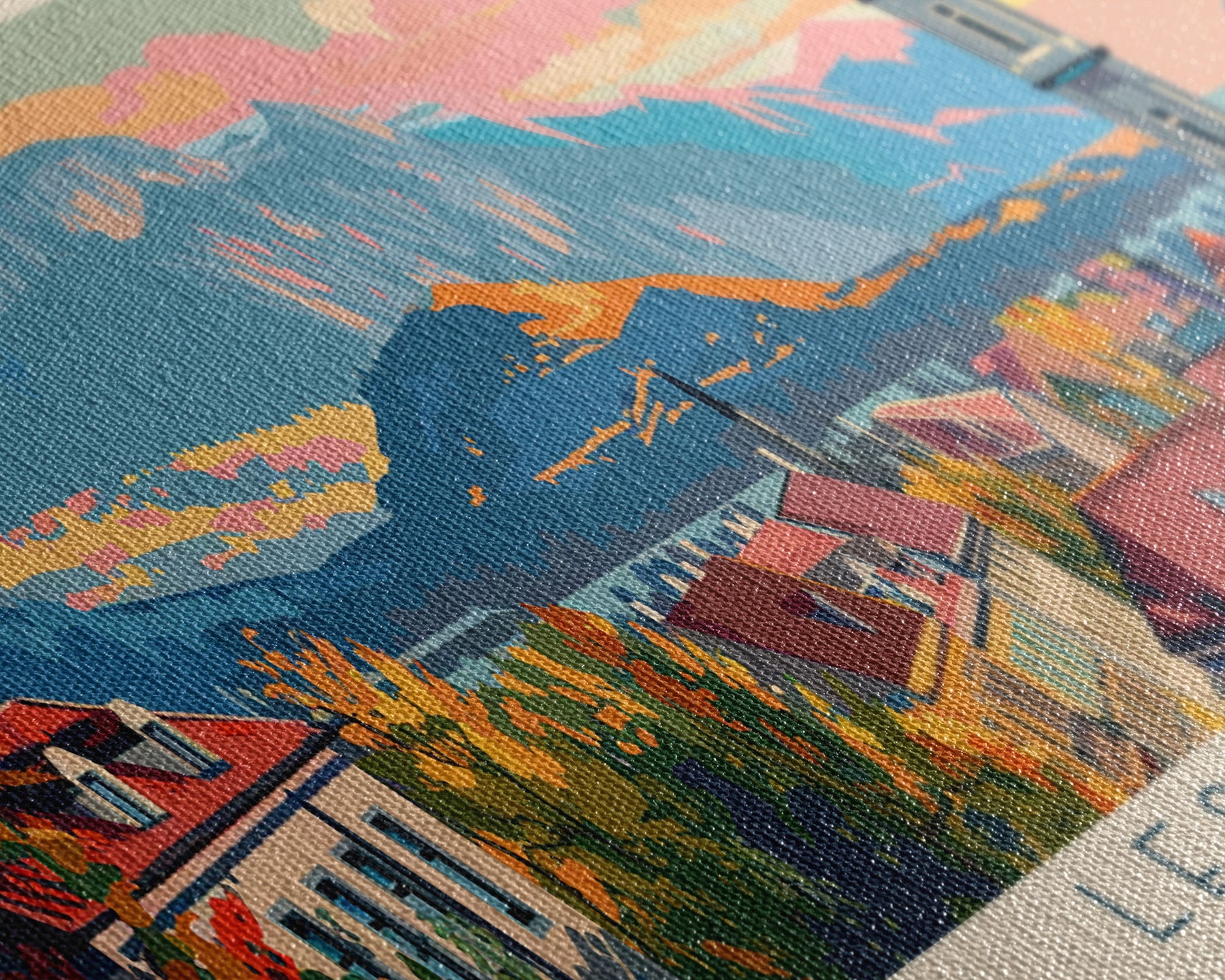 Most of our canvases are made in the USA, with the exception of canvases ordered with the light oak unstained frames, and any large canvases (24x48, 30x60, 16x48 and 20x60) ordered WITH a frame. These are temporarily made in and shipped from Europe, while we try to find a more consistent supplier in the USA.