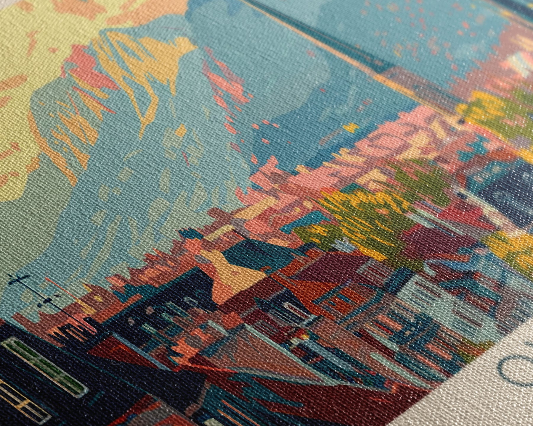 Most of our canvases are made in the USA, with the exception of canvases ordered with the light oak unstained frames, and any large canvases (24x48, 30x60, 16x48 and 20x60) ordered WITH a frame. These are temporarily made in and shipped from Europe, while we try to find a more consistent supplier in the USA.