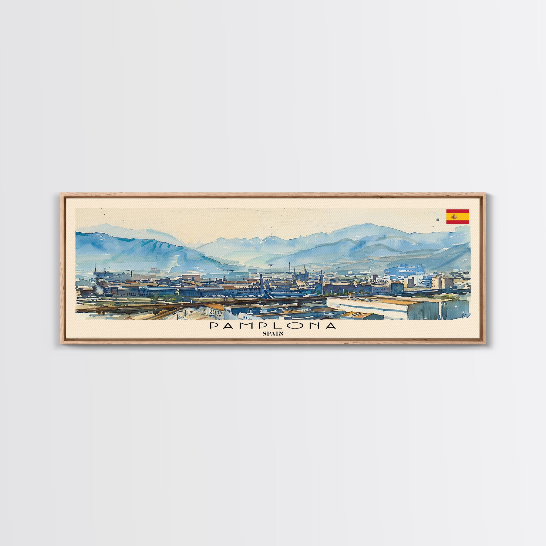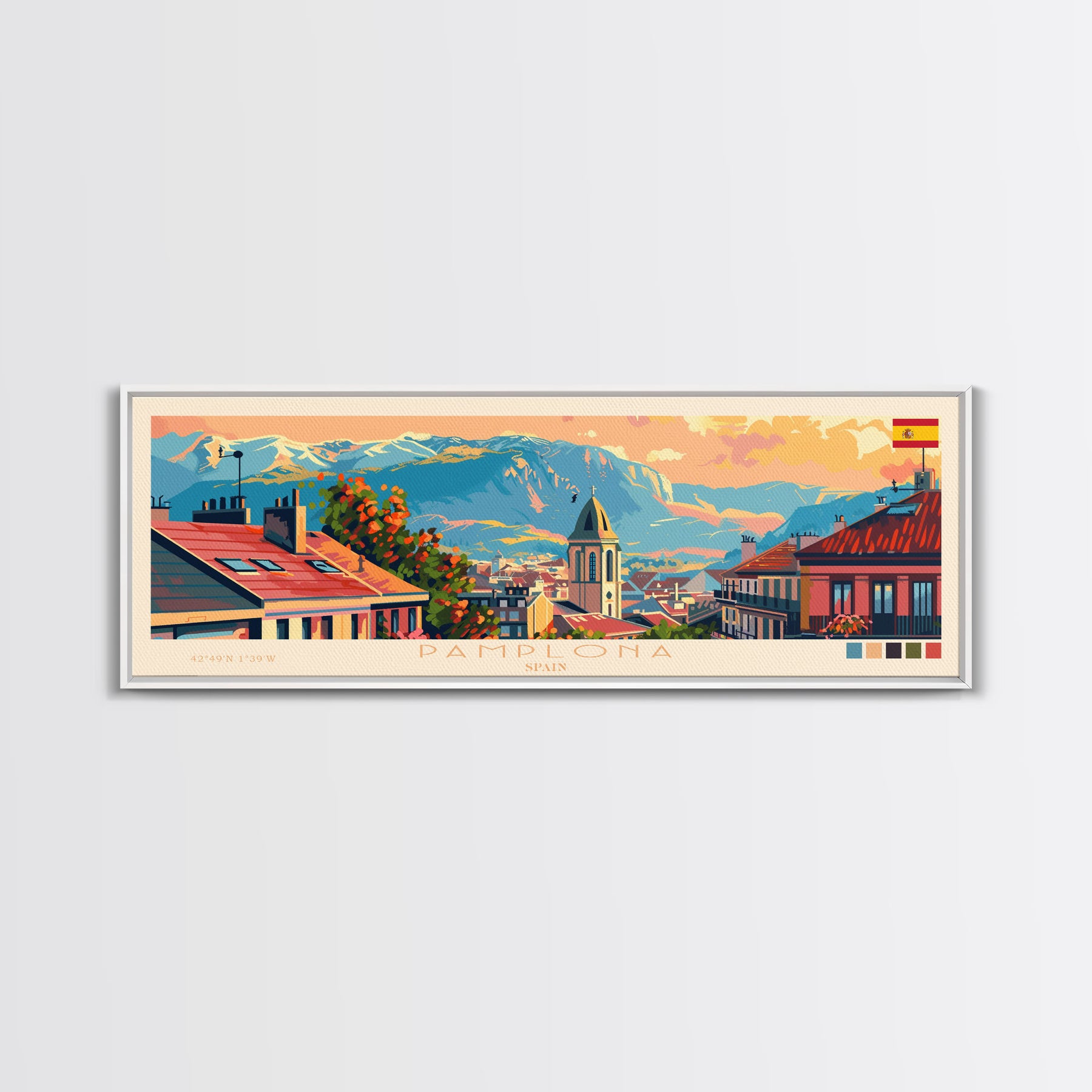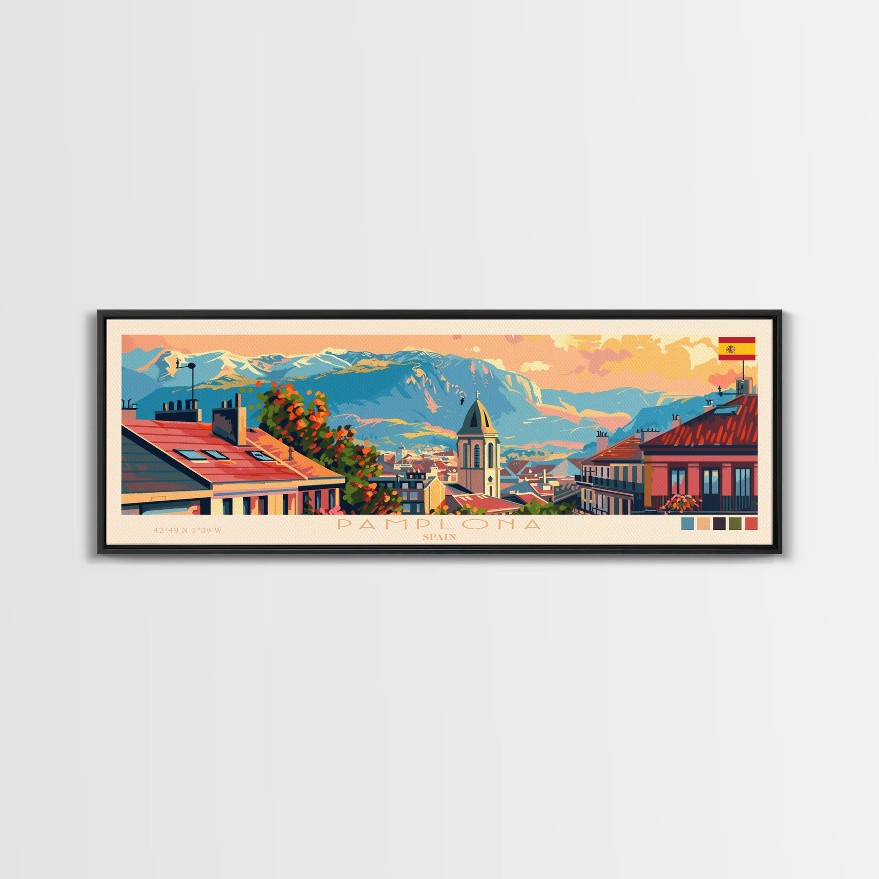 Pamplona Spain Panoramic Travel Poster, Framed Canvas Print or Metal Wall Art, Travel Art, Home Decor, Panoramic Painting, Midcentury Art