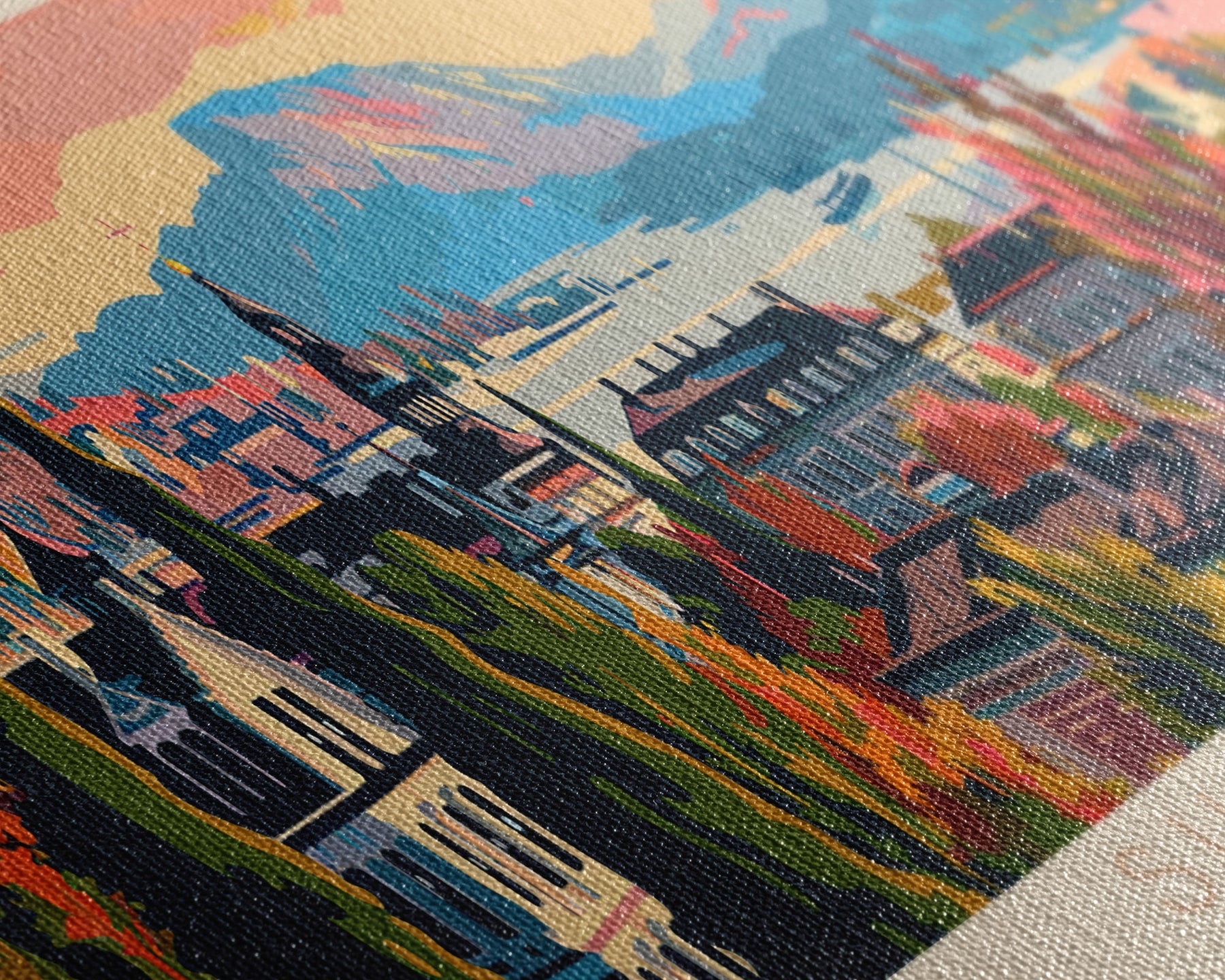 Most of our canvases are made in the USA, with the exception of canvases ordered with the light oak unstained frames, and any large canvases (24x48, 30x60, 16x48 and 20x60) ordered WITH a frame. These are temporarily made in and shipped from Europe, while we try to find a more consistent supplier in the USA.