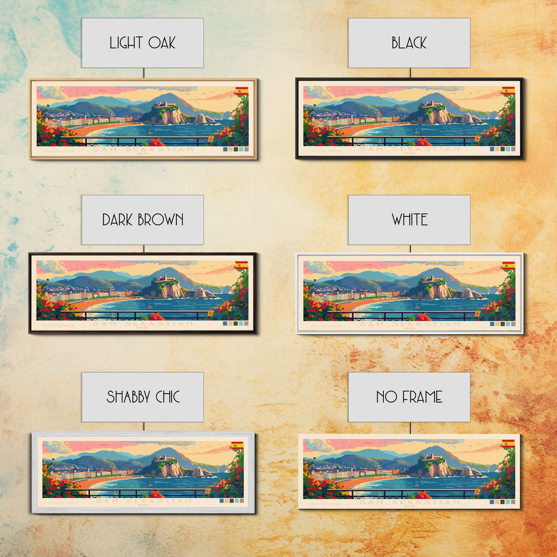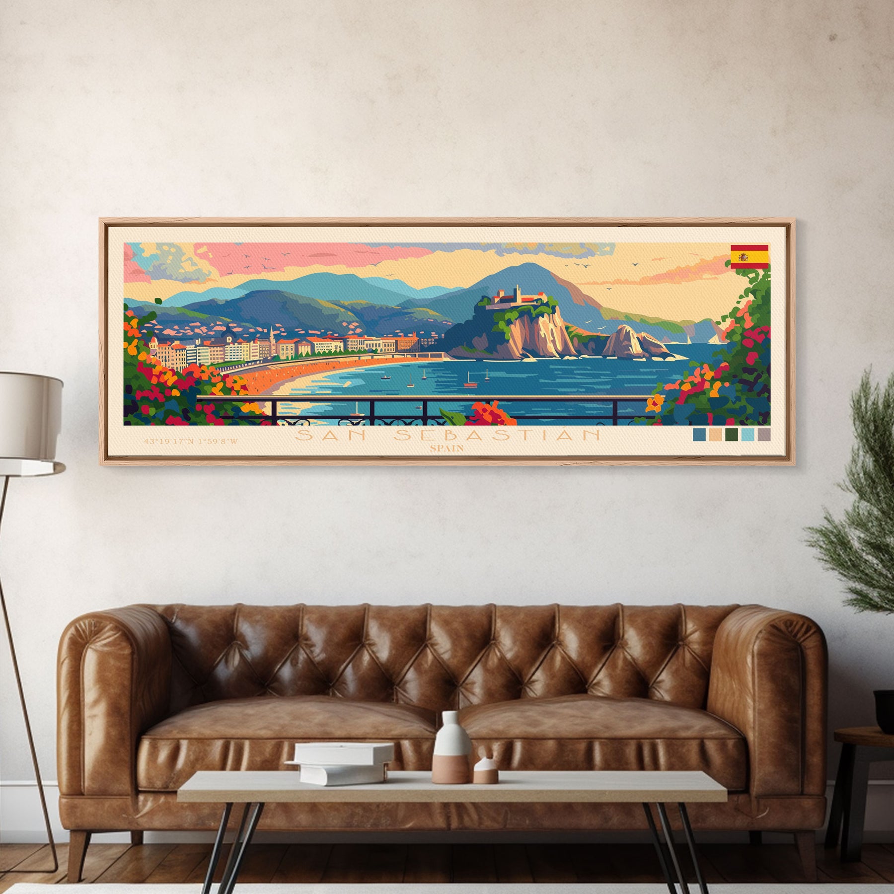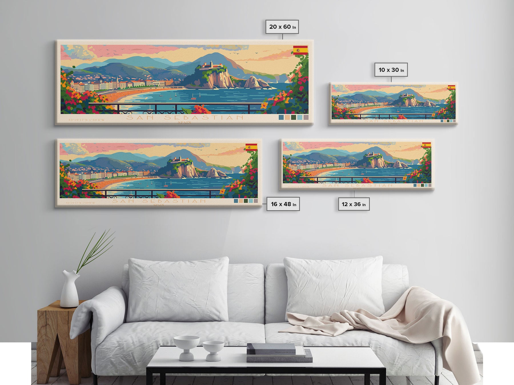 San Sebastian Spain Panoramic Travel Poster, Framed Canvas Print or Metal Wall Art, Travel Art, Home Decor, Panoramic Painting, Midcentury Art