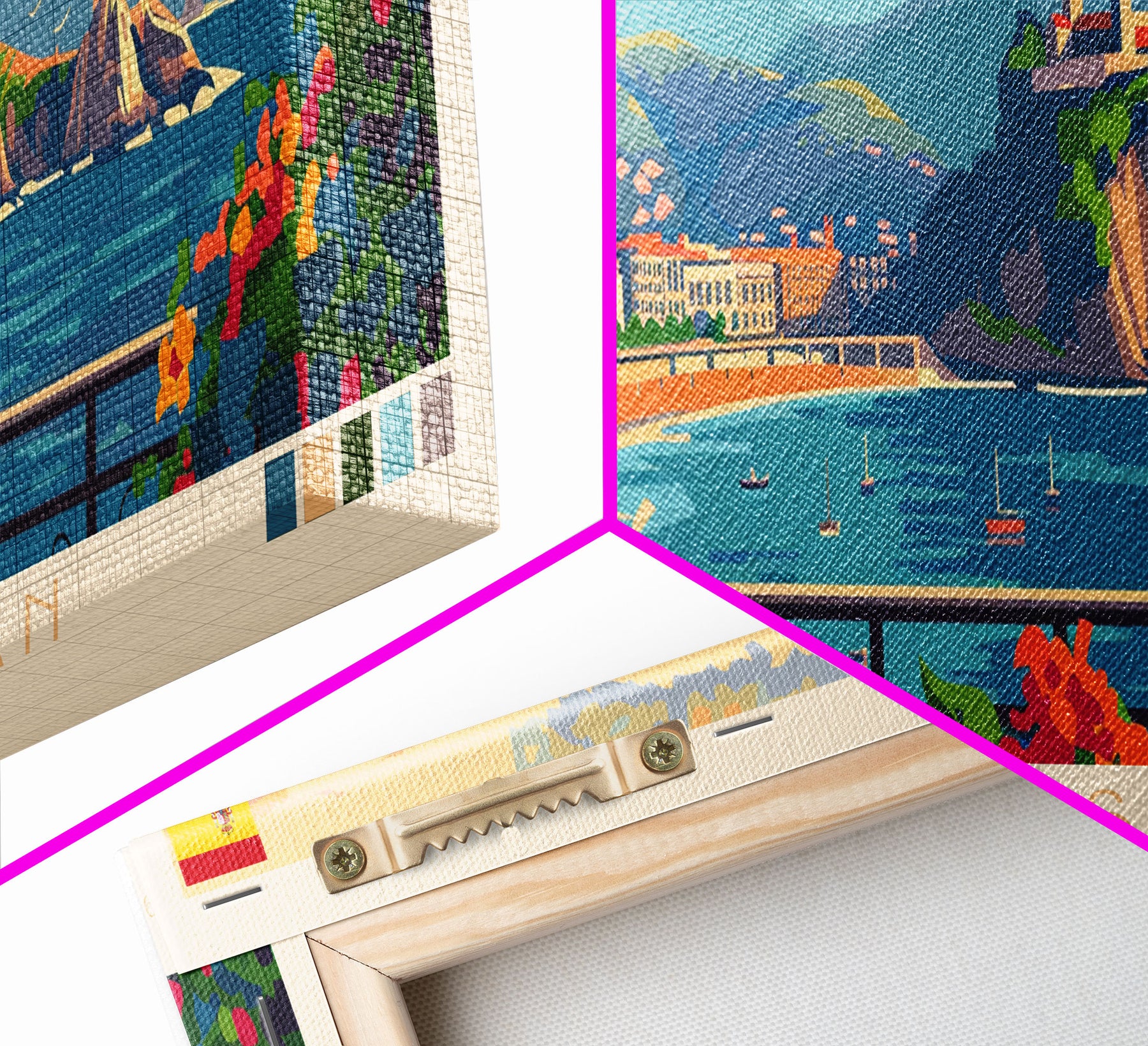 Most of our canvases are made in the USA, with the exception of canvases ordered with the light oak unstained frames, and any large canvases (24x48, 30x60, 16x48 and 20x60) ordered WITH a frame. These are temporarily made in and shipped from Europe, while we try to find a more consistent supplier in the USA.