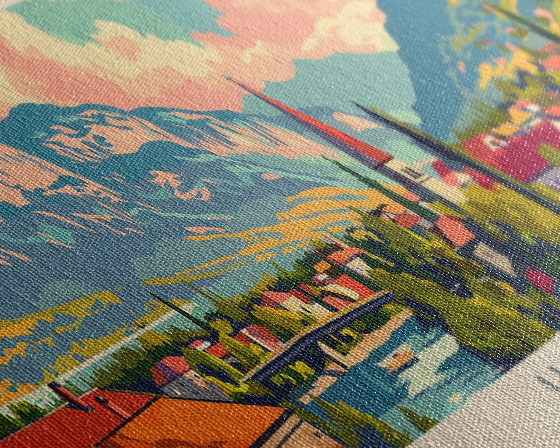 Most of our canvases are made in the USA, with the exception of canvases ordered with the light oak unstained frames, and any large canvases (24x48, 30x60, 16x48 and 20x60) ordered WITH a frame. These are temporarily made in and shipped from Europe, while we try to find a more consistent supplier in the USA.