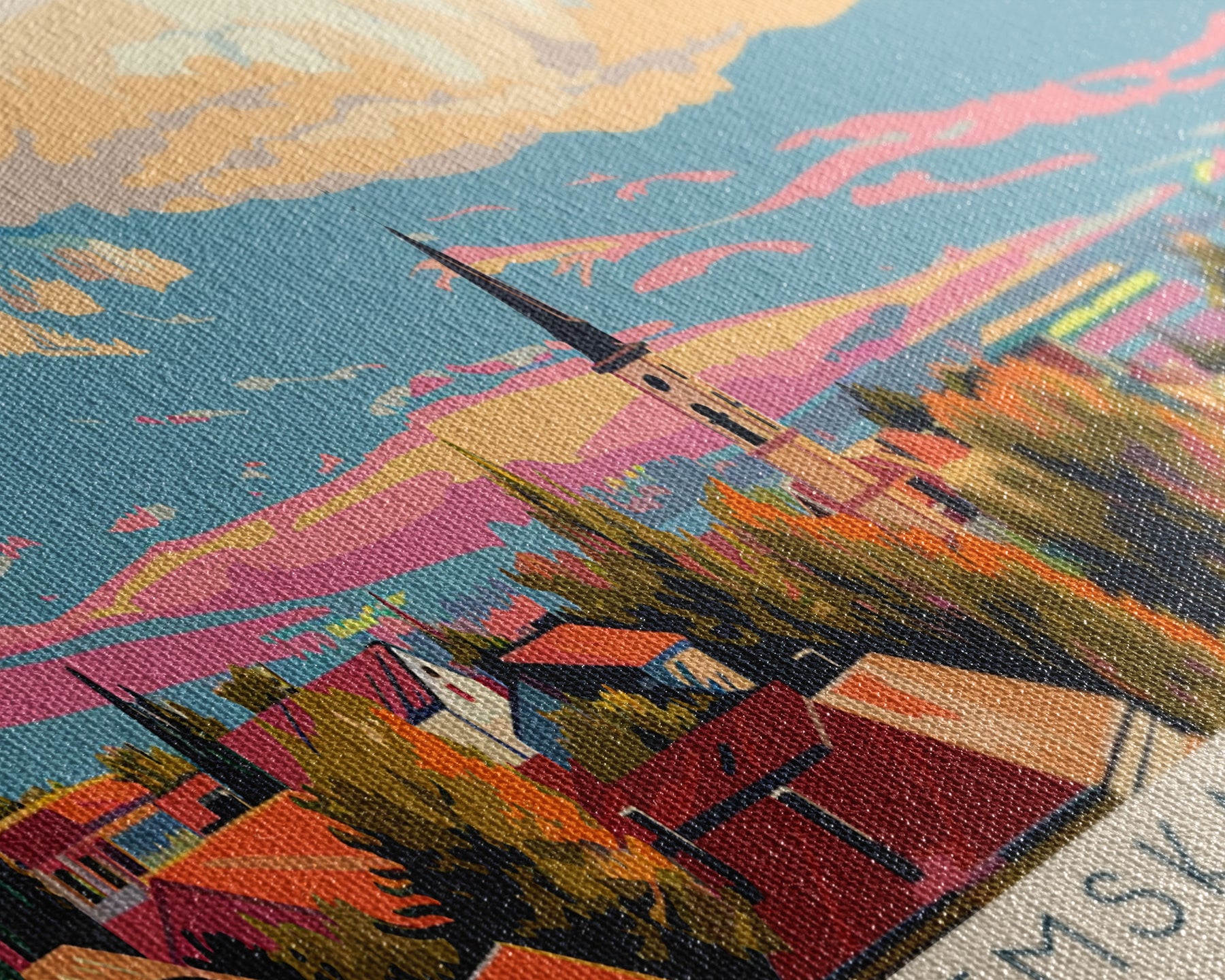 Most of our canvases are made in the USA, with the exception of canvases ordered with the light oak unstained frames, and any large canvases (24x48, 30x60, 16x48 and 20x60) ordered WITH a frame. These are temporarily made in and shipped from Europe, while we try to find a more consistent supplier in the USA.