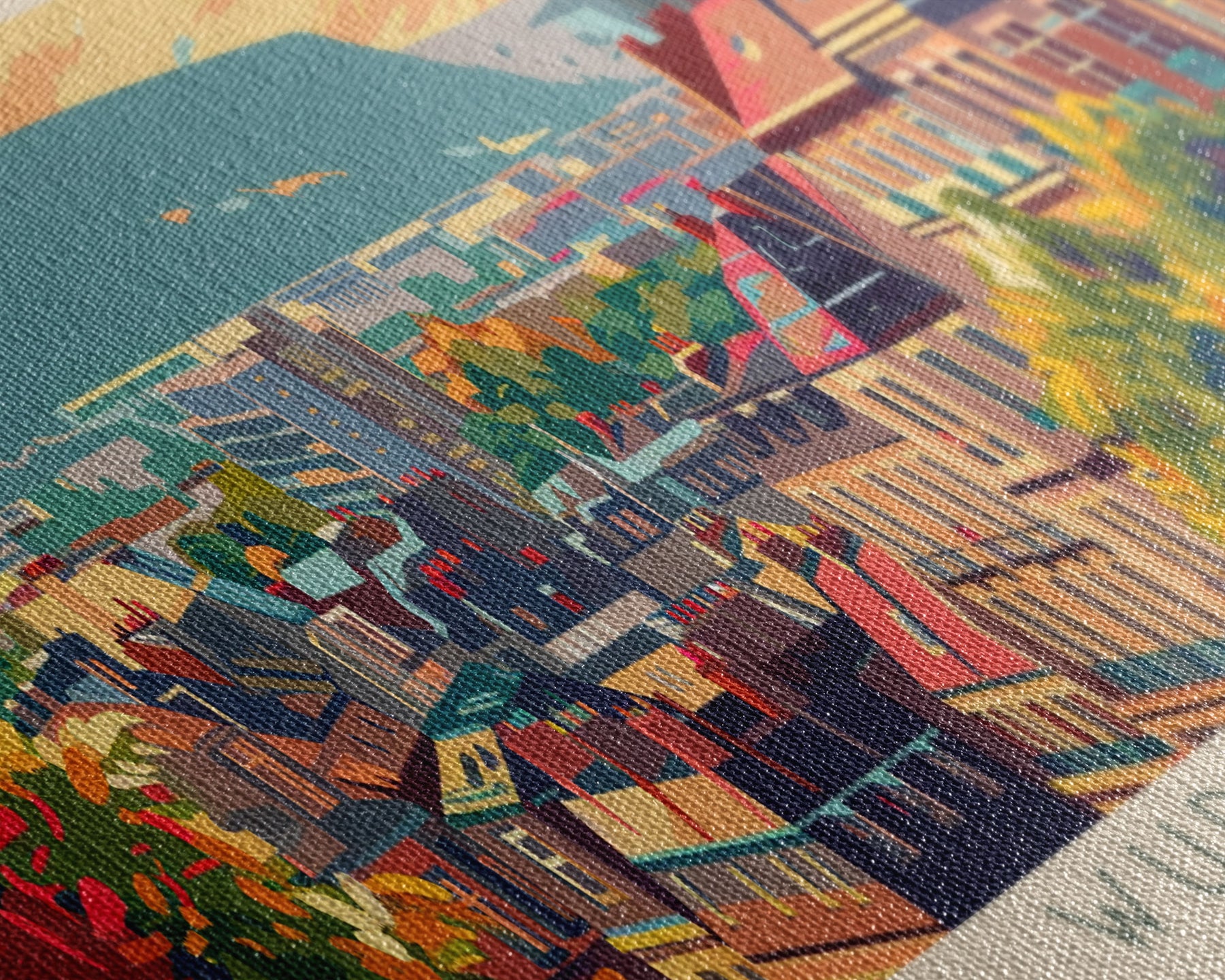 Most of our canvases are made in the USA, with the exception of canvases ordered with the light oak unstained frames, and any large canvases (24x48, 30x60, 16x48 and 20x60) ordered WITH a frame. These are temporarily made in and shipped from Europe, while we try to find a more consistent supplier in the USA.
