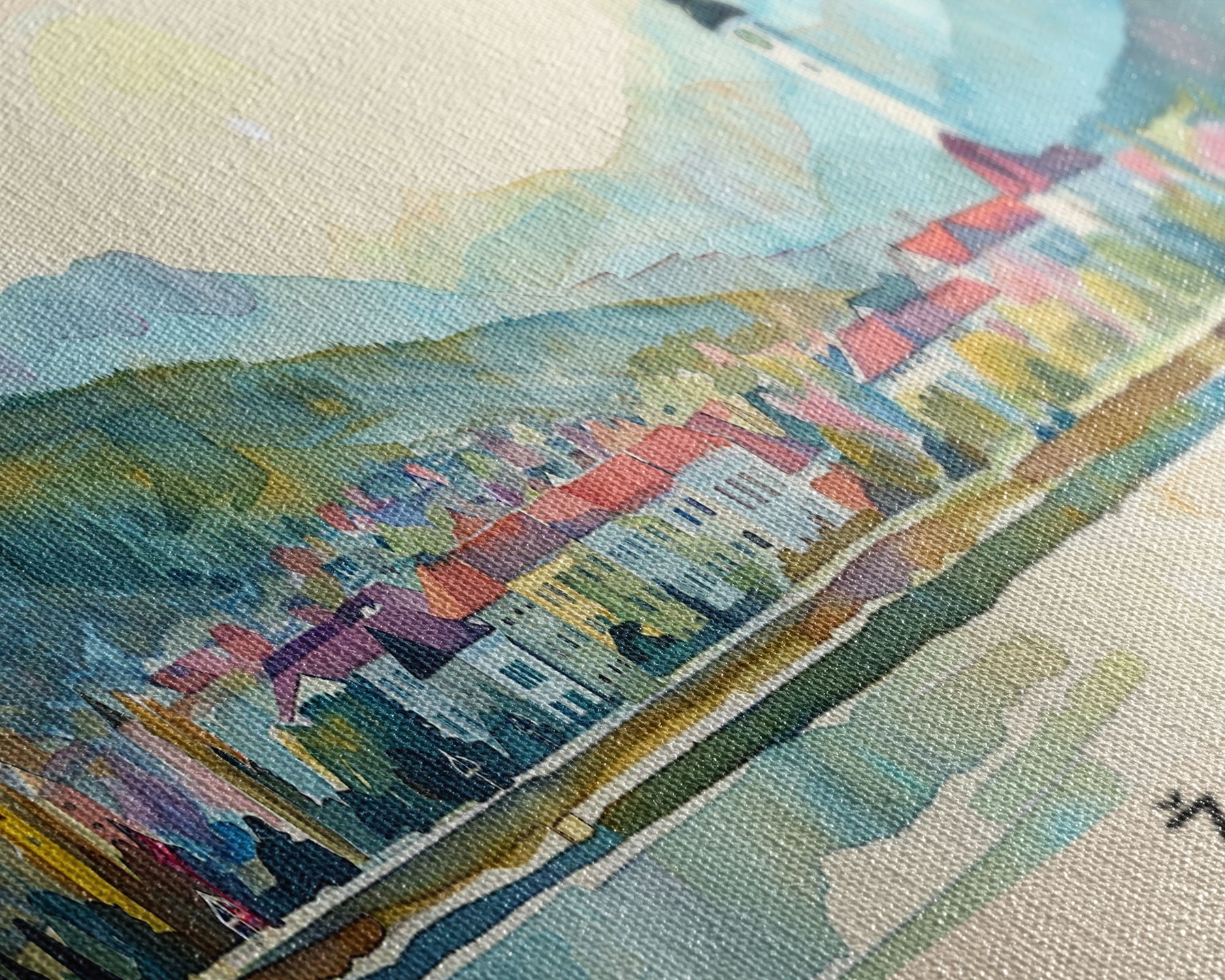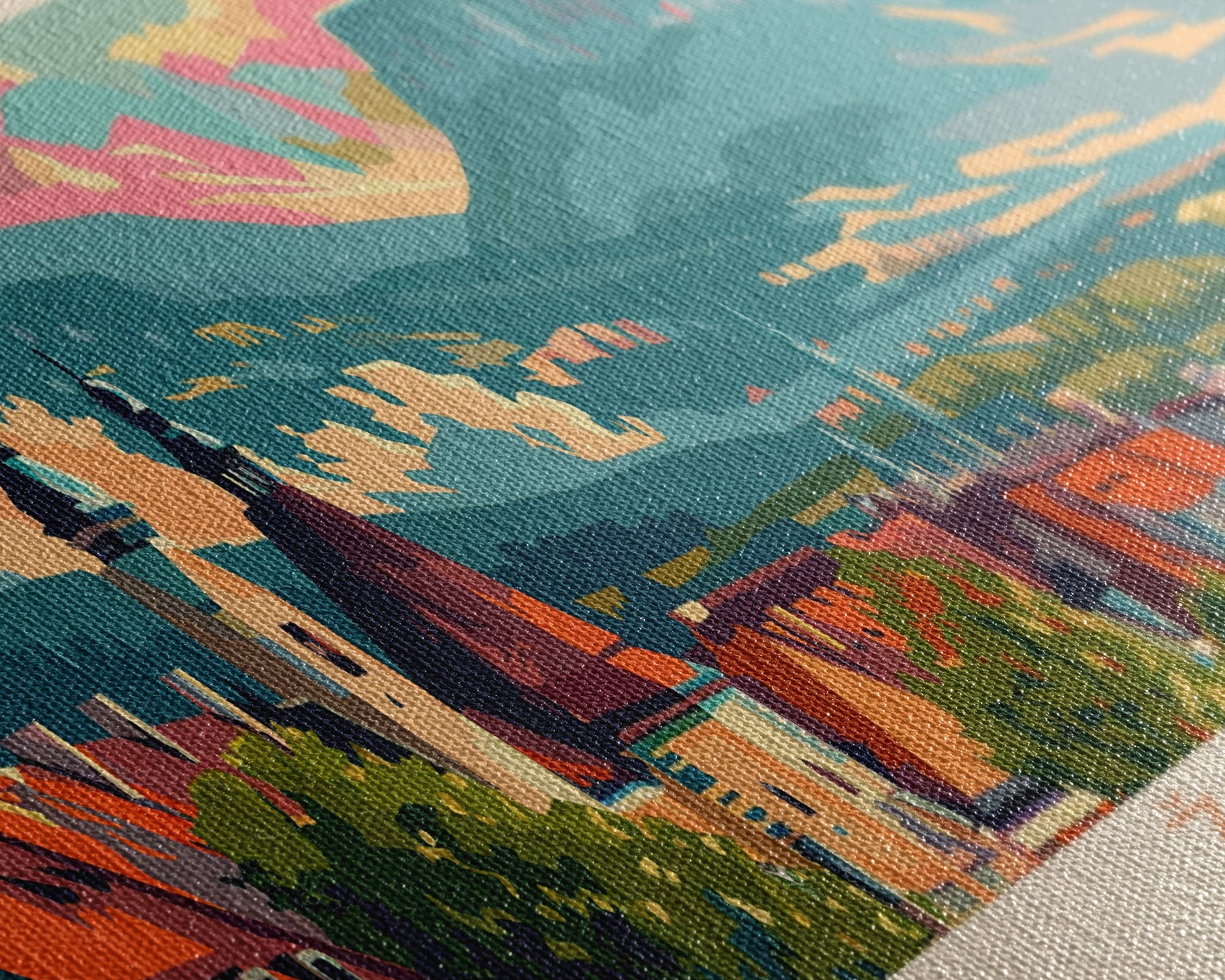 Most of our canvases are made in the USA, with the exception of canvases ordered with the light oak unstained frames, and any large canvases (24x48, 30x60, 16x48 and 20x60) ordered WITH a frame. These are temporarily made in and shipped from Europe, while we try to find a more consistent supplier in the USA.