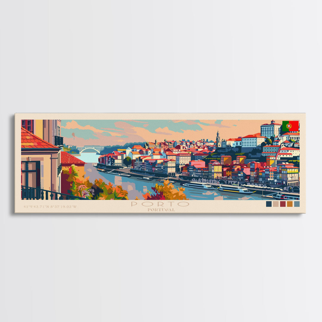 Porto Portugal Panoramic Travel Poster, Framed Canvas Print or Metal Wall Art, Travel Art, Home Decor, Panoramic Painting, Midcentury Art