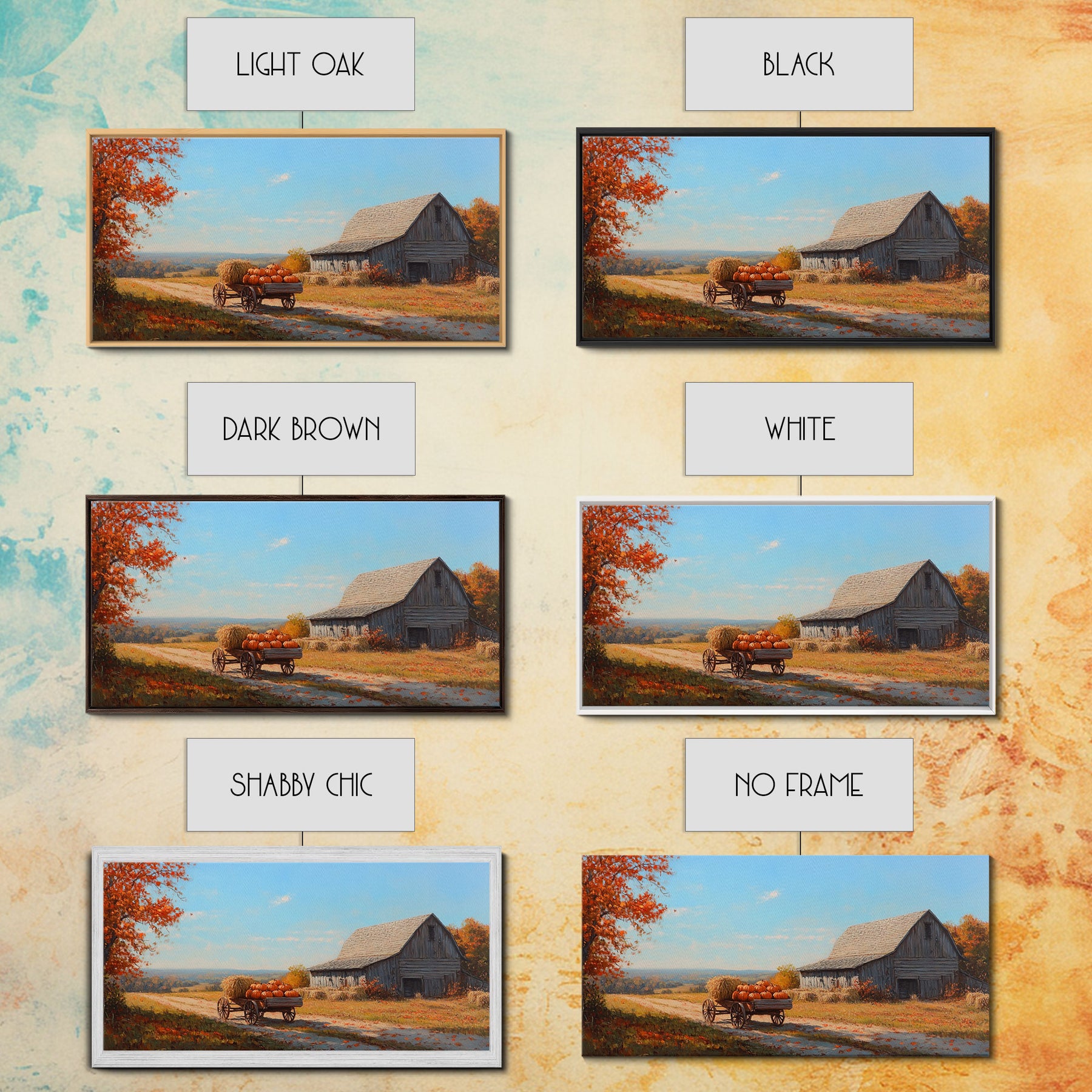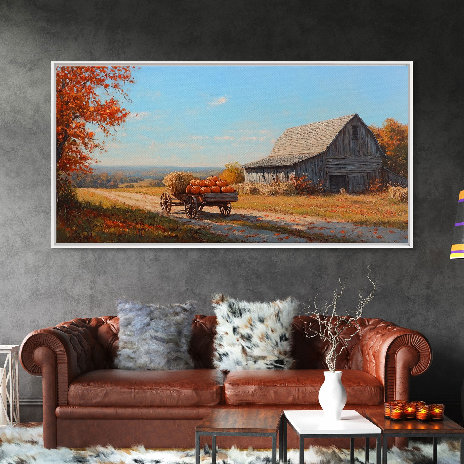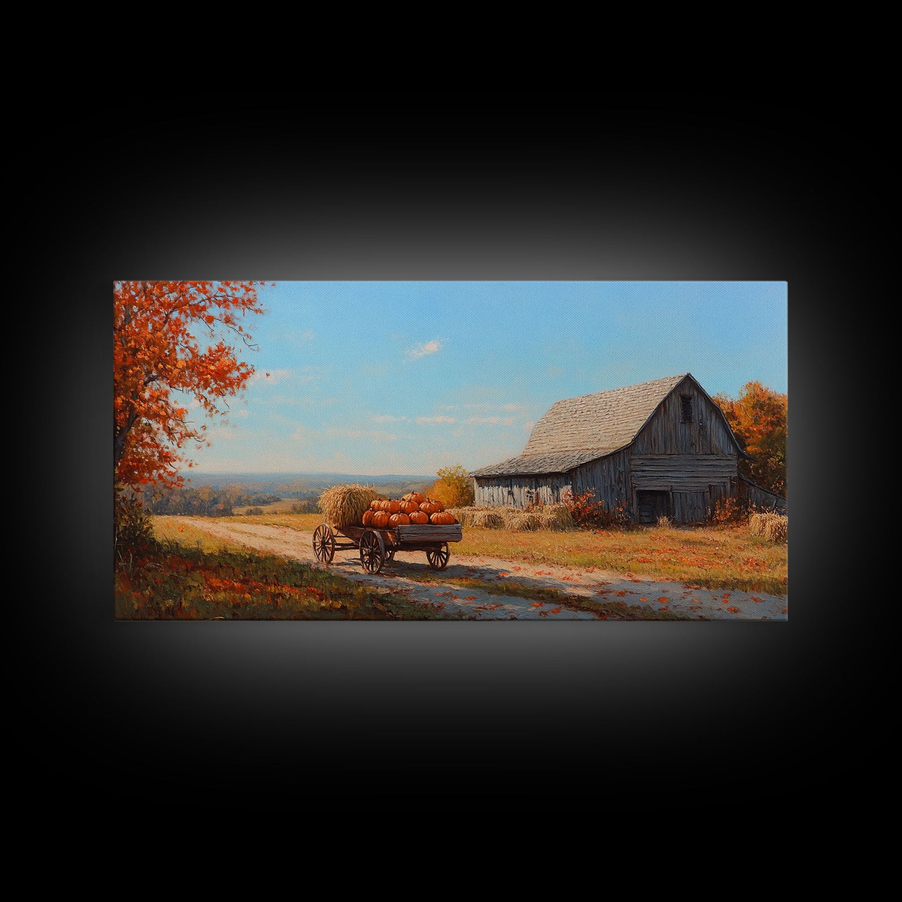 Rustic Barn with Pumpkins Framed Canvas Print, Cozy Fall Farmhouse Decor, Country Autumn Harvest Art, Seasonal Wall Art Gift Idea