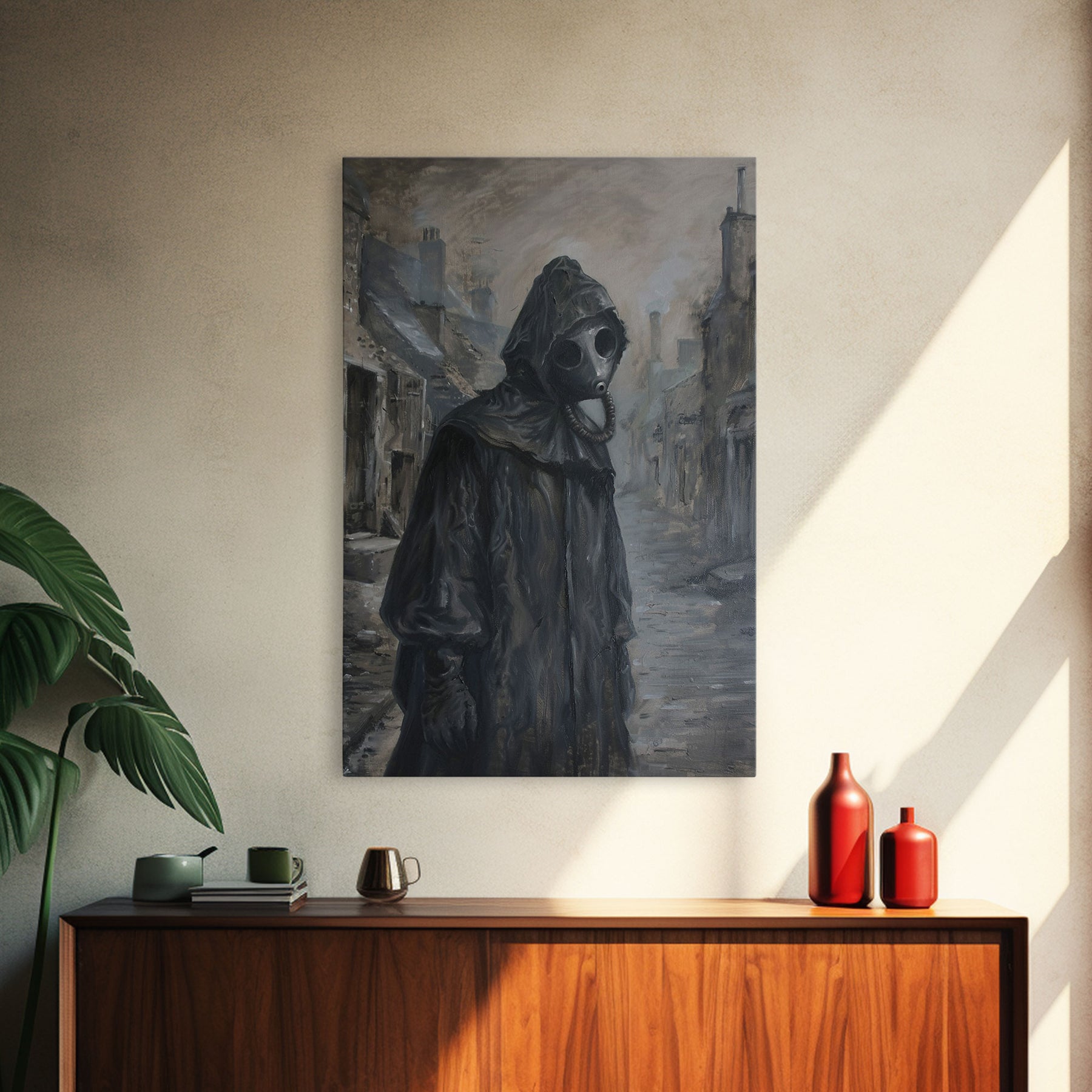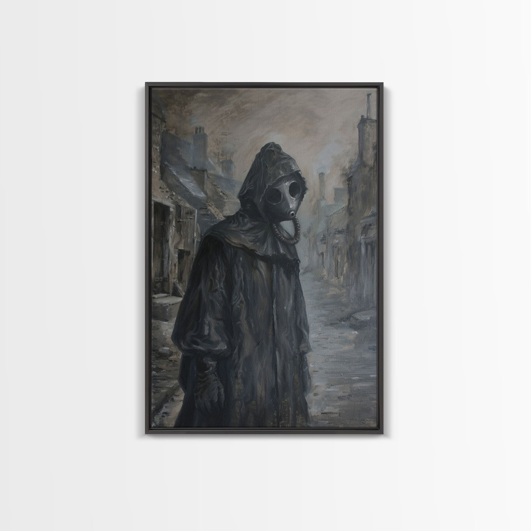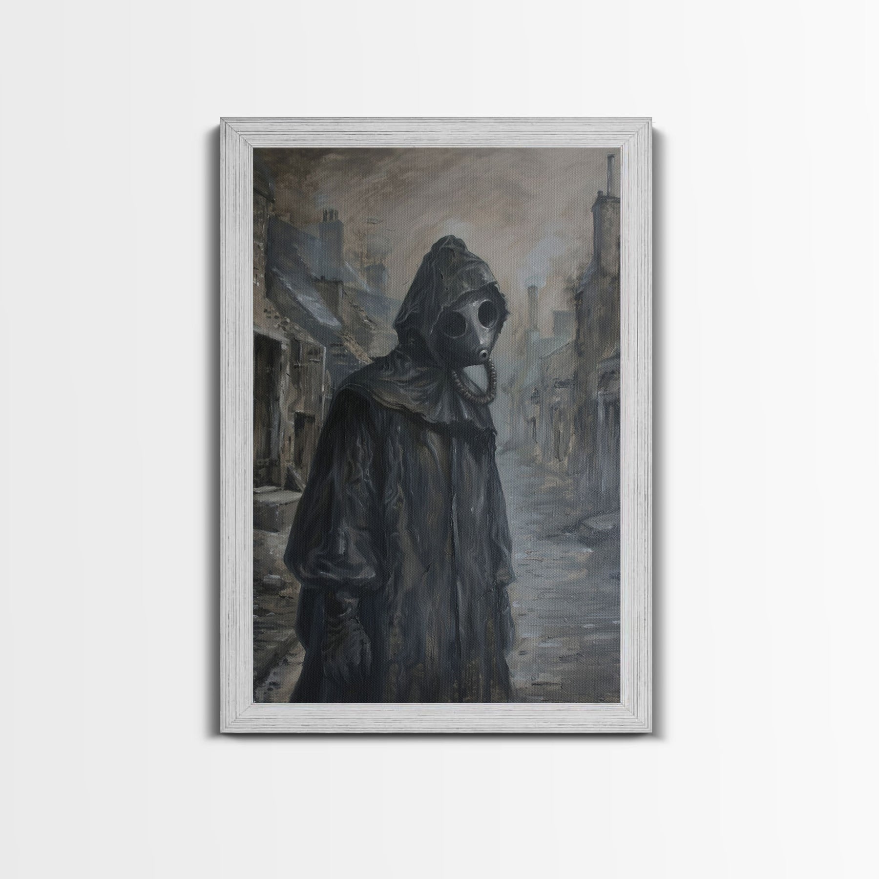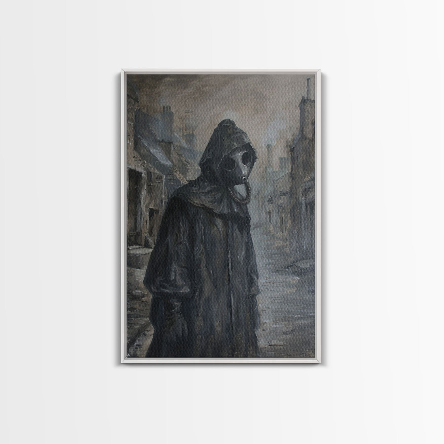 Plague Doctor in Abandoned Town | Halloween Wall Art | Spooky Home Decor | Creepy Plague Doctor Painting | Framed Canvas Print
