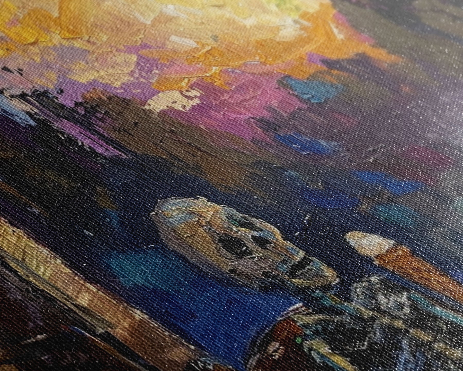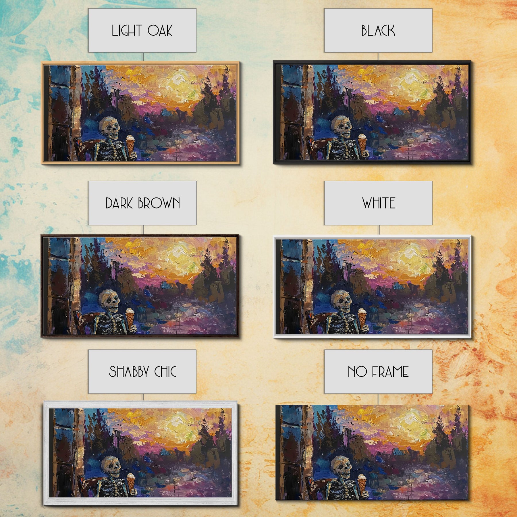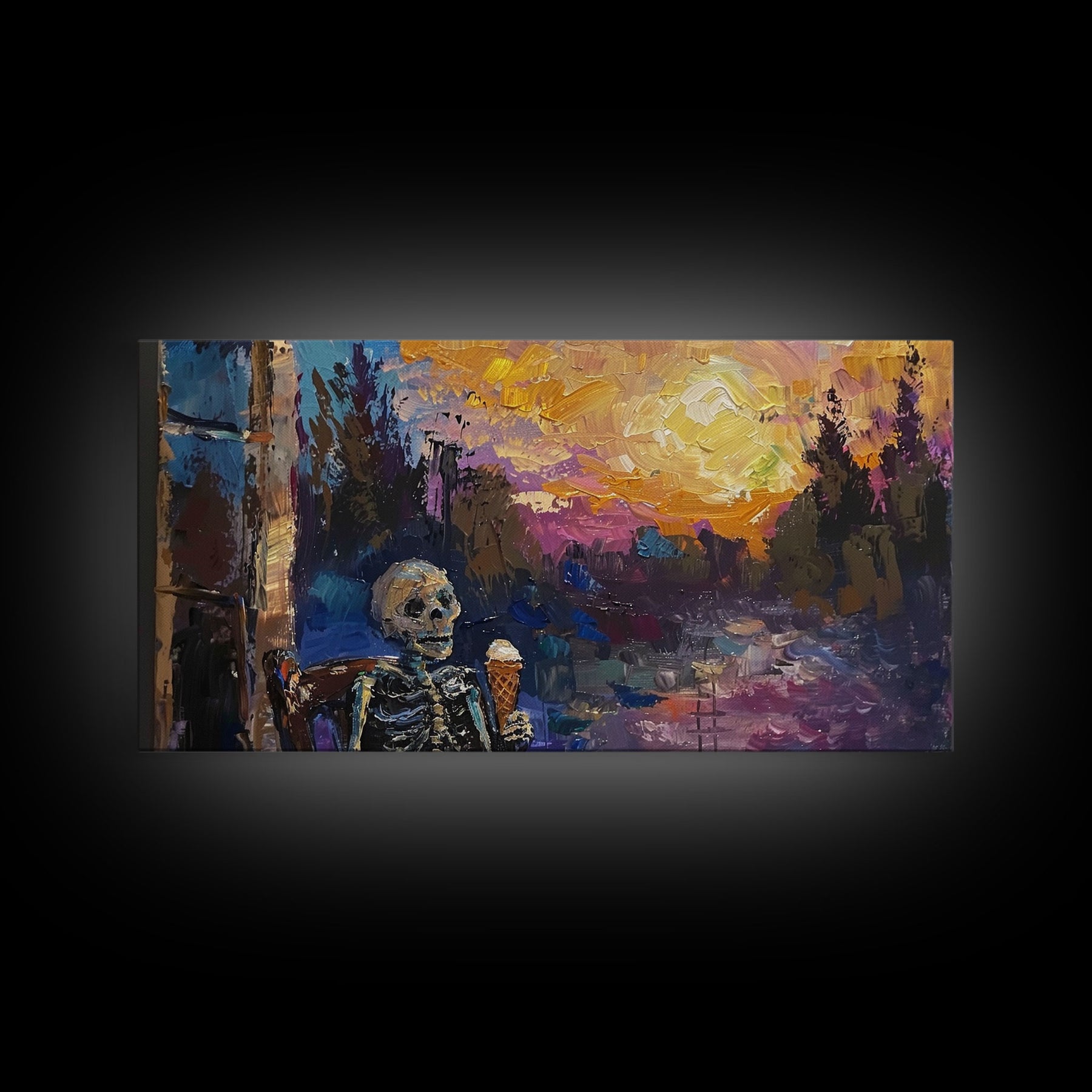 Spooky Skeleton having an ice cream cone at sunset, framed canvas print, funny halloween decor, halloween art