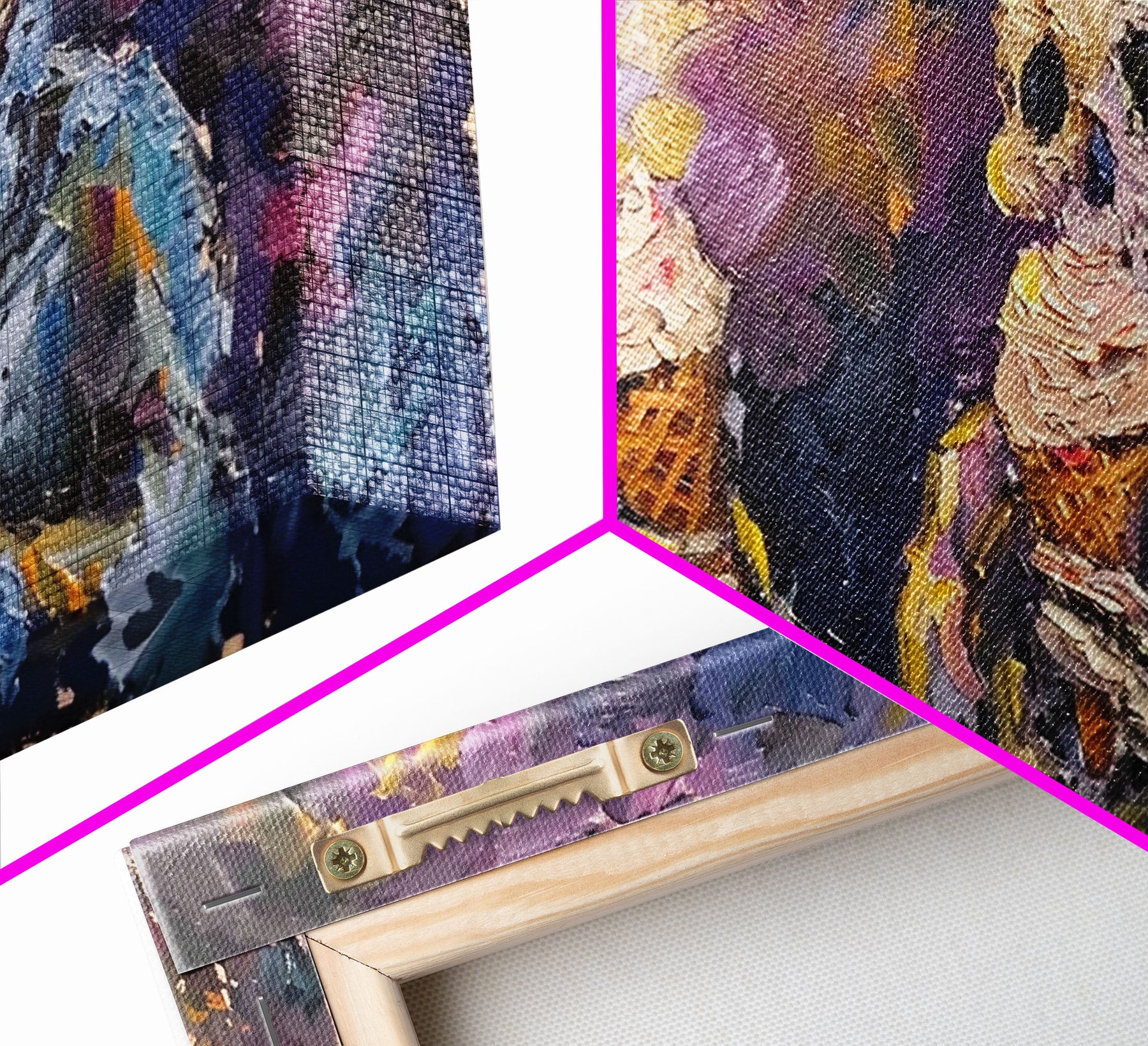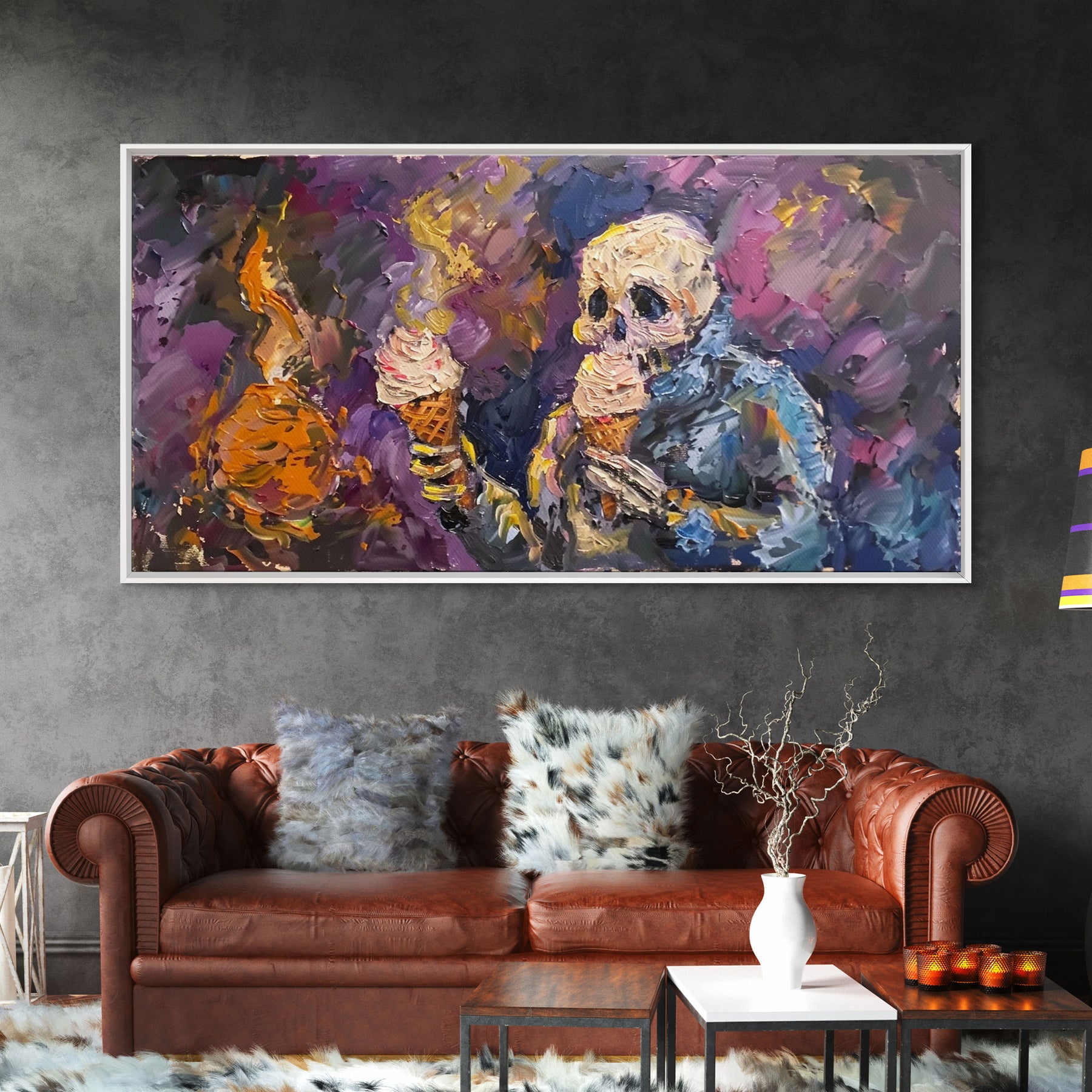 Spooky Skeleton having TWO ice cream cones! Why does he need two? Halloween Art, Framed Canvas Print