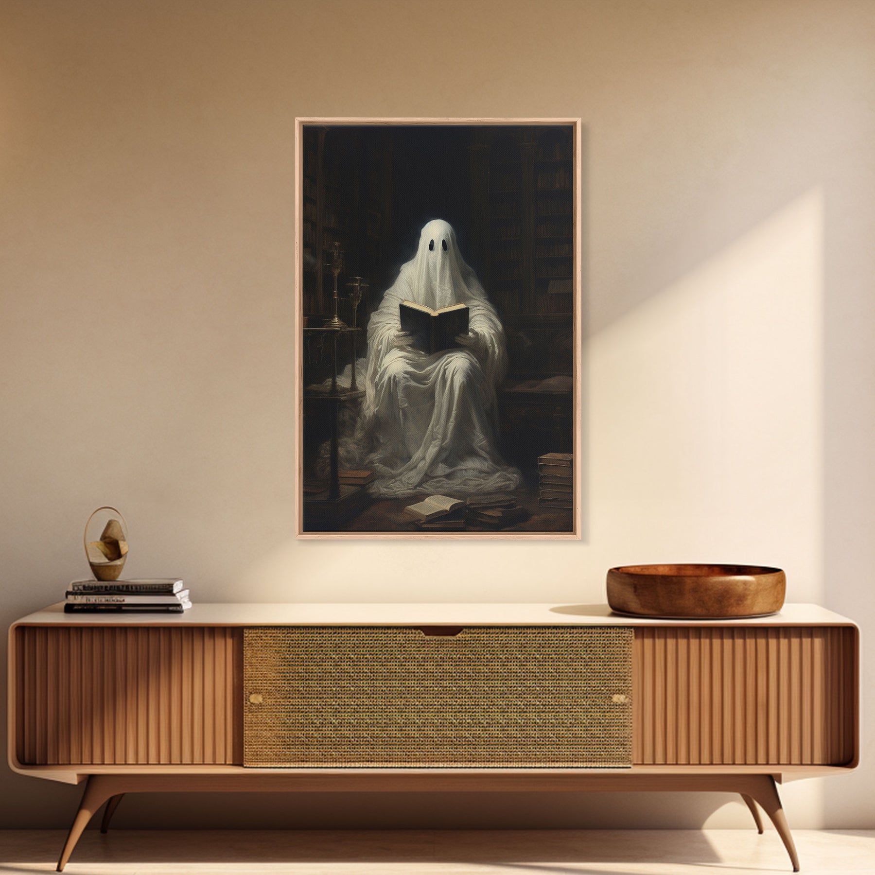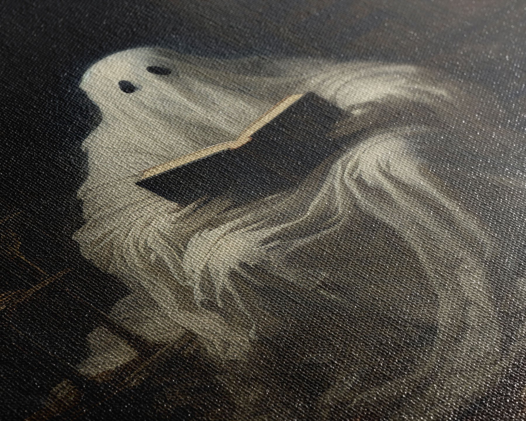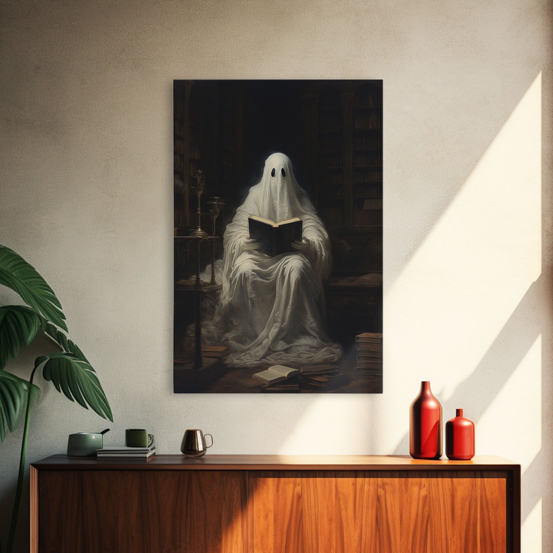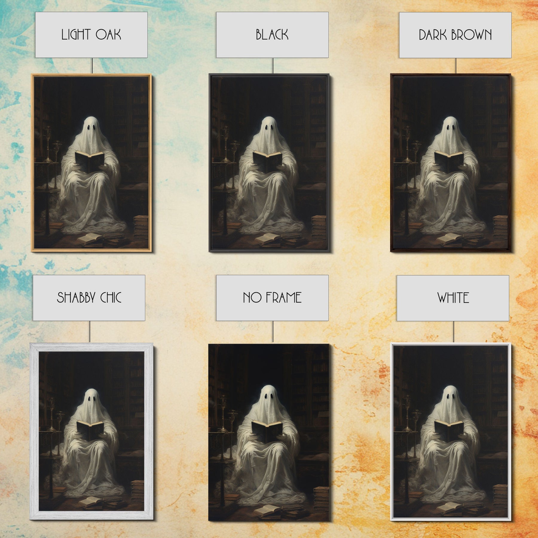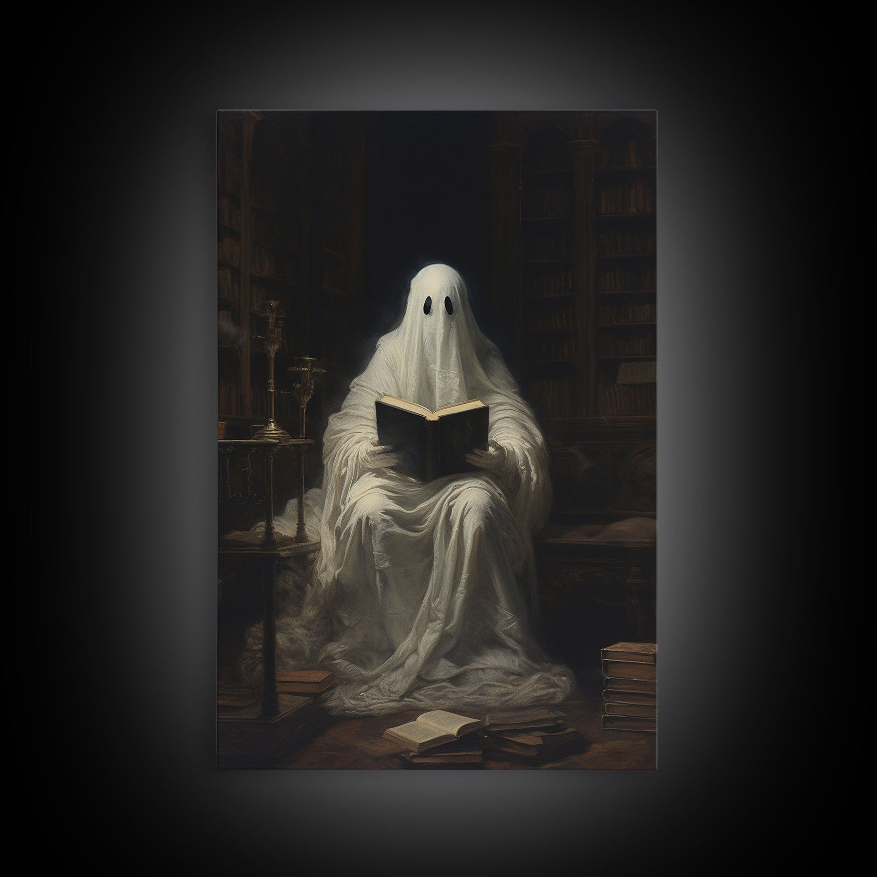 The Reading Ghost, Victorian Halloween Art, Funny Halloween, Framed Canvas, Halloween Canvas Art, Macabre Goth Art