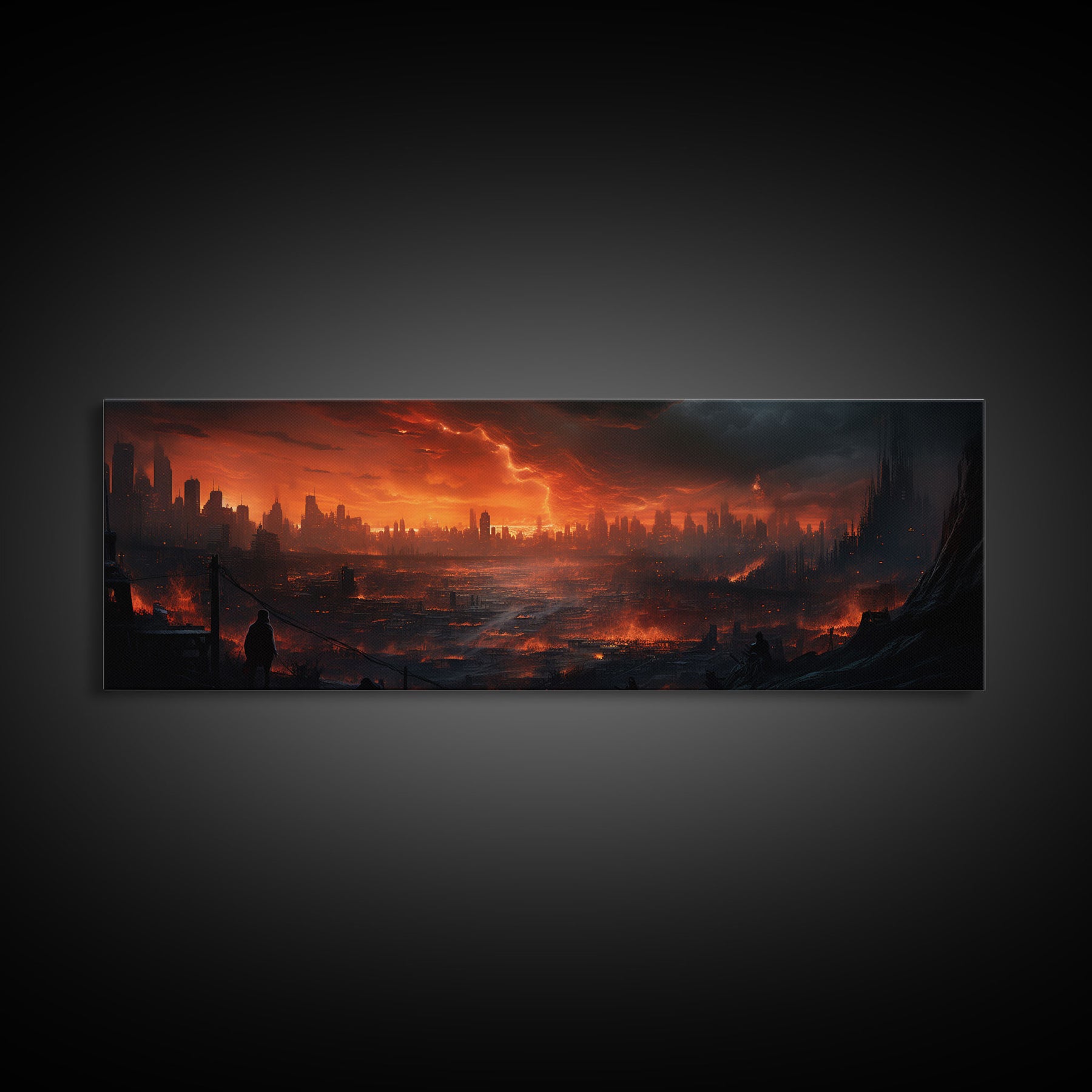 The Burning City Panoramic Canvas Print, Framed Halloween Art, Spooky Decor, Halloween Art, Halloween Wall Art, Halloween Art Print