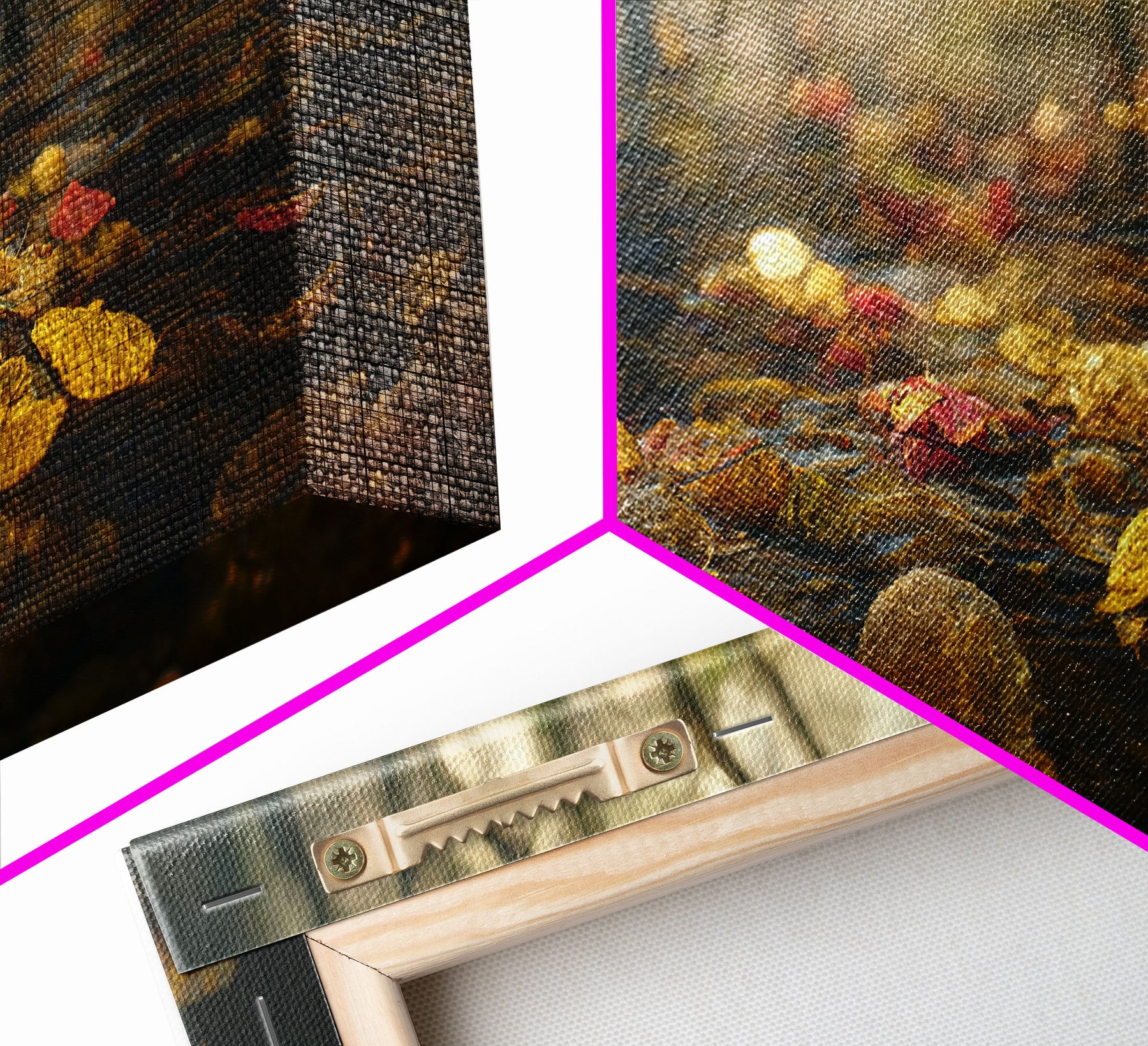 Fall leaves floating down the river, autumn, landscape and nature canvas print, oil painting style, neutral wall art