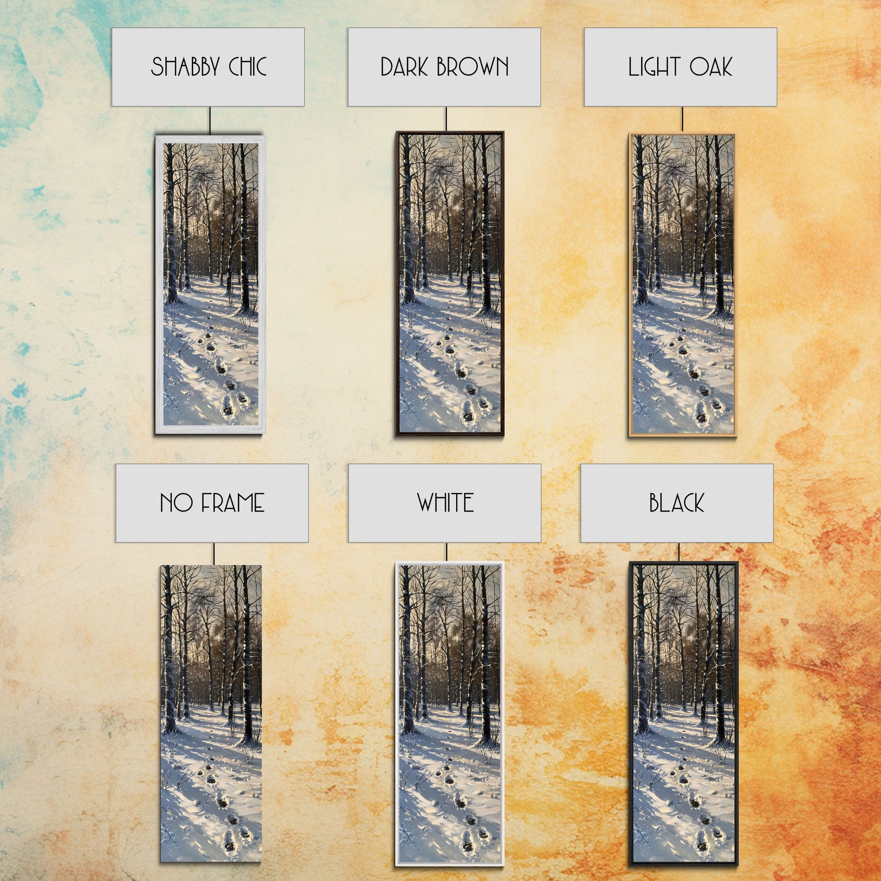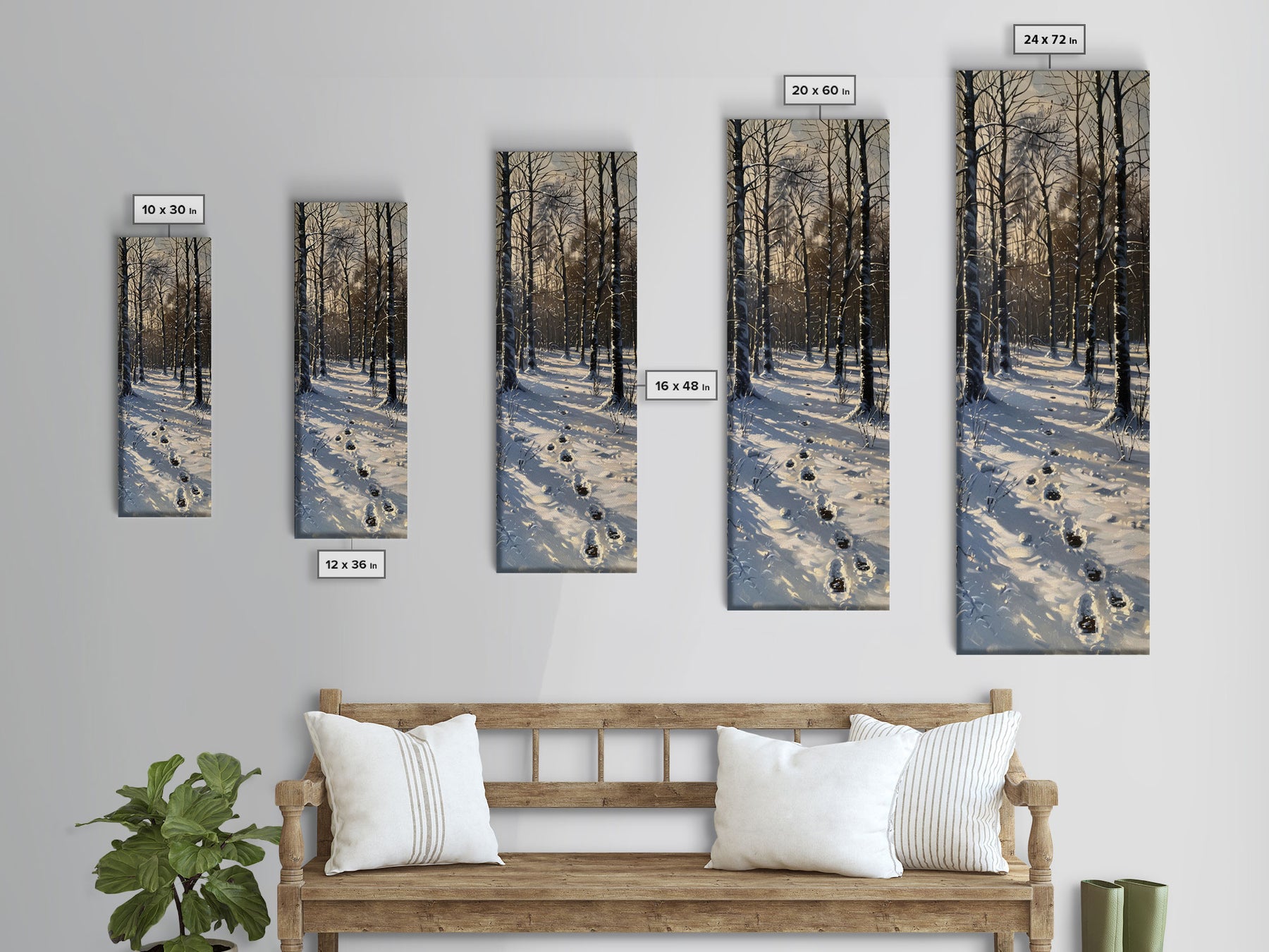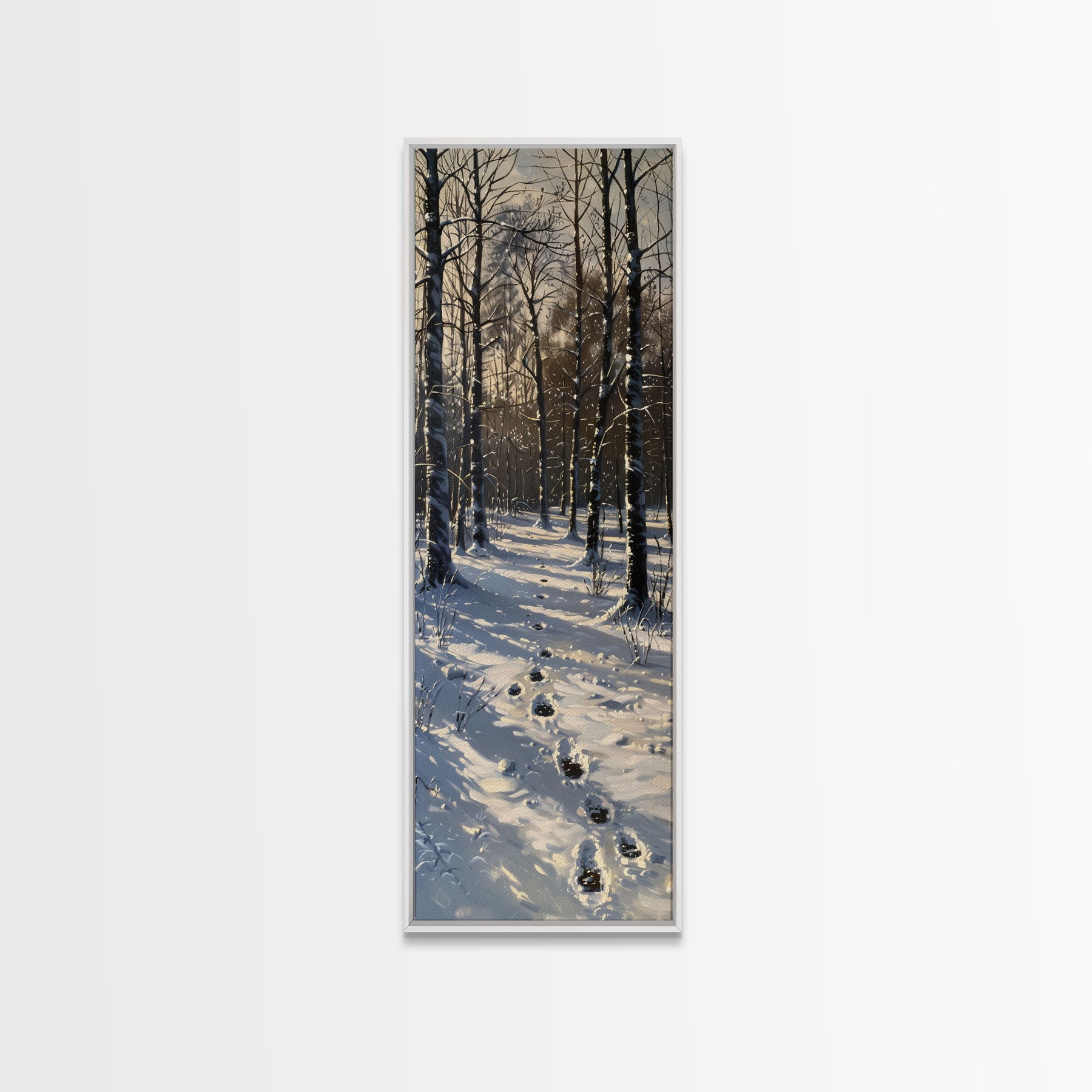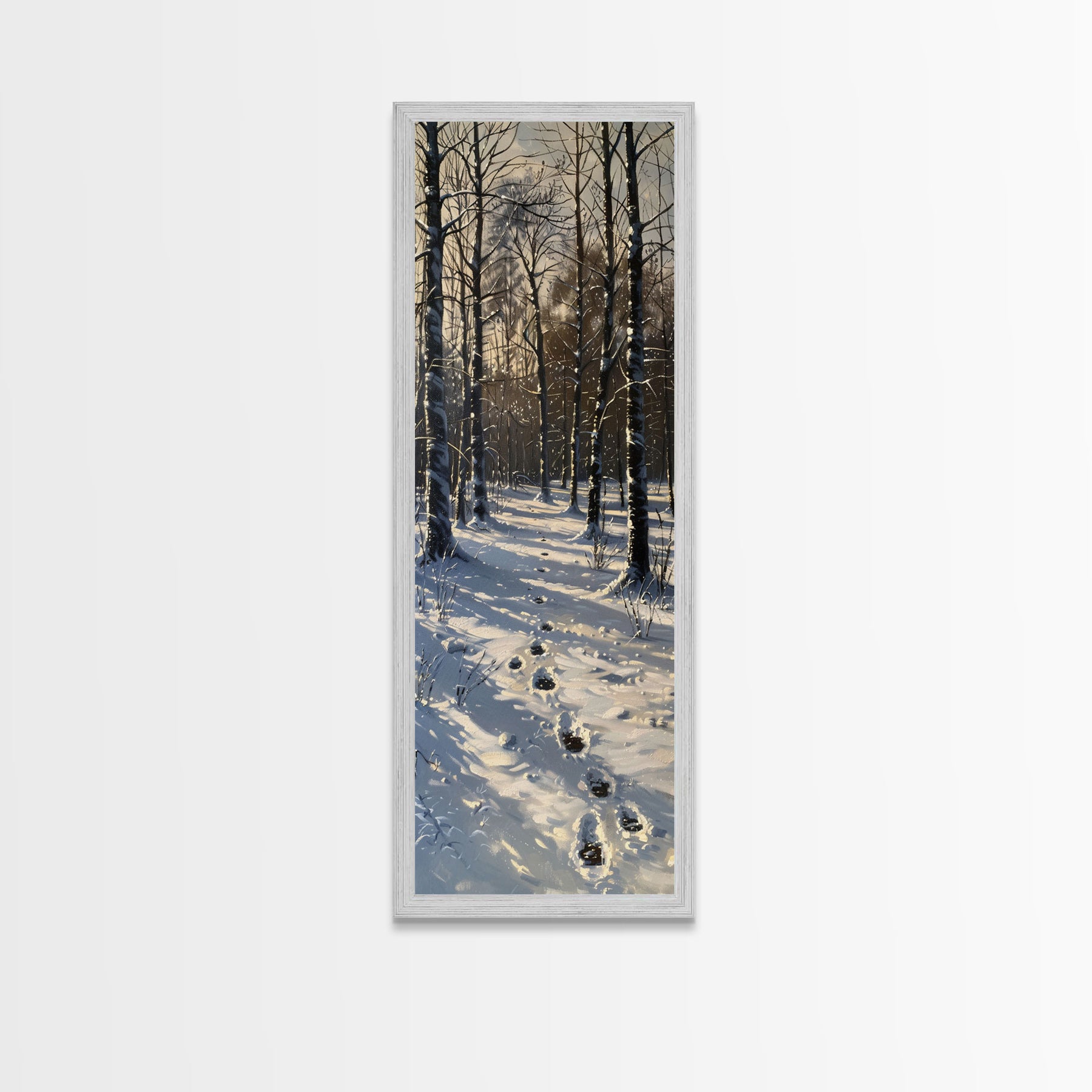 Snowy Forest Path With Footprints, Winter Scene In Farmhouse Style, Tall Canvas Print For Rustic Boho Wall Art