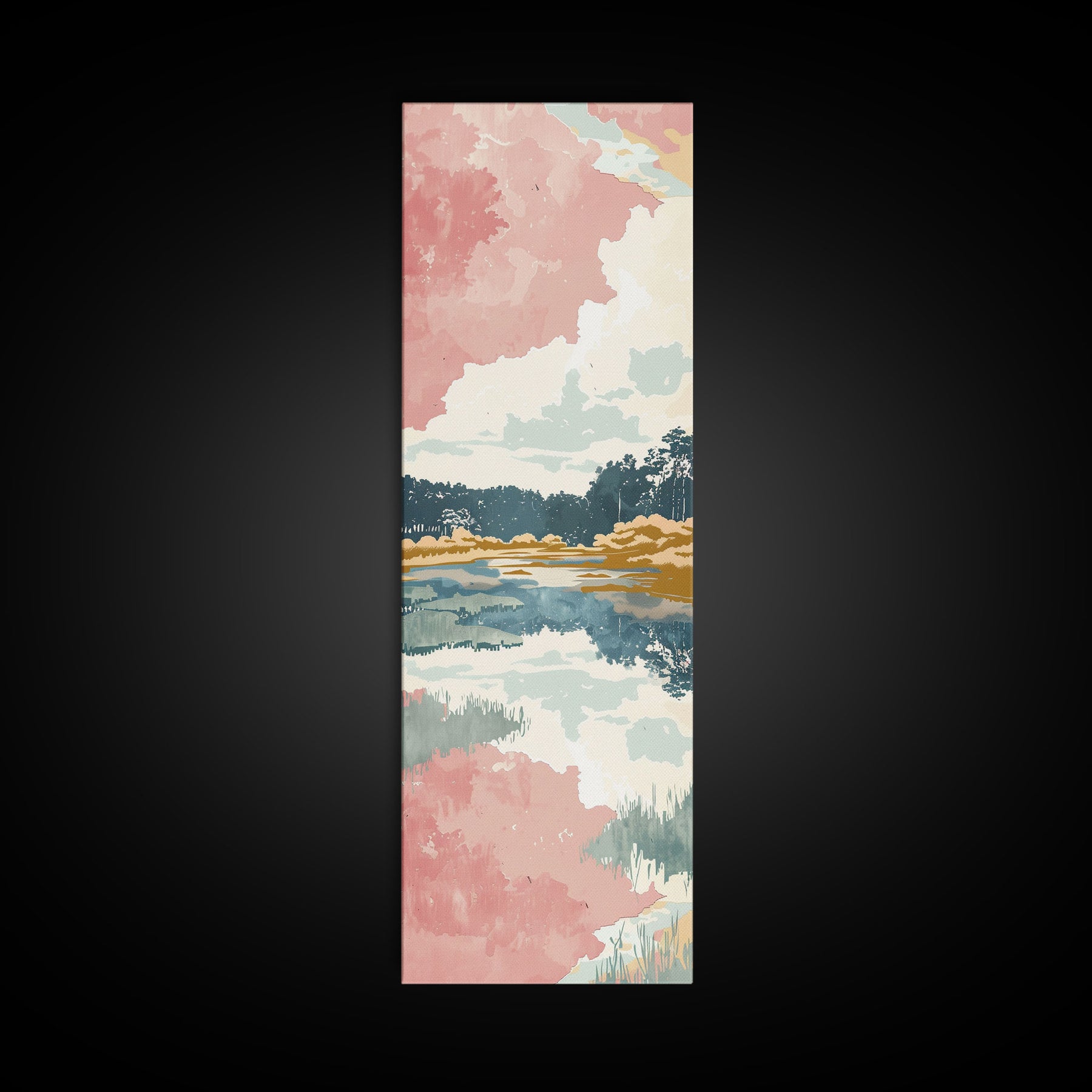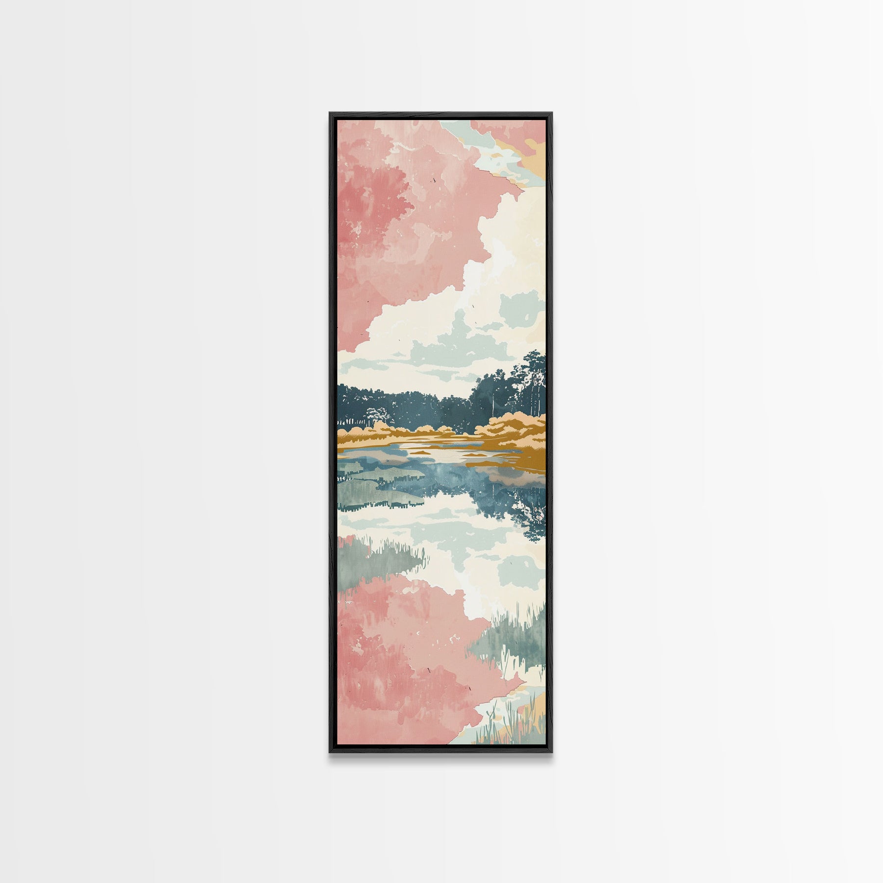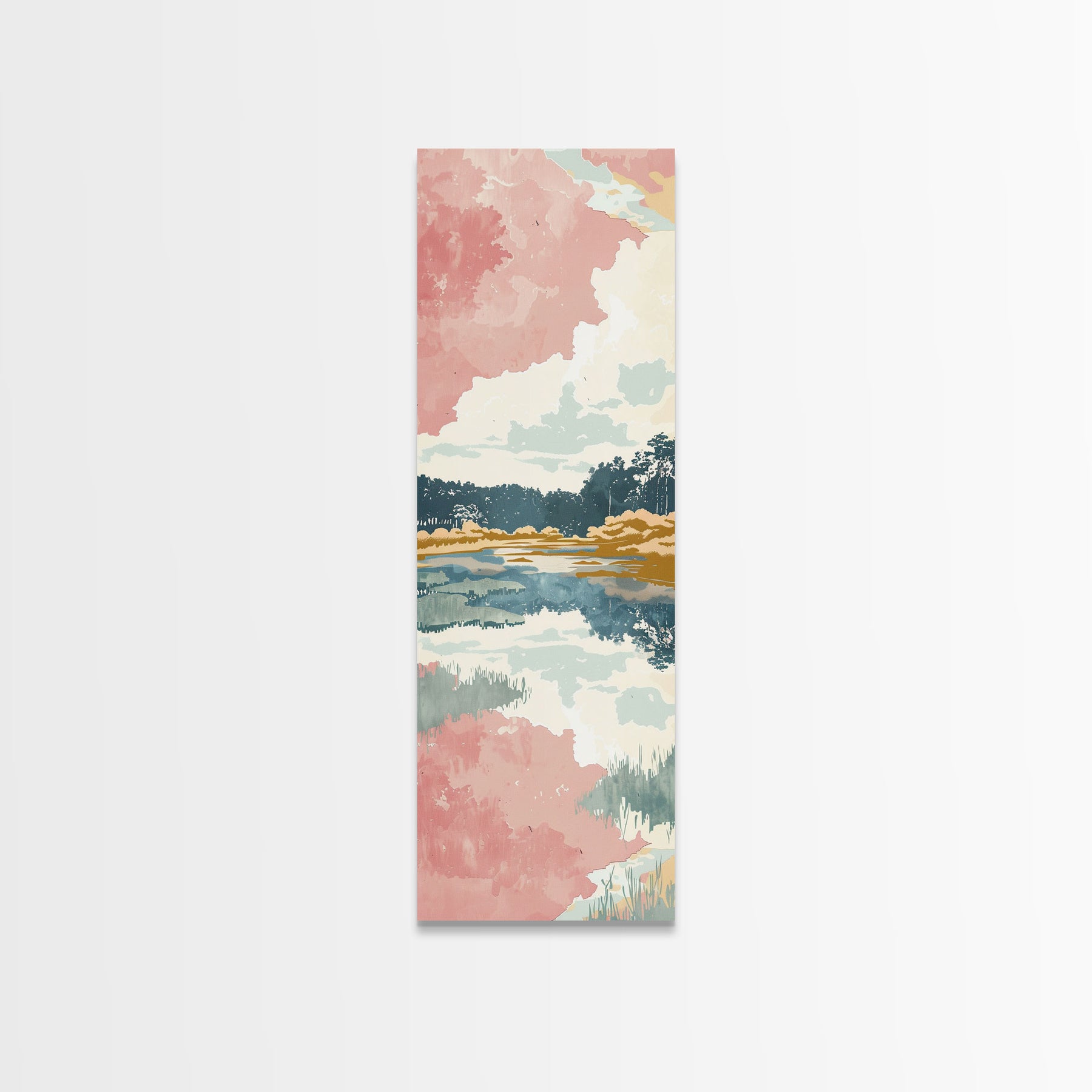 Tall Skinny Art Japanese Style Wood Block Print Serene Lake Scene With Pastel Reflections For Framed Canvas Print In Ukiyo-e Style