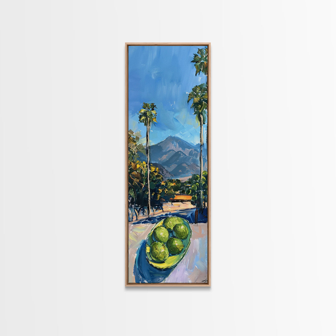 Tall and Narrow Palm Tree California Landscape Art Print Framed on Canvas, Printed Wall Art, Gouache Style Landscape Painting, Mountain Art