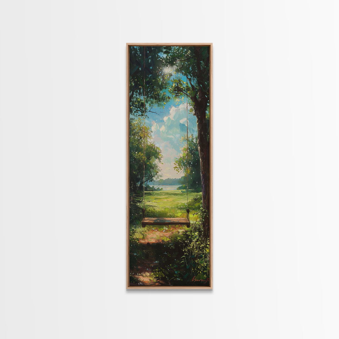 The Tree Swing Framed Canvas Print, Spring Time Decor, Tall Art, Statement Piece, Whimsical Boho Style Wall Art