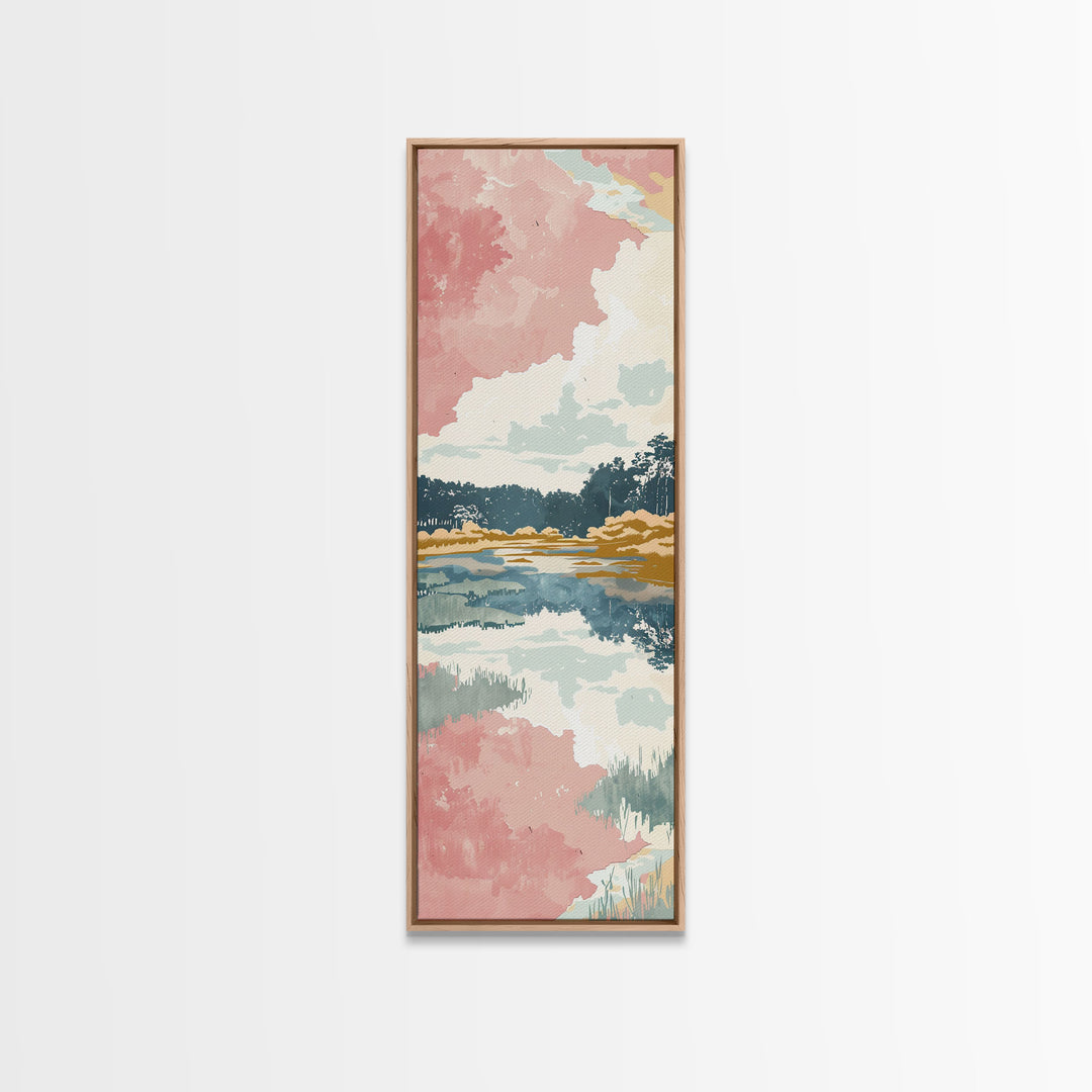 Tall Skinny Art Japanese Style Wood Block Print Serene Lake Scene With Pastel Reflections For Framed Canvas Print In Ukiyo-e Style