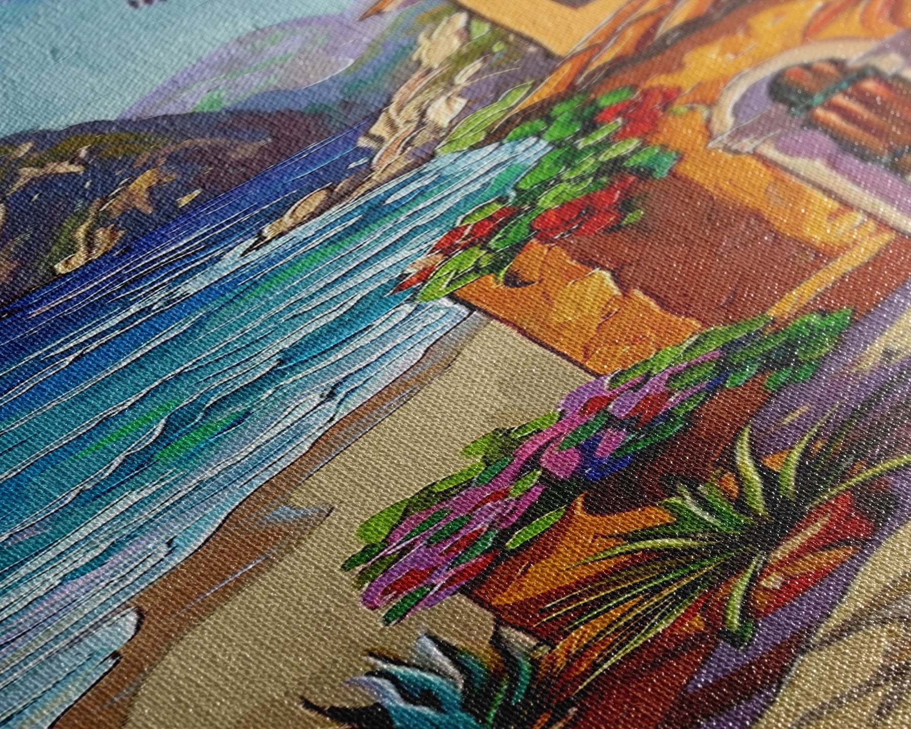 Most of our canvases are made in the USA, with the exception of canvases ordered with the light oak unstained frames, and any large canvases (24x48, 30x60, 16x48 and 20x60) ordered WITH a frame. These are temporarily made in and shipped from Europe, while we try to find a more consistent supplier in the USA.