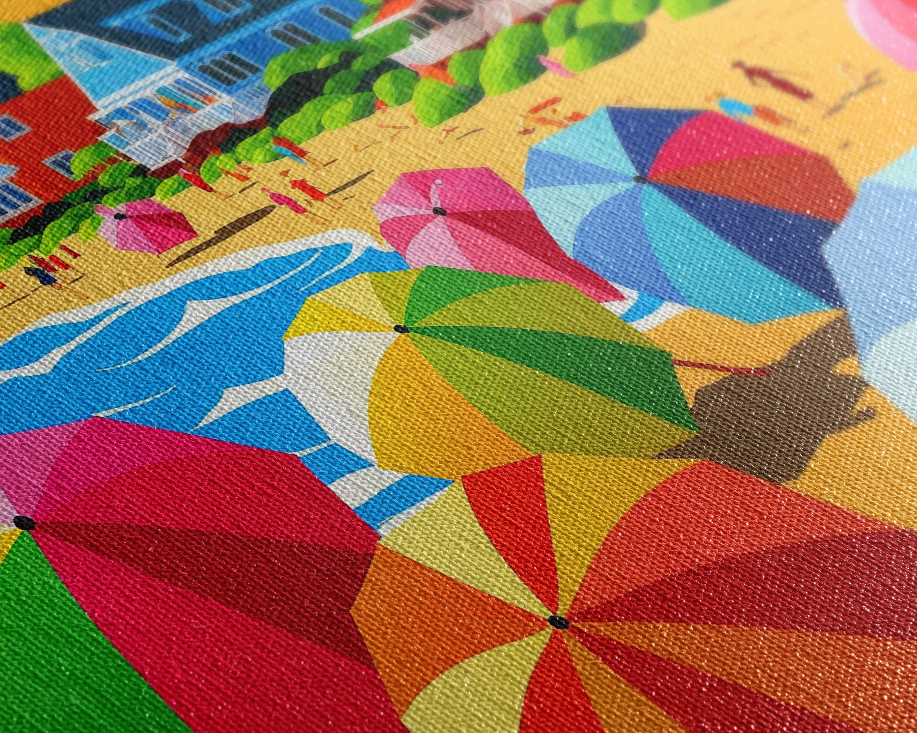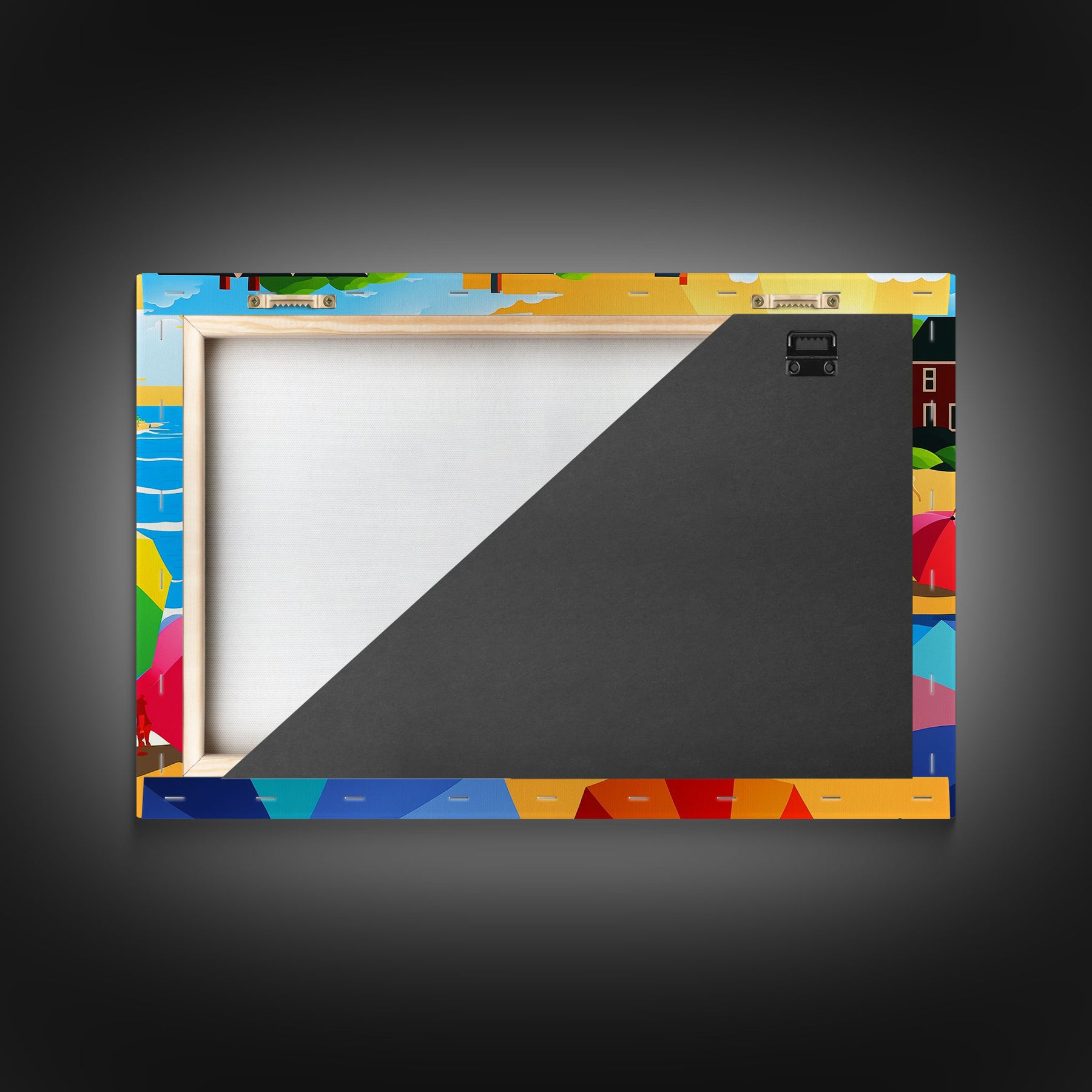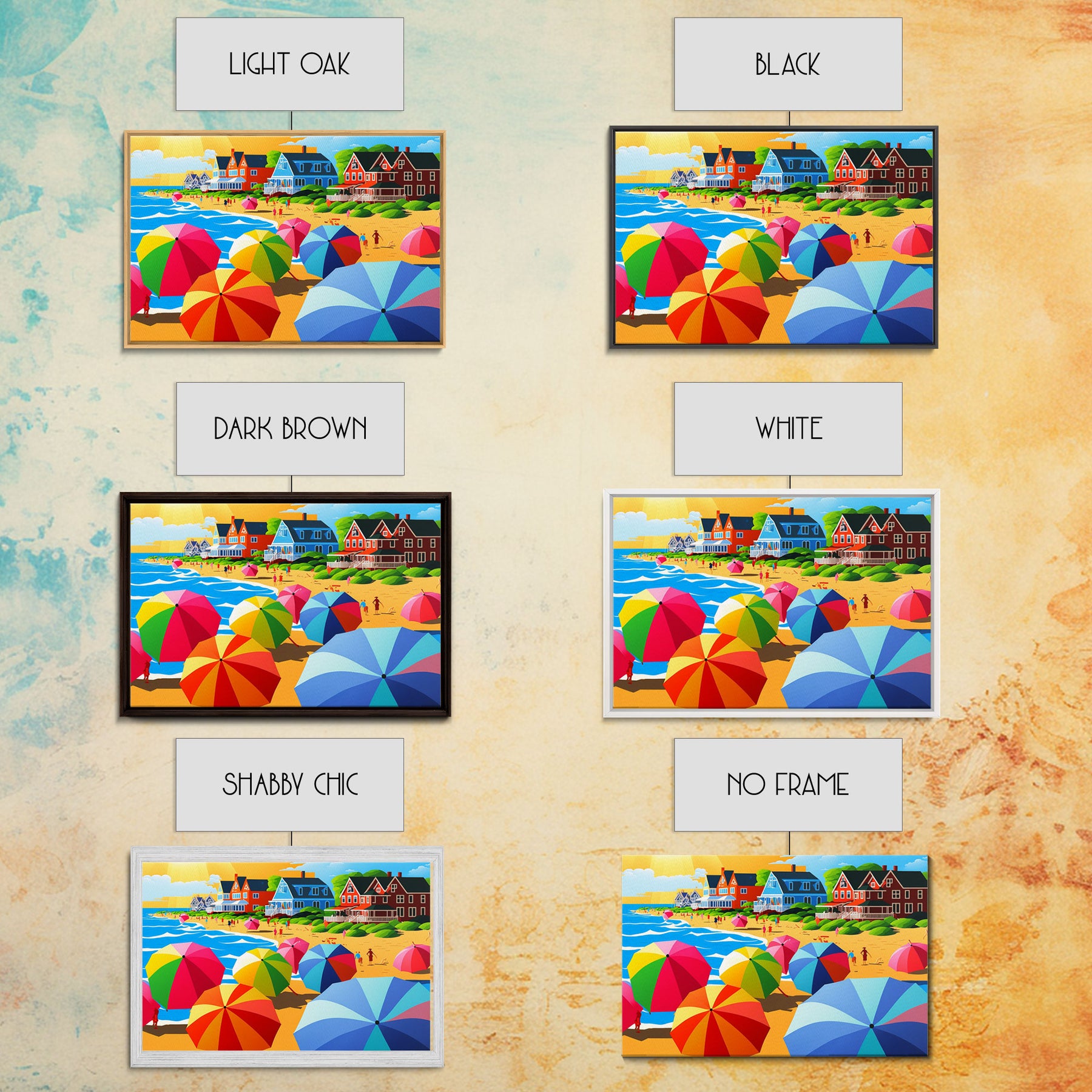 The Beach Crowd, Art Deco Pop Art Mashup, Framed Canvas Print, Colorful Beach Umbrellas, Beach House Lake House Decor