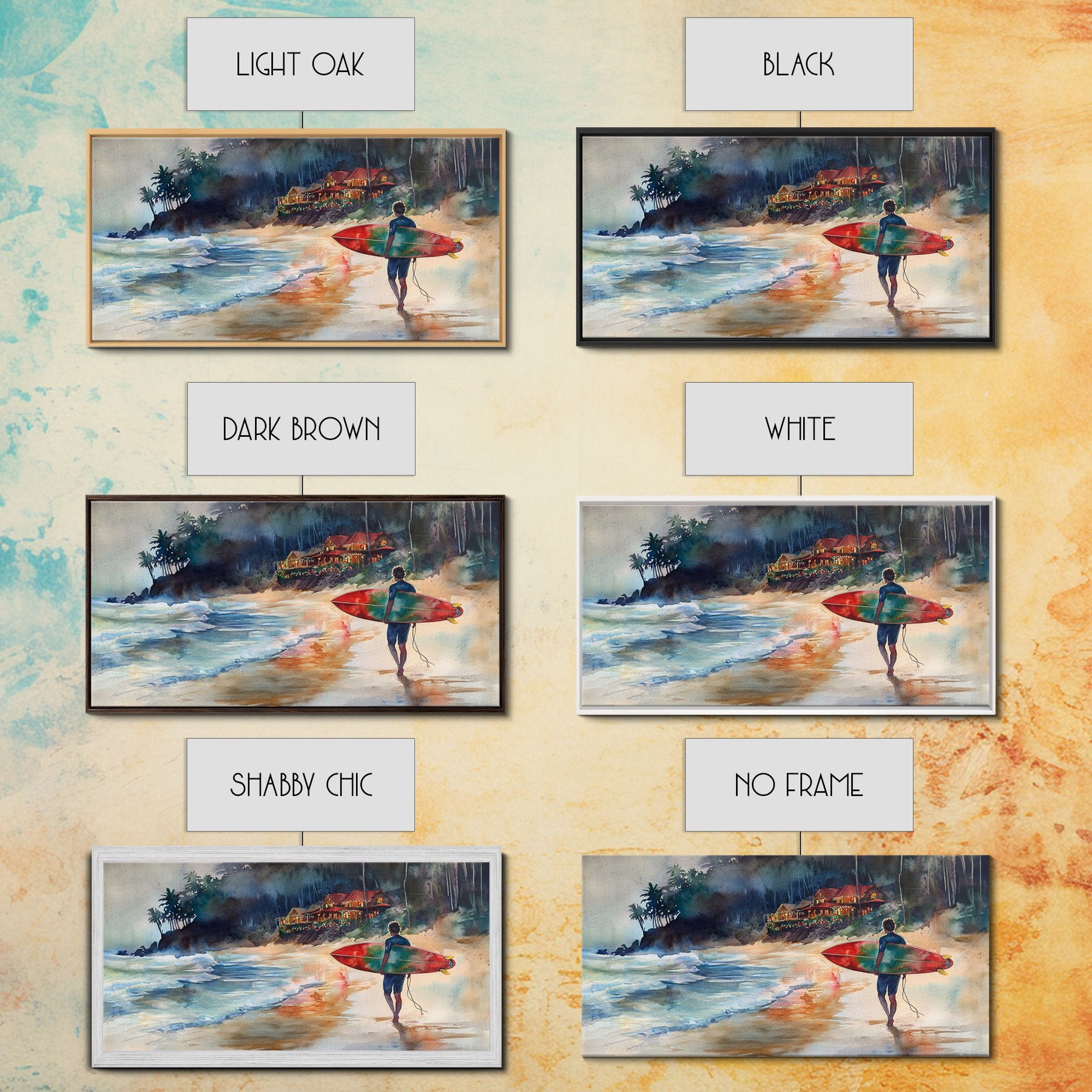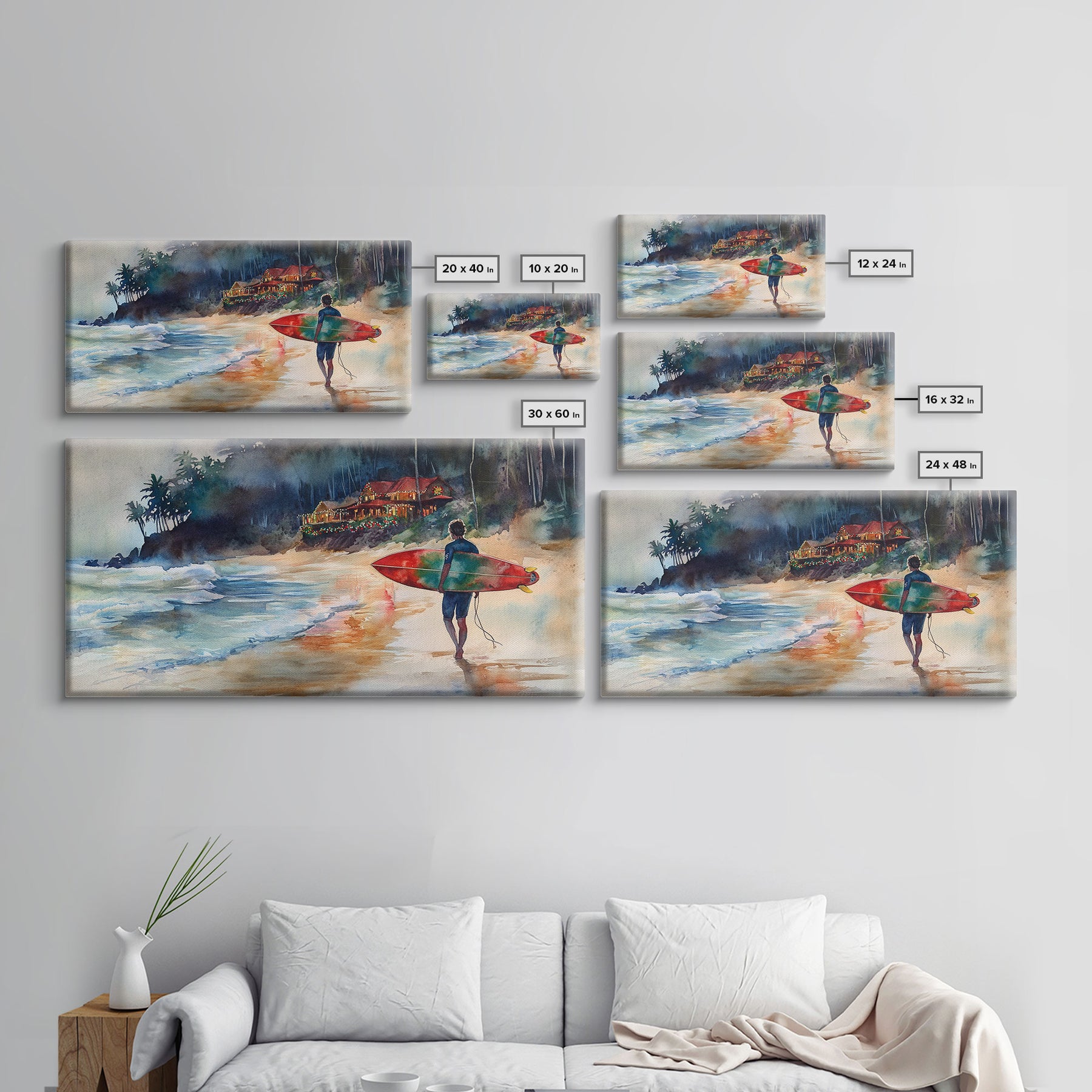 Surfer at Coastal Christmas House Canvas Print | Tropical Christmas Wall Art | Beach House Holiday Decor | 2024 Coastal Christmas Art Gift