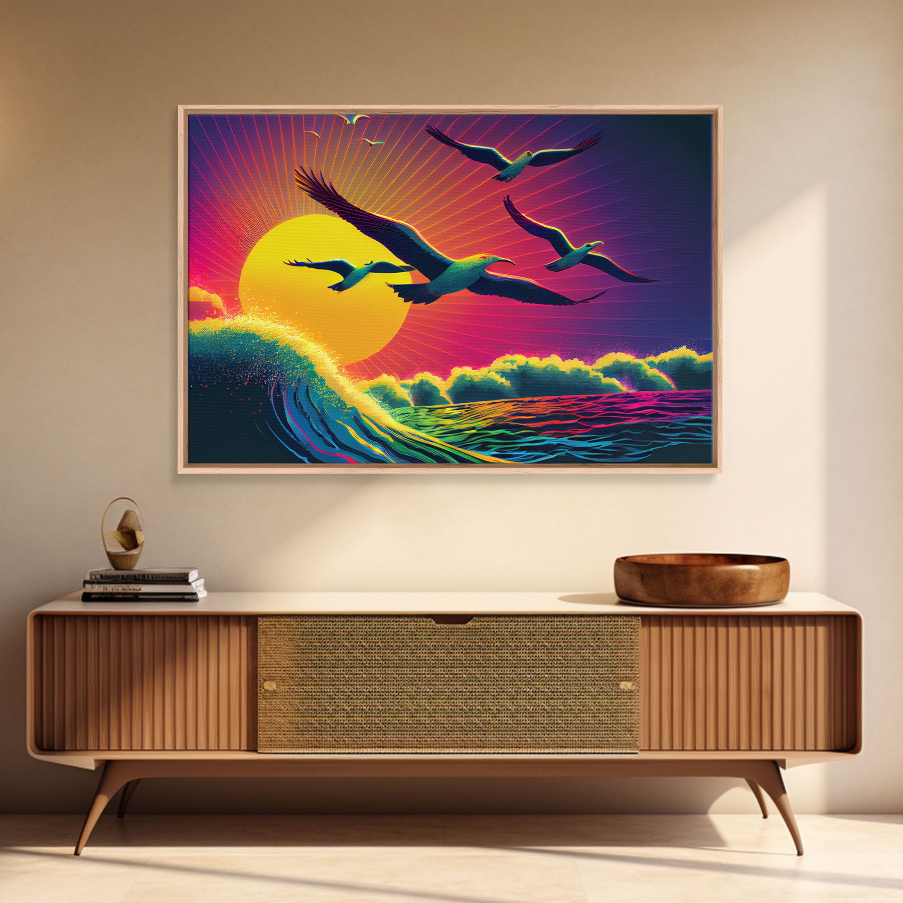 Flock of Seagulls, art deco style sun, framed canvas print, synthwave retrowave animal art