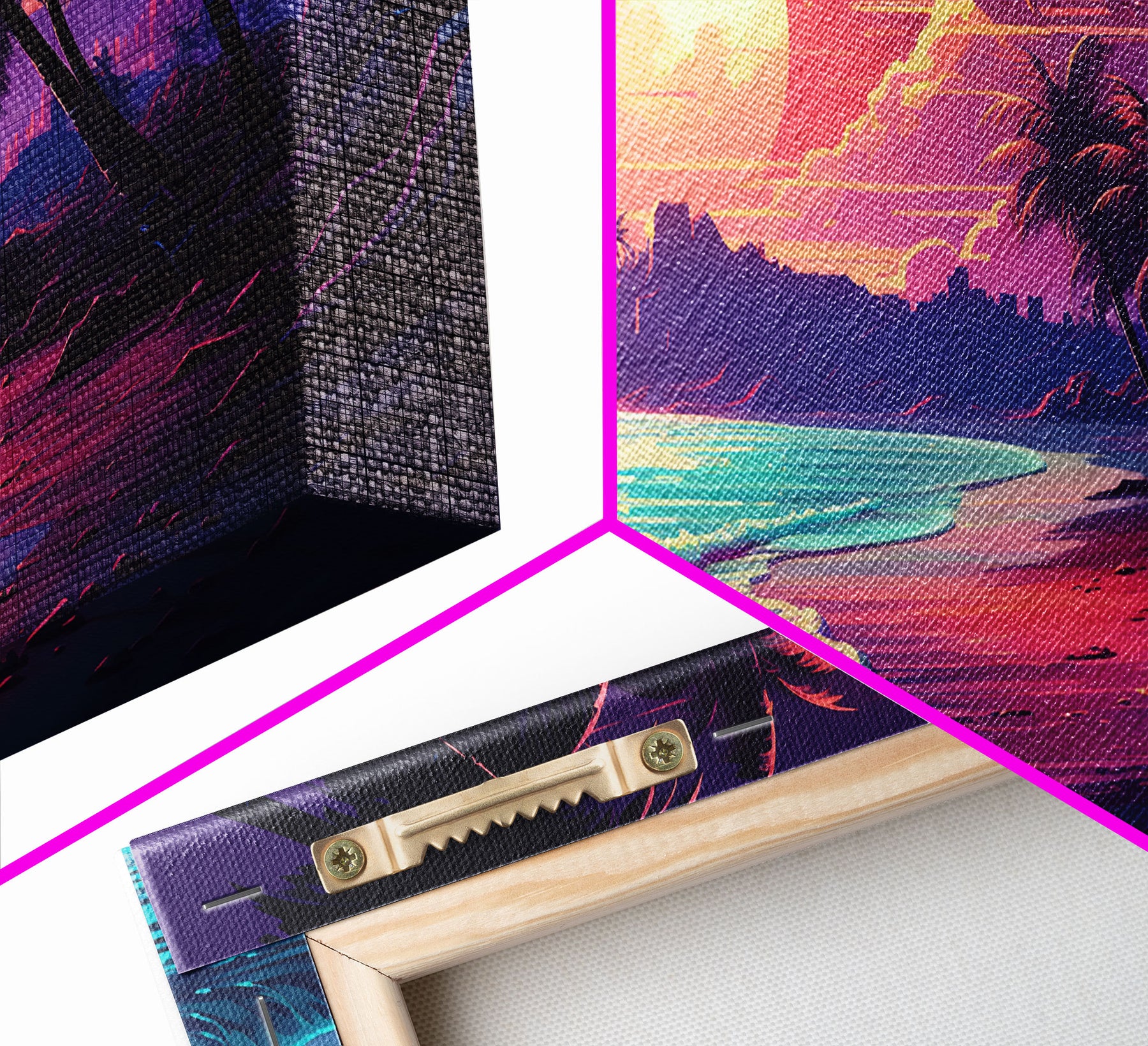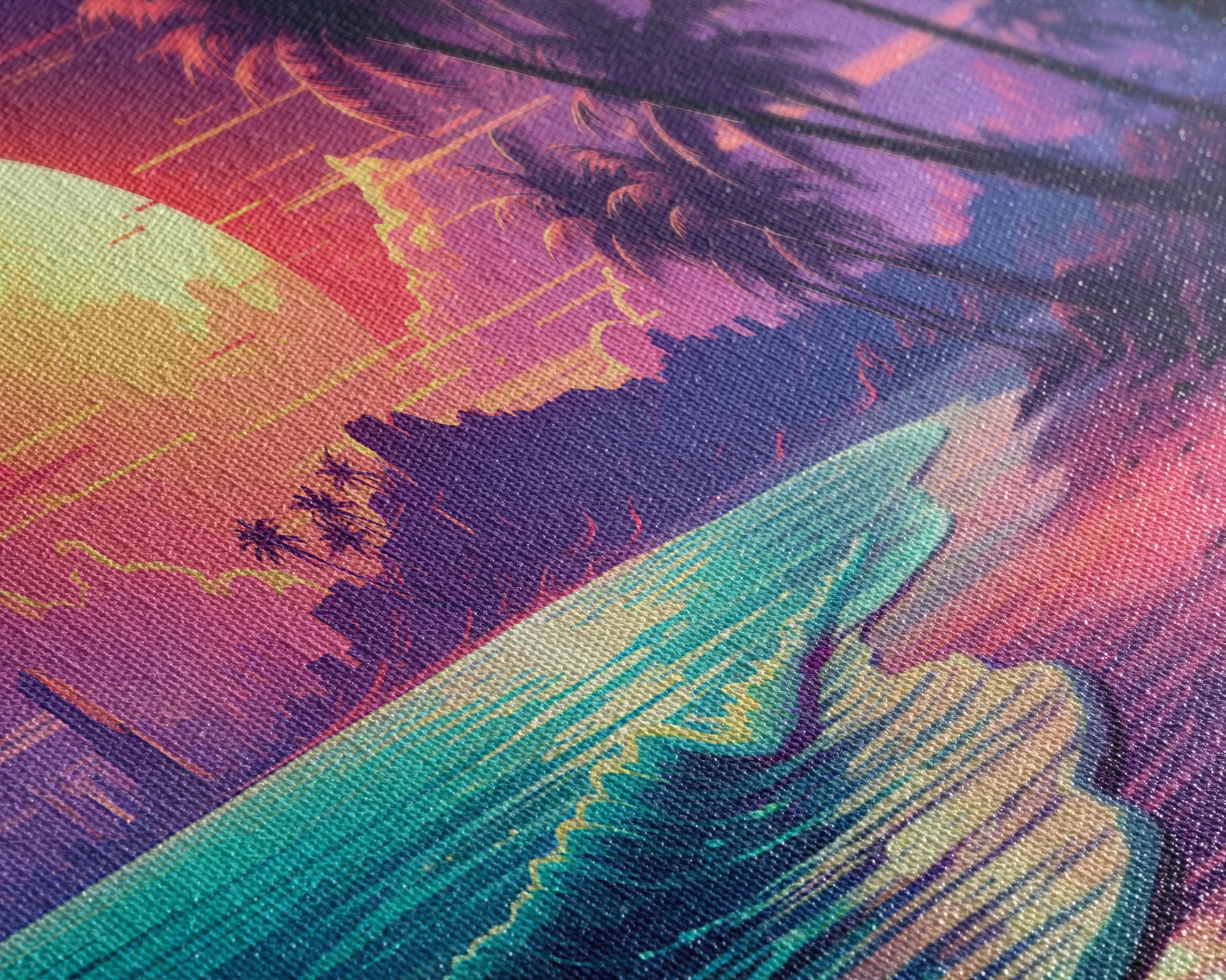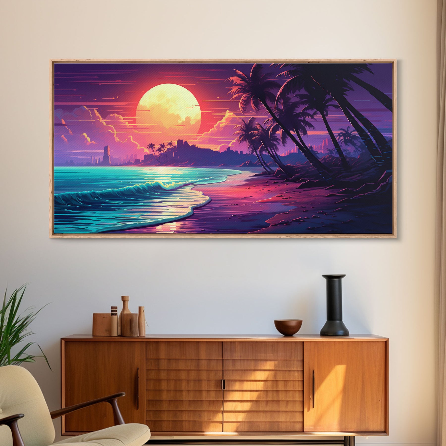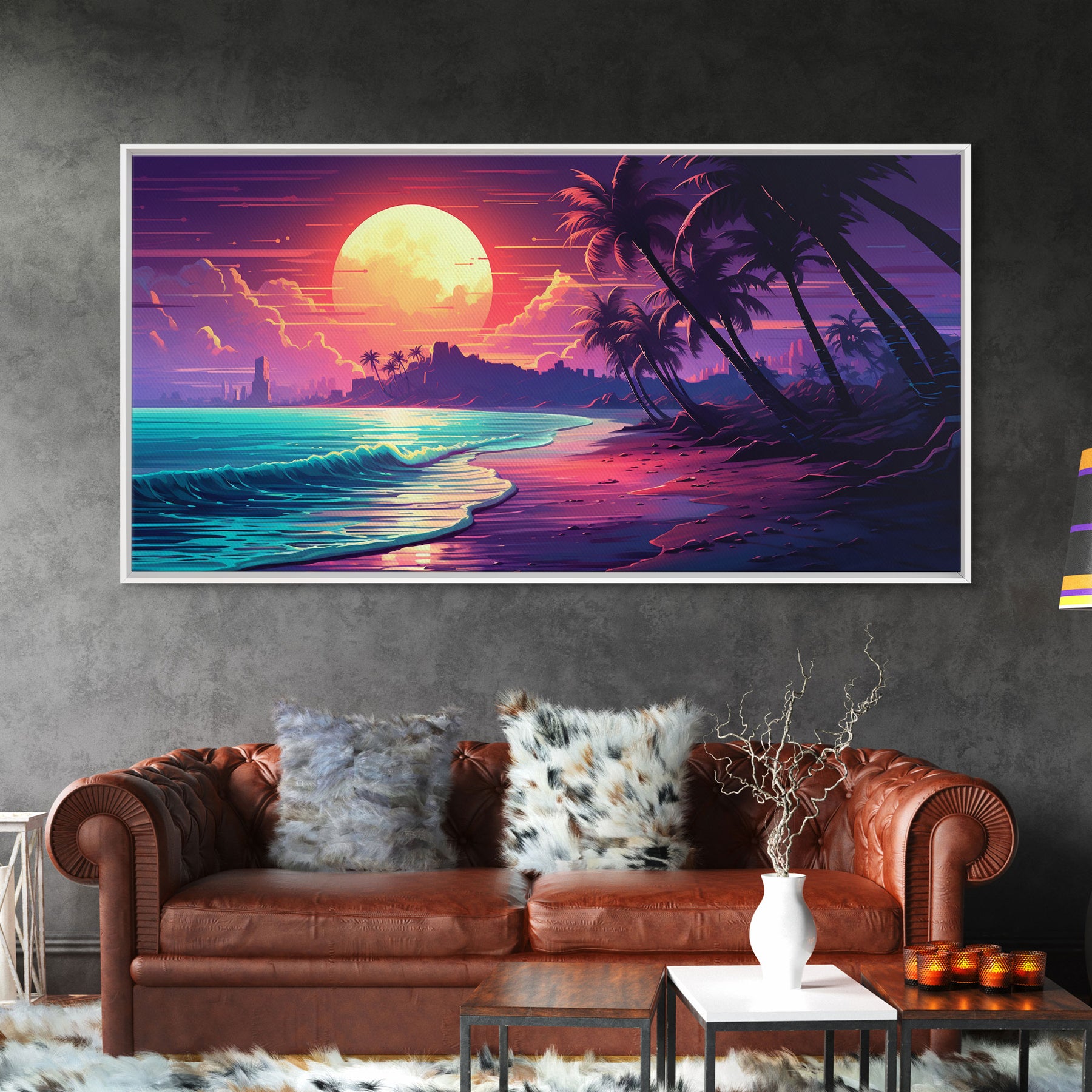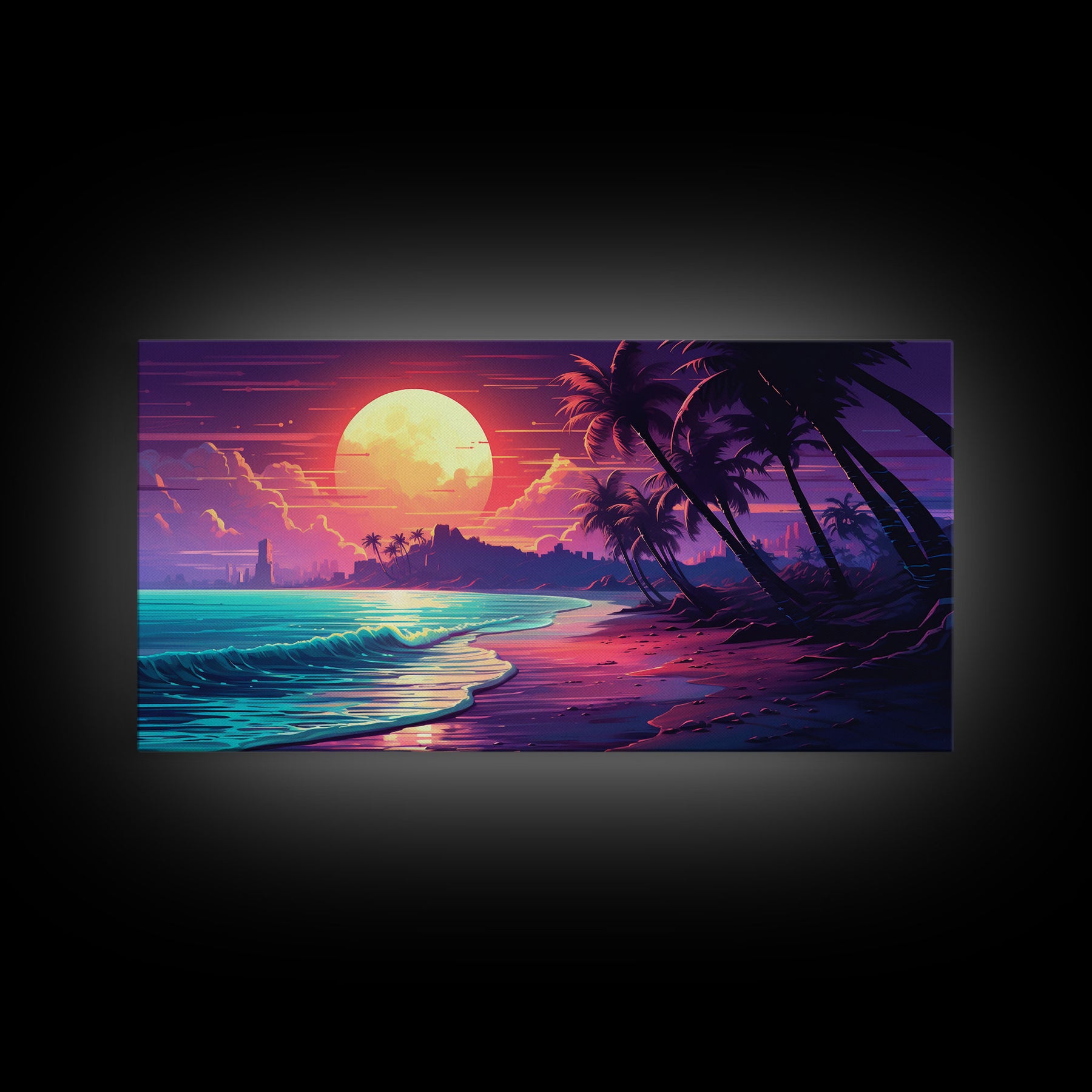 Outrun Vibes, Sunset Over The City and Beach, Palm Tree Decor, Game Room Art, Aesthetic Posters, Retro Art, 80s Vibes, 80s Art