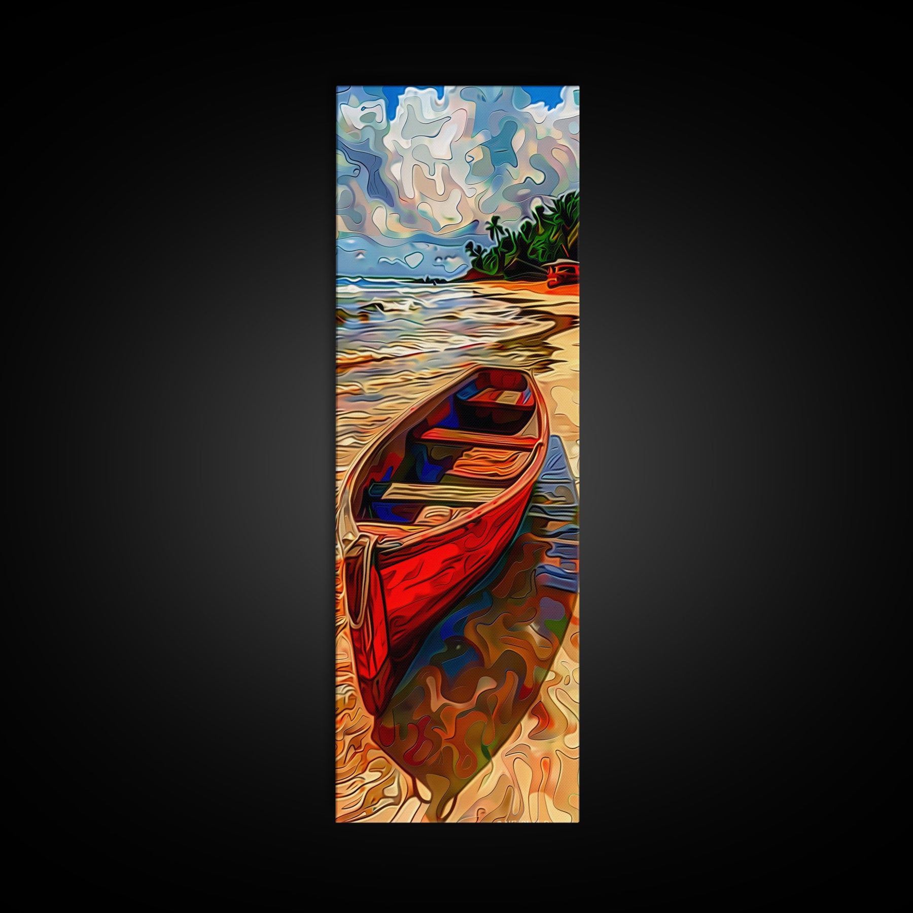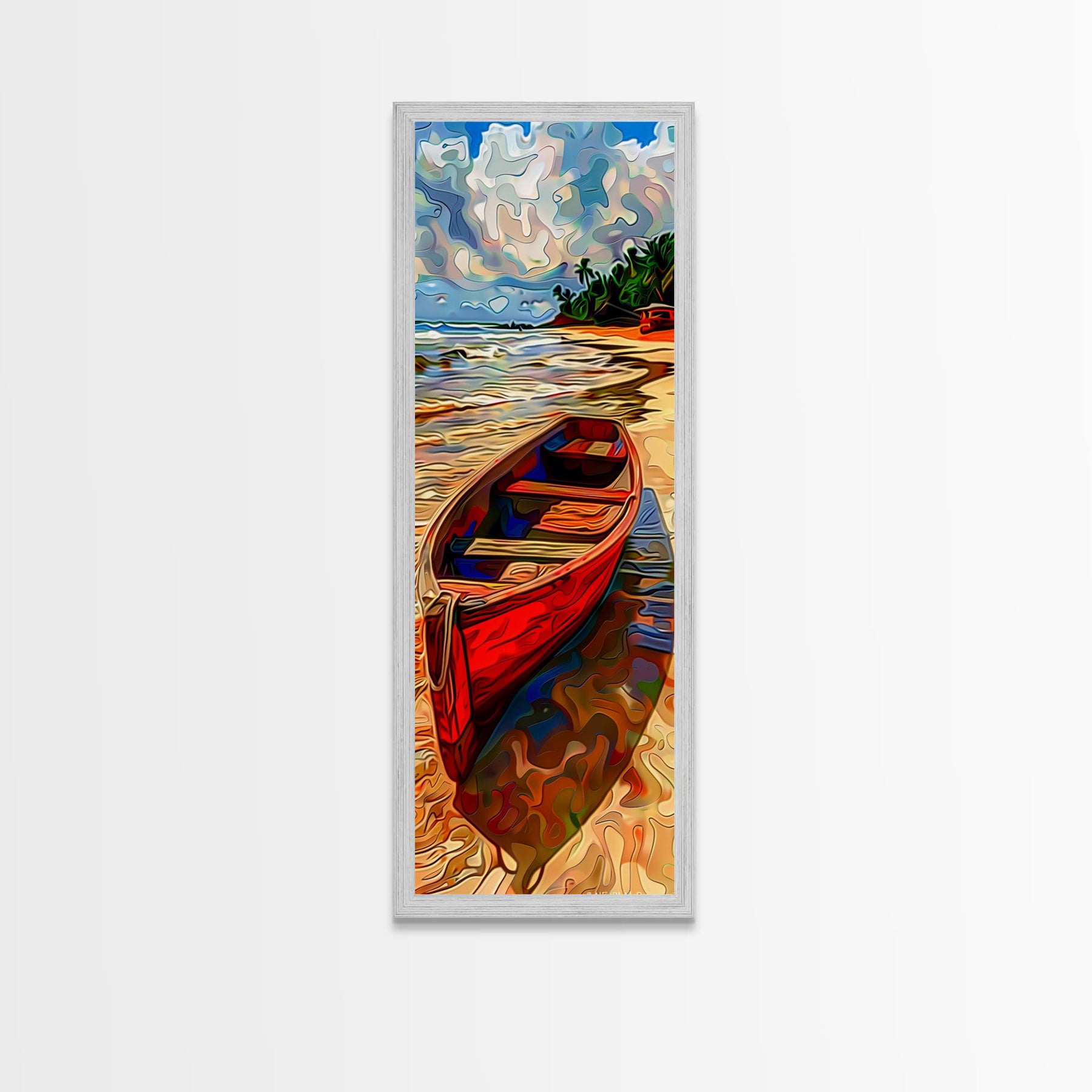 Stylized Red Boat on Tropical Beach - Framed Canvas Print, Midcentury Modern Wall Art, Skinny Art, Tall Art, Living Room Decor