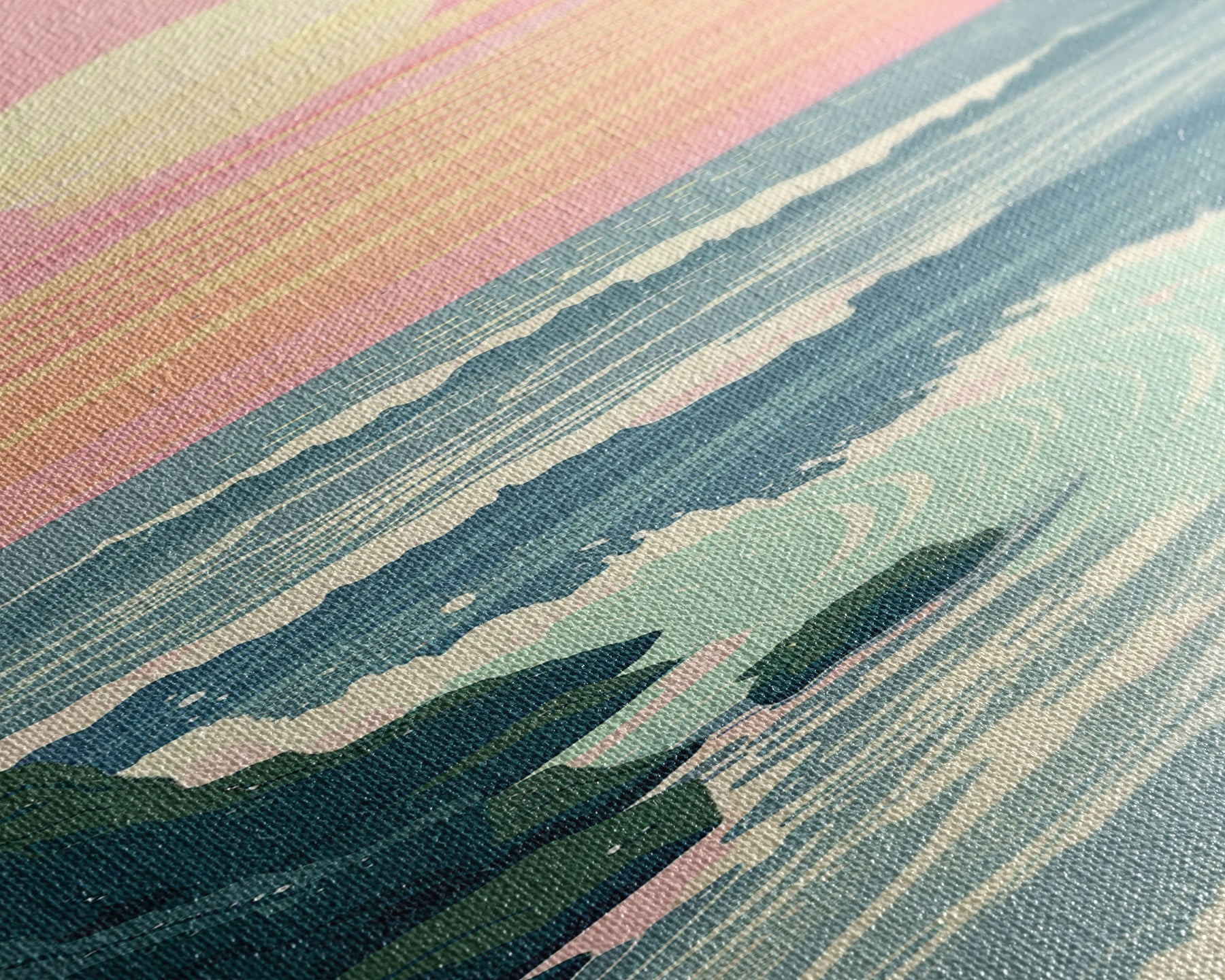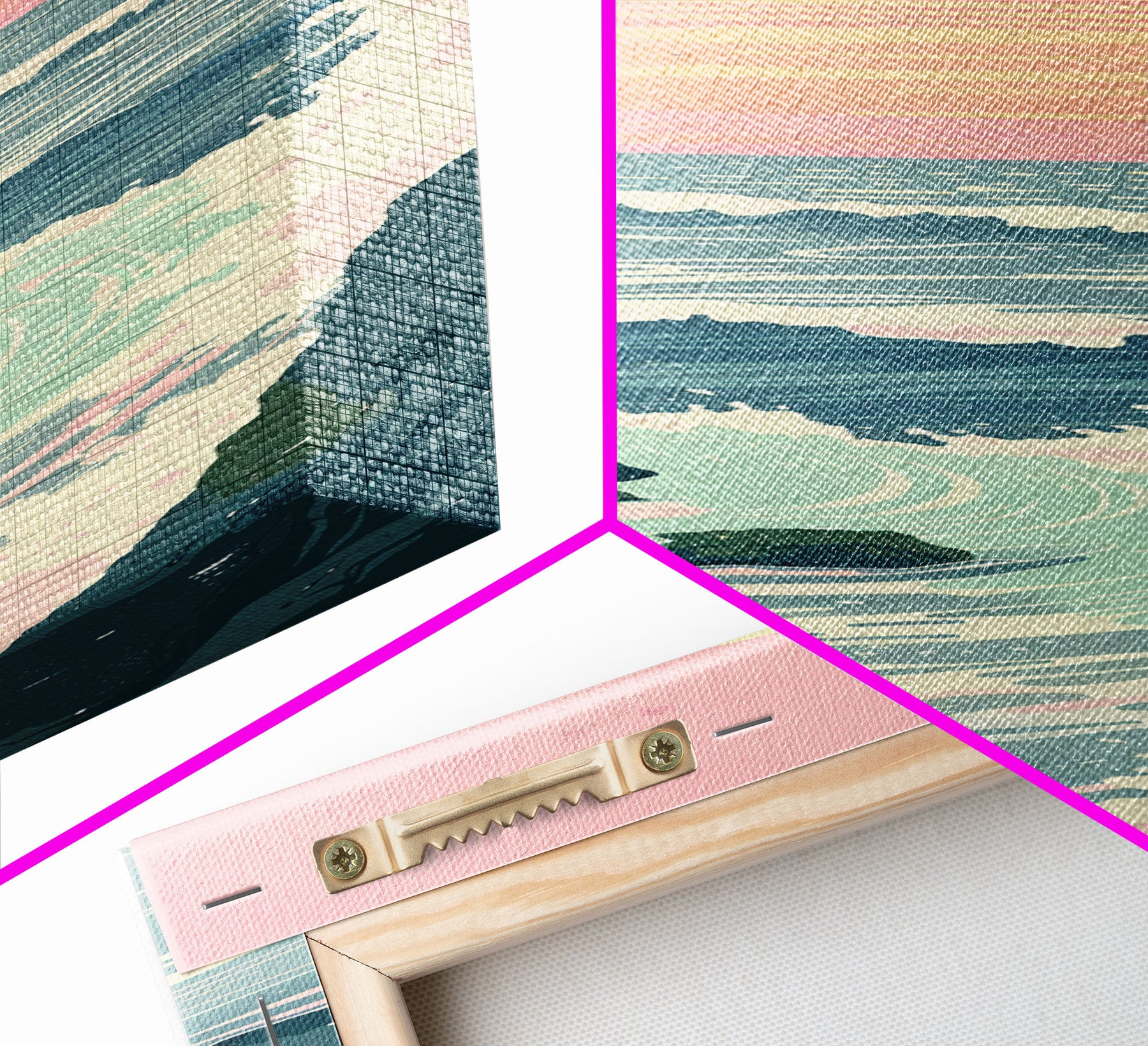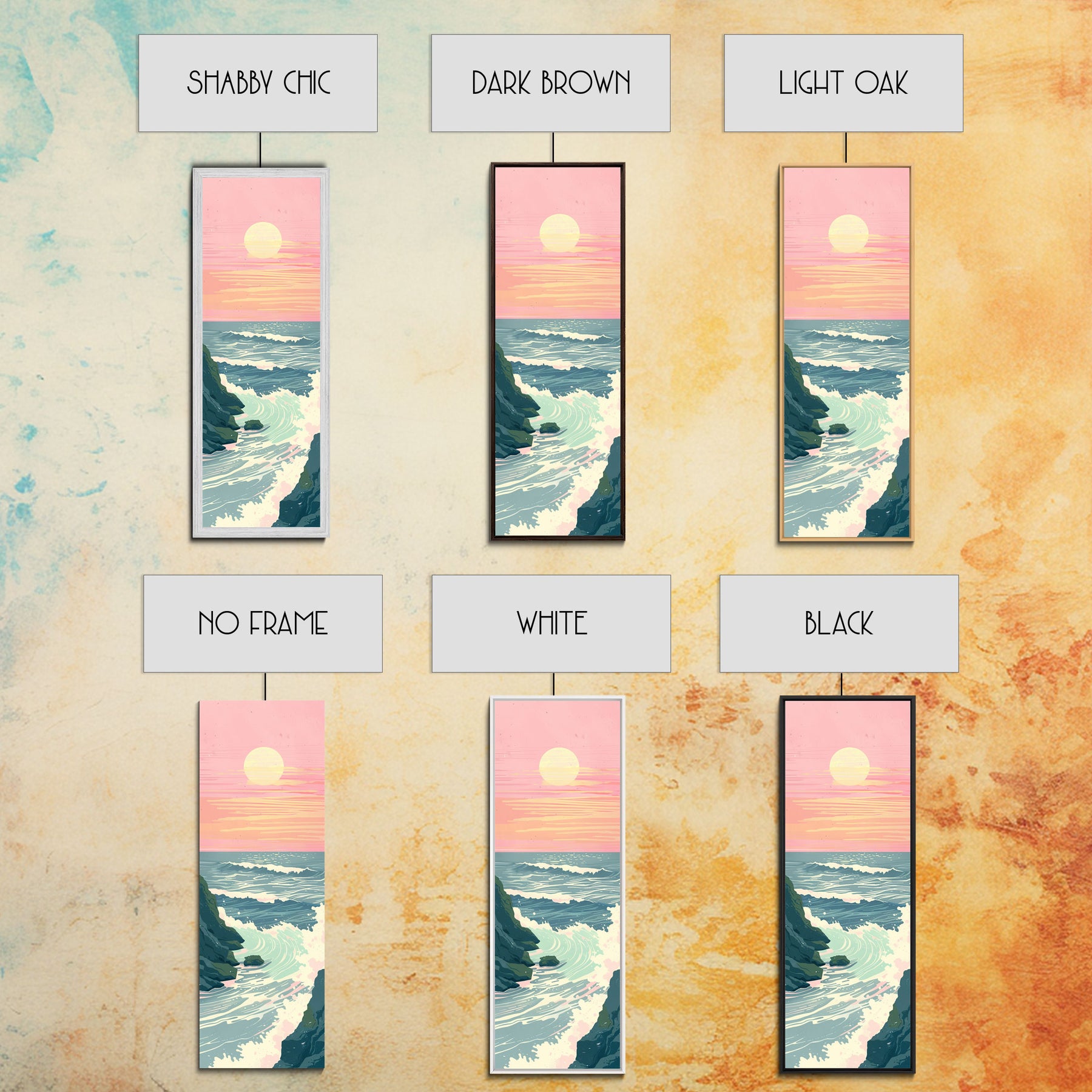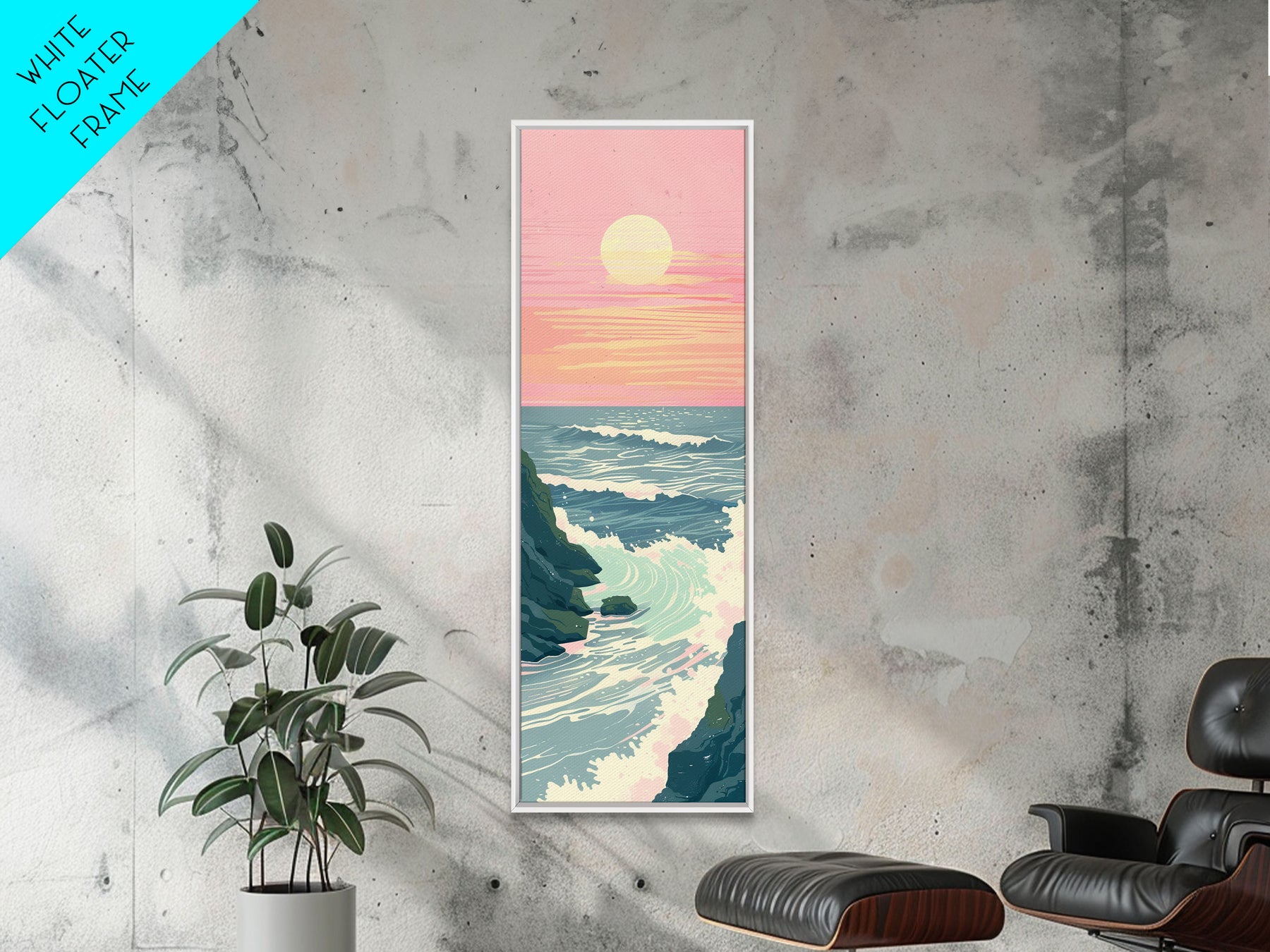Tranquil Ocean Sunset with Soft Waves Crashing against Rocky Shoreline - Skinny Art, Japanese Wall Decor, Framed Canvas Print, Ukiyo-e Style