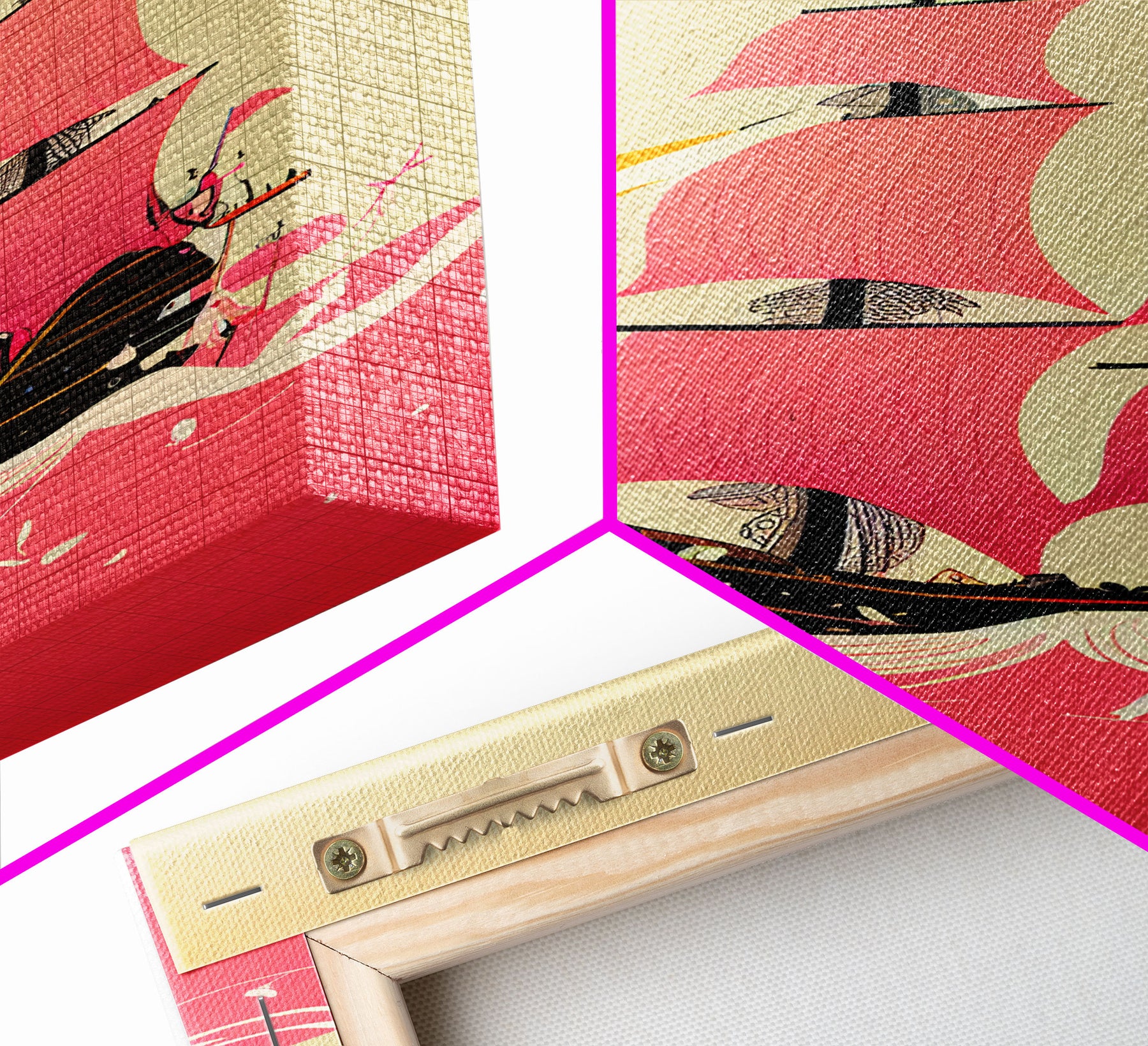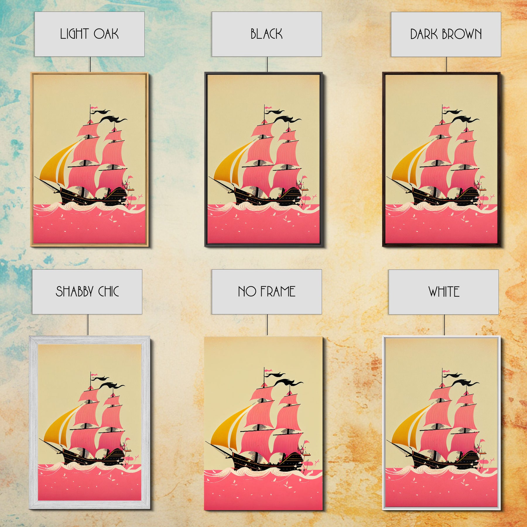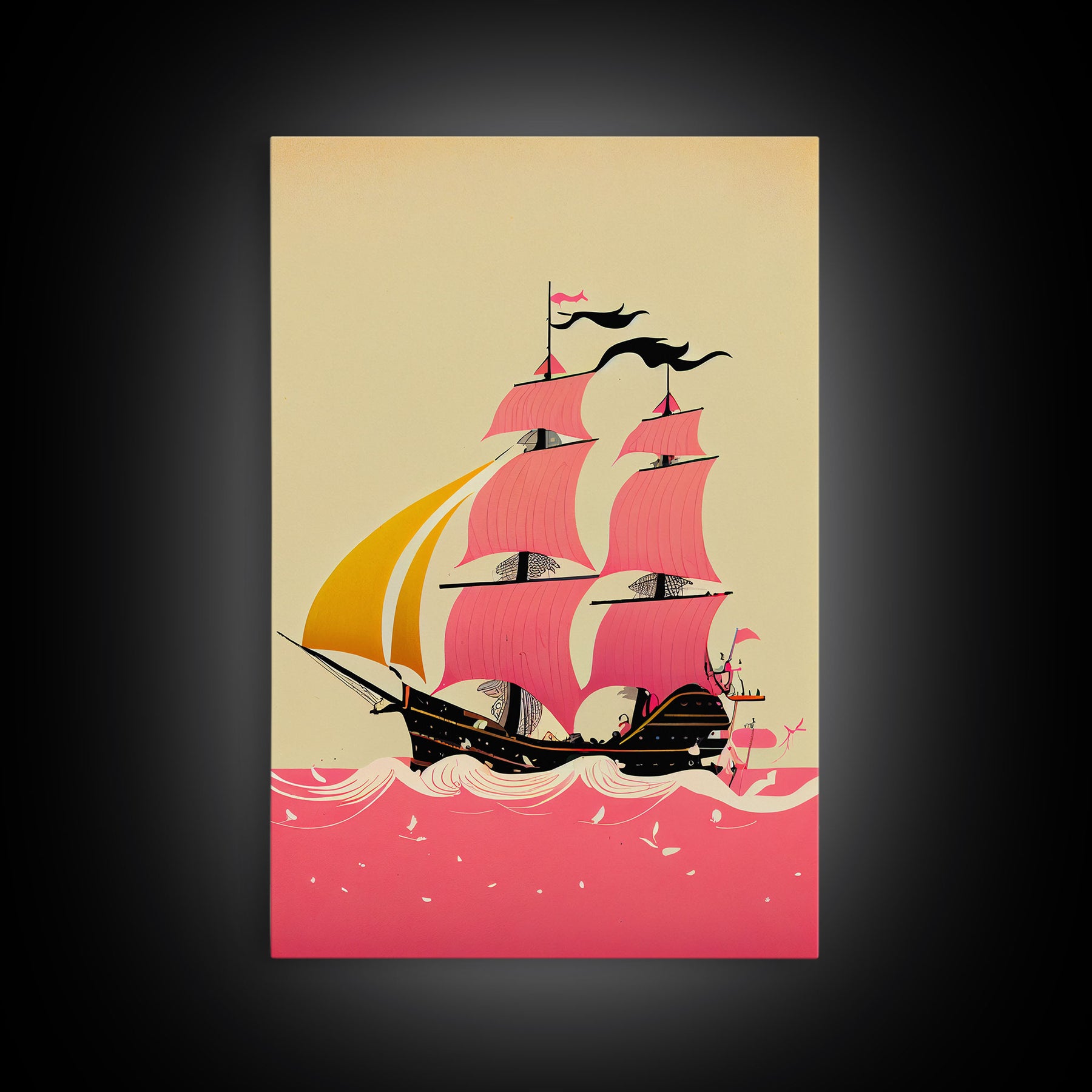 Vaporwave sail boat art, pink pirate ship, framed wall art, framed canvas print