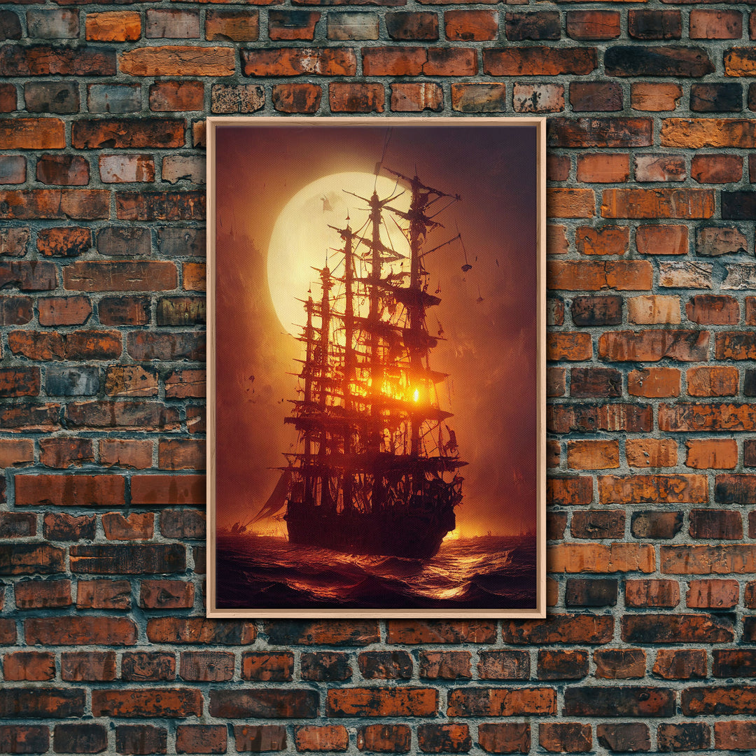 Ghost Ship and Full Moon, Spooky Pirate Ship Art, Framed Canvas Print, Ready To Hang Framed Wall Art, Living Room Wall Hanging
