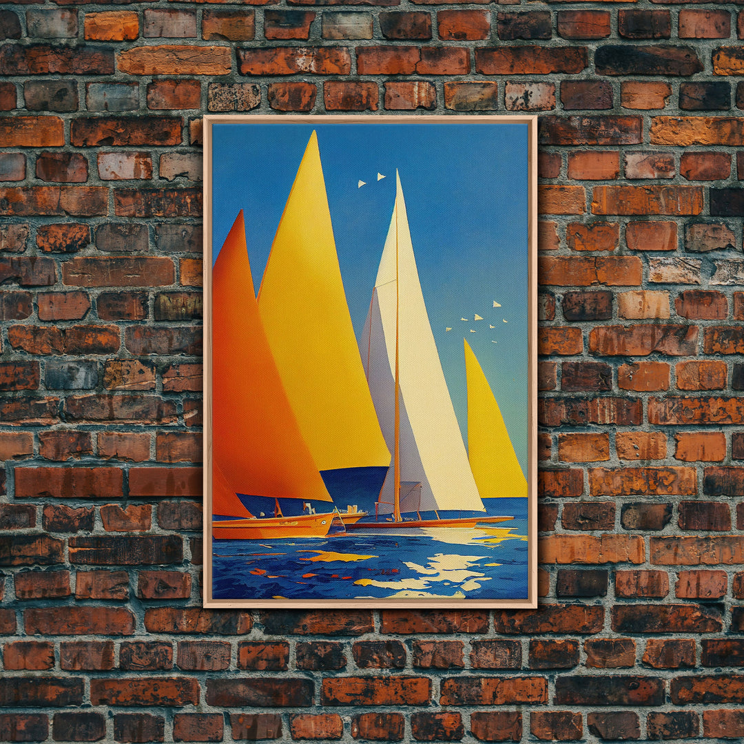 Golden Art Deco Sailboats in the Sun, Lakehouse Decor, Framed Canvas Print, Ready To Hang Framed Wall Art, Living Room Decor