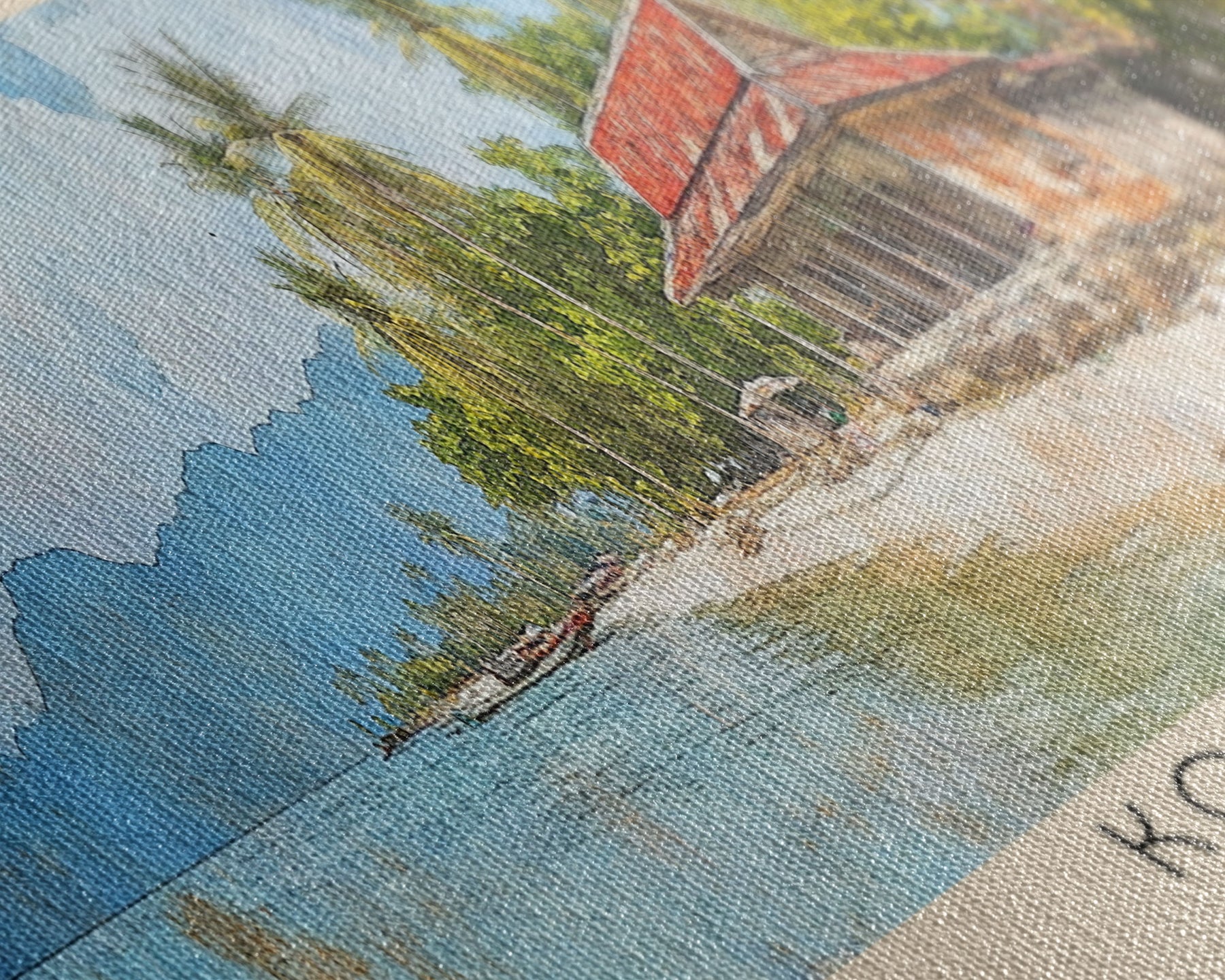 Most of our canvases are made in the USA, with the exception of canvases ordered with the light oak unstained frames, and any large canvases (24x48, 30x60, 16x48 and 20x60) ordered WITH a frame. These are temporarily made in and shipped from Europe, while we try to find a more consistent supplier in the USA.